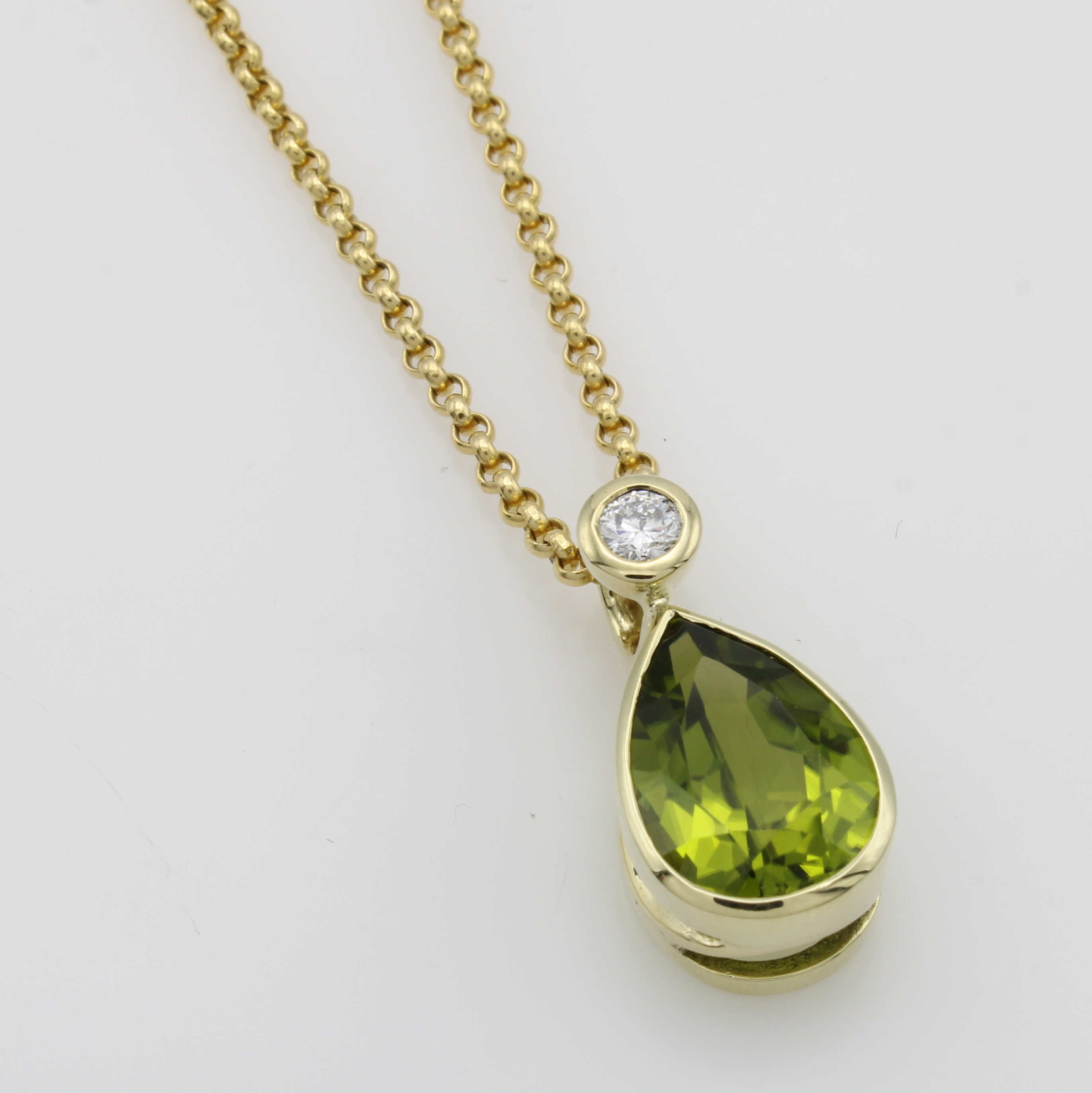 Anhänger mit Peridot und Brillanten an Kette, GG 585/000, Peridottropfen ca. 6.24 ct, Brill. ca. 0.18 ct feines Weiß/si, L. ca. 45.5 cm Schätzpreis: 5980, - EUR