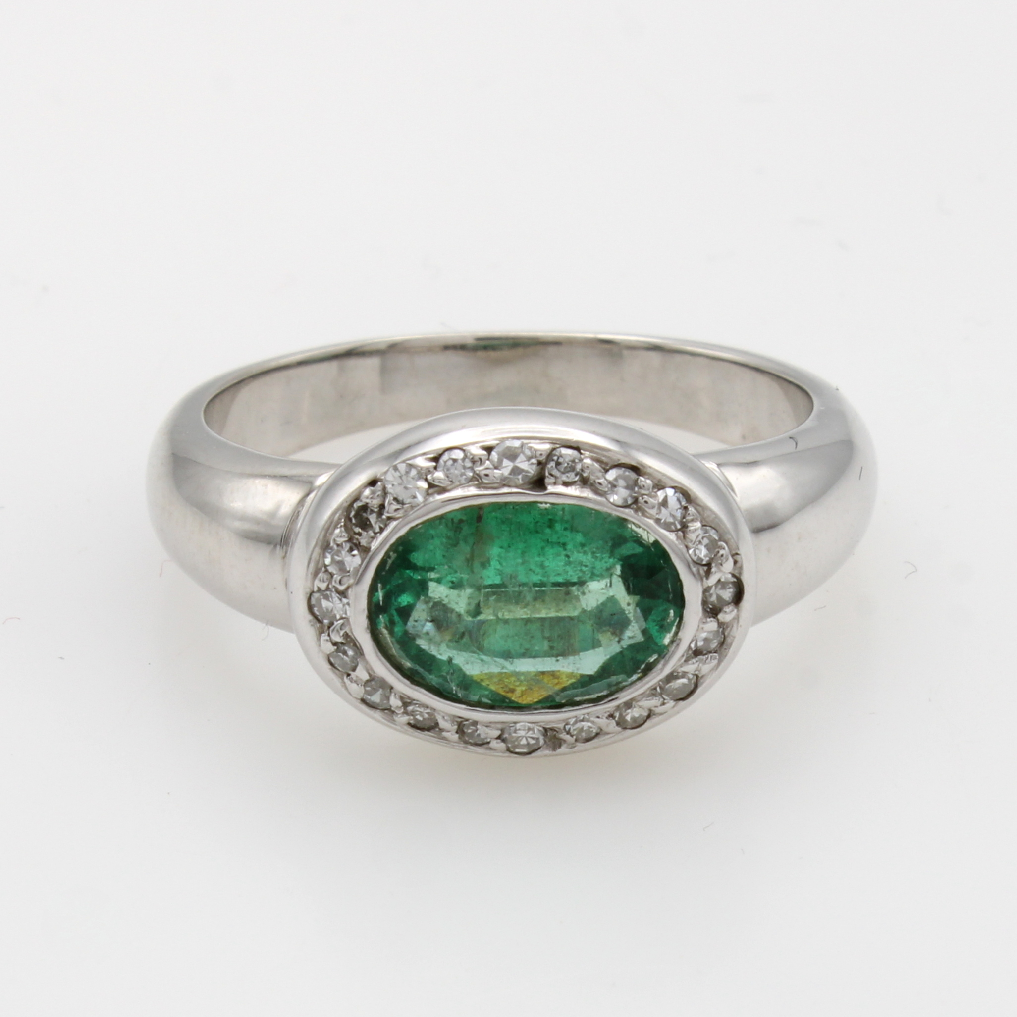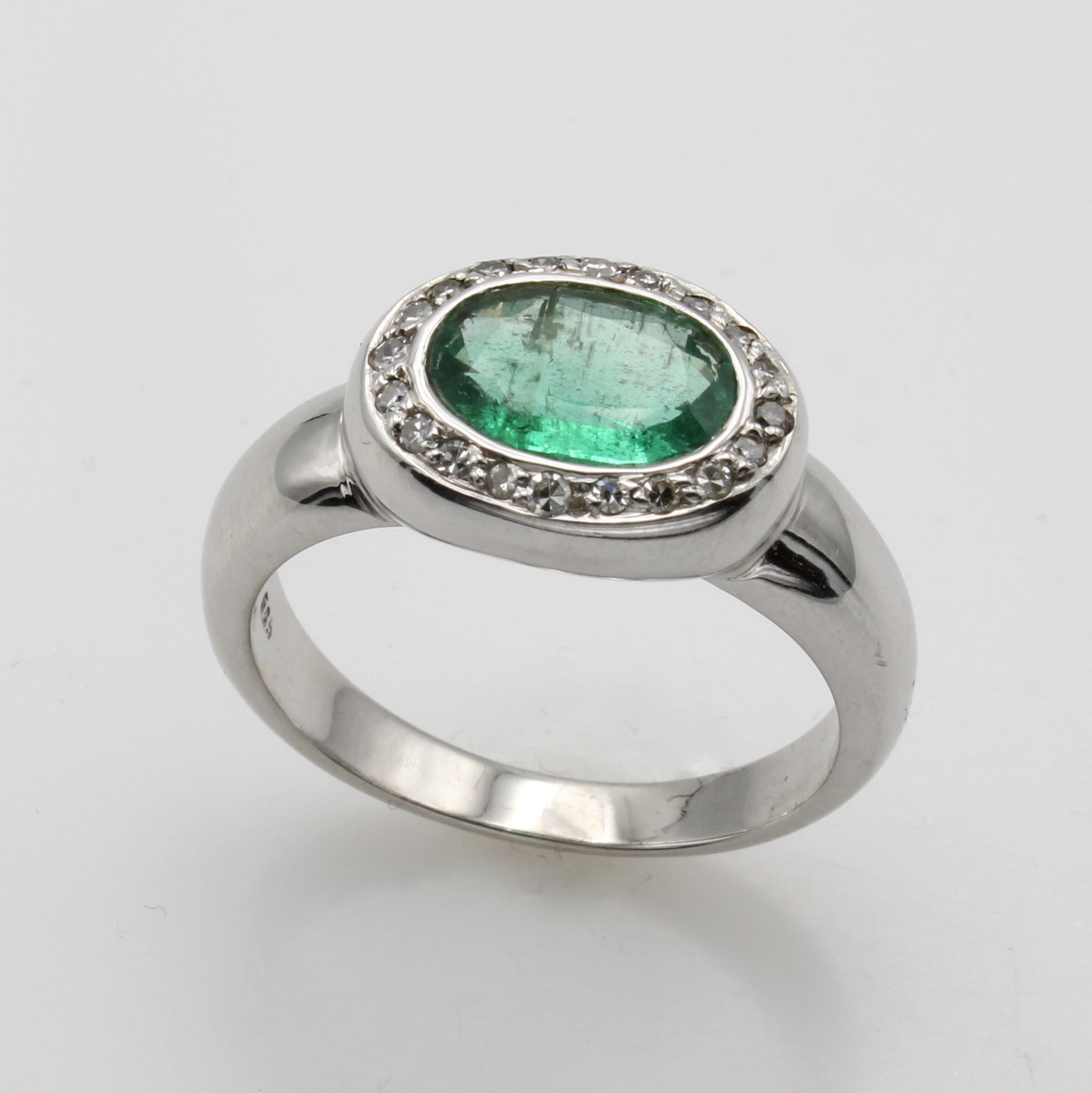 Ring mit Smaragd und Diamanten, WG 585/000, ovaler Smaragd ca. 1.38 ct umgeben v. Diam. zus. ca. 0.17 ct Weiß/p, RW ca. 59 Schätzpreis: 4350, - EUR