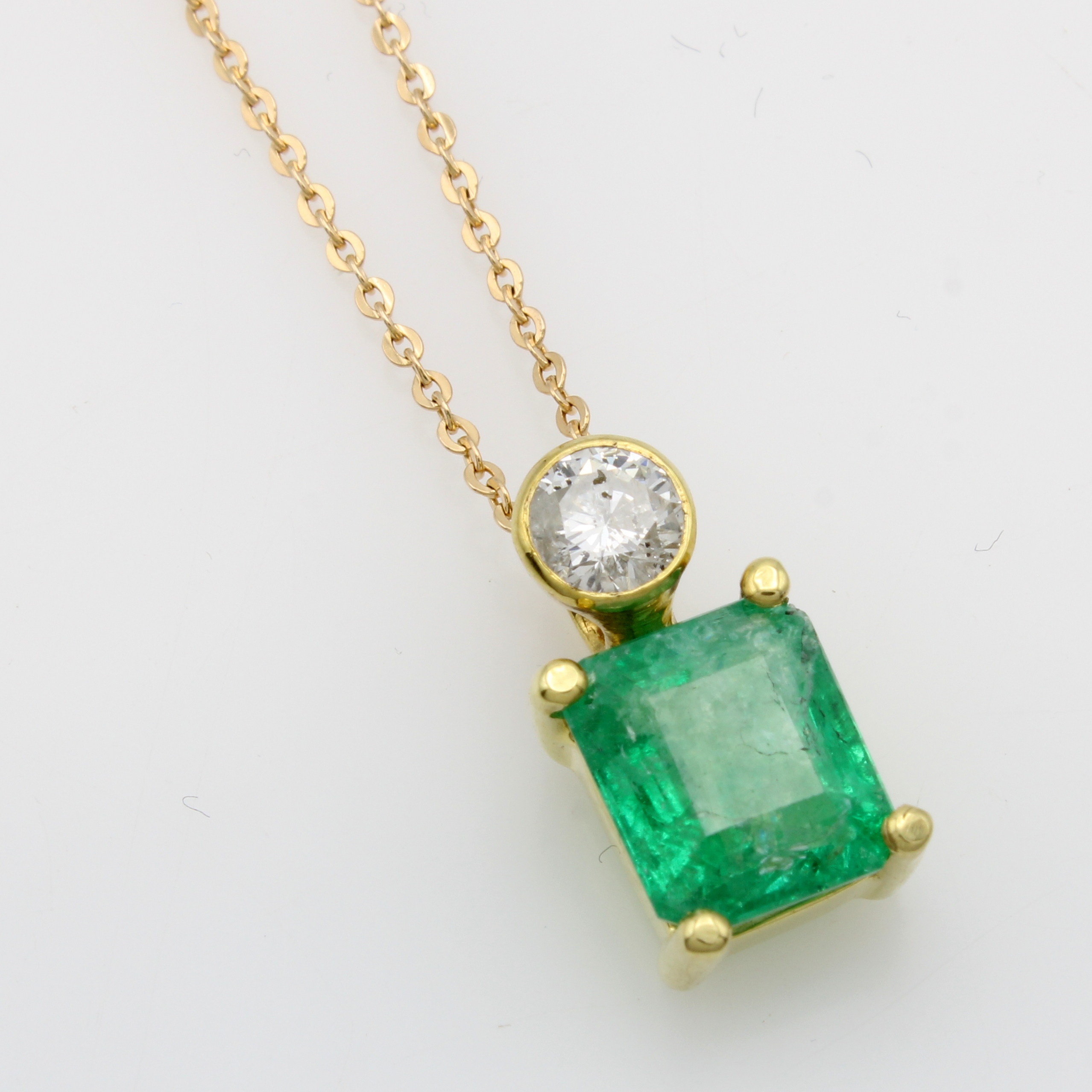 Anhänger mit Smaragd und Brillant an Kette, GG 585/000, Smaragd in Krappenfassung ca. 3.14 ct, Brill. in Zargenfassung ca. 0.44 ct Weiß/p, L. ca. 40.5 cm Schätzpreis: 4790, - EUR