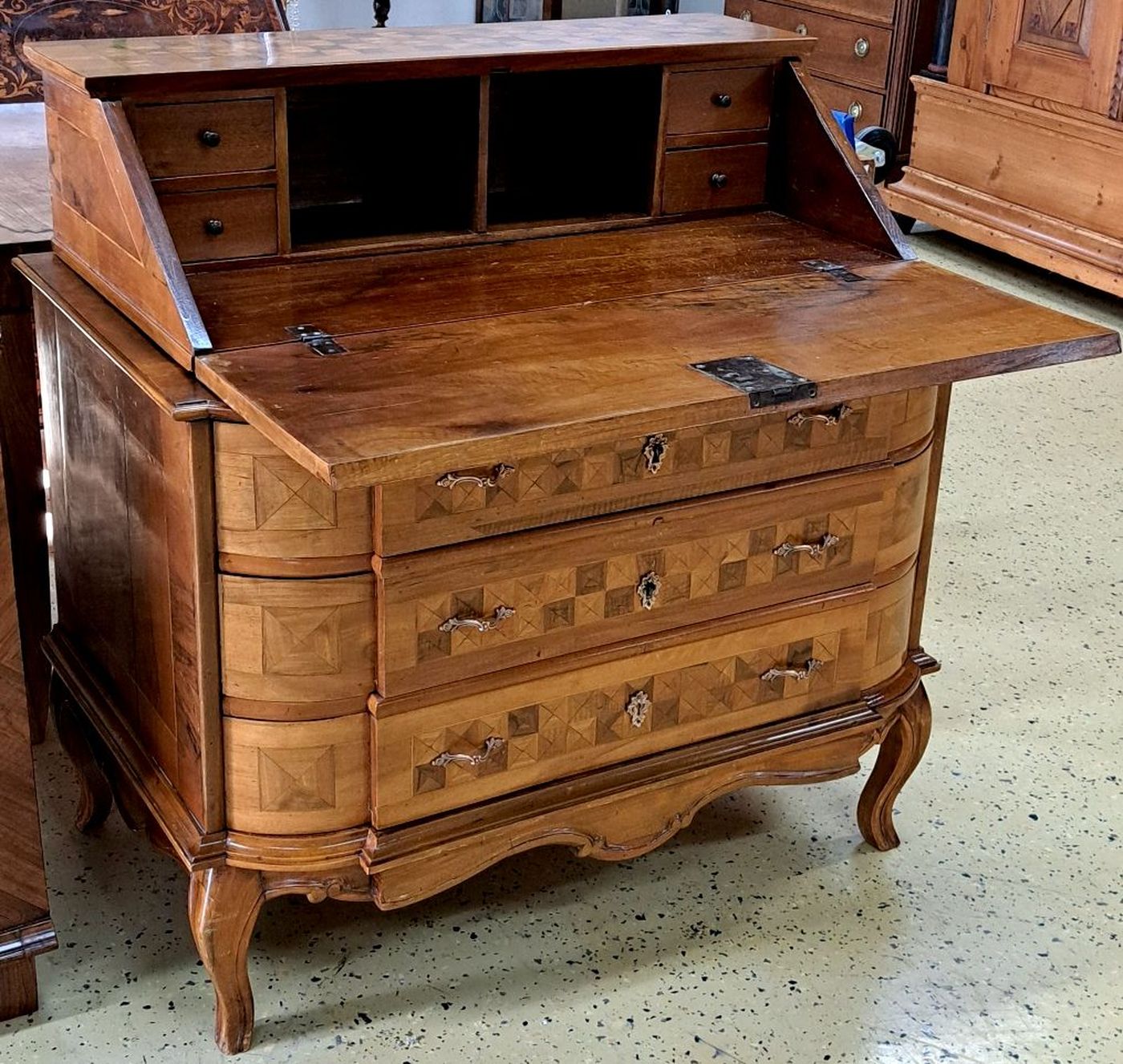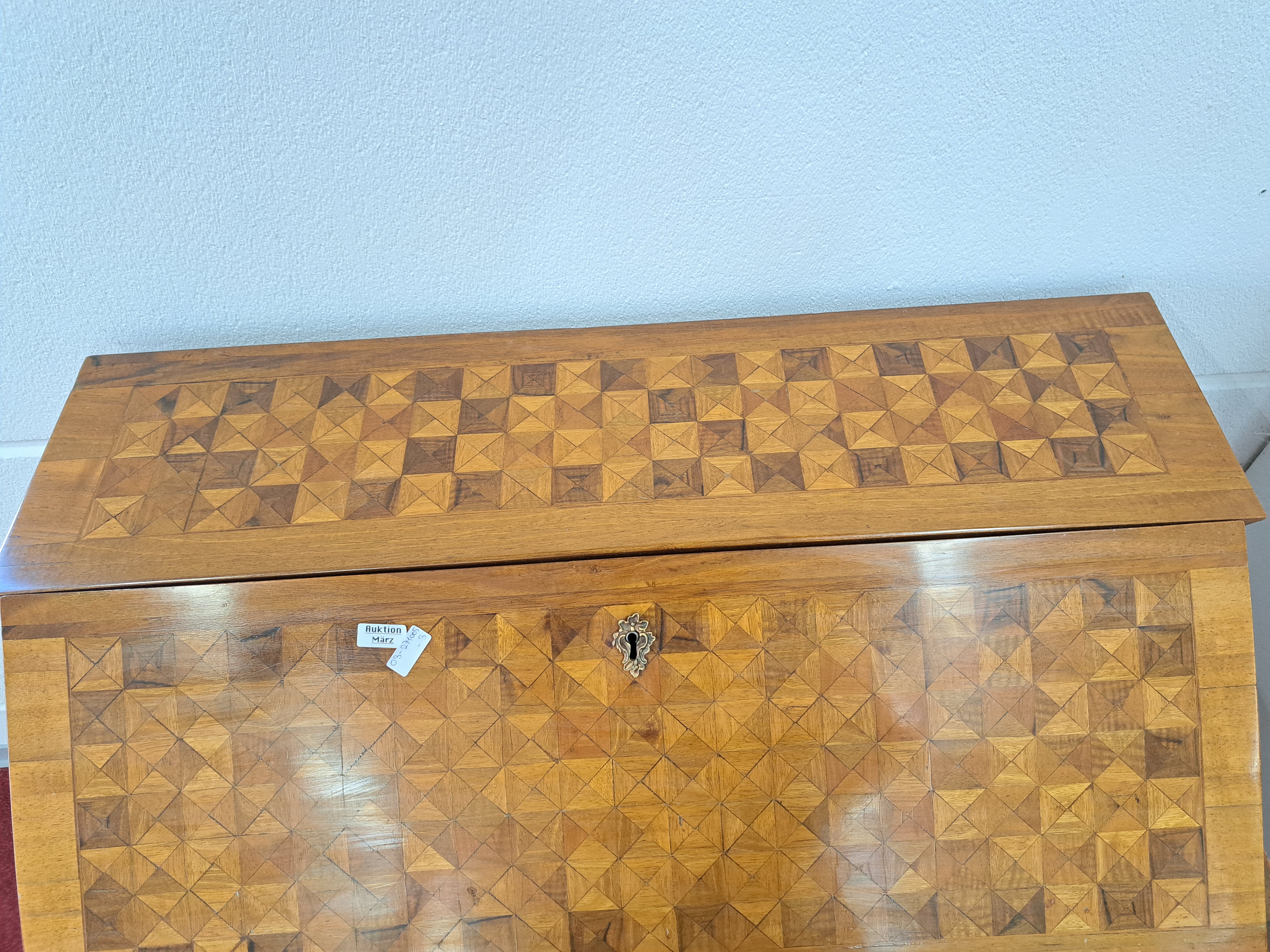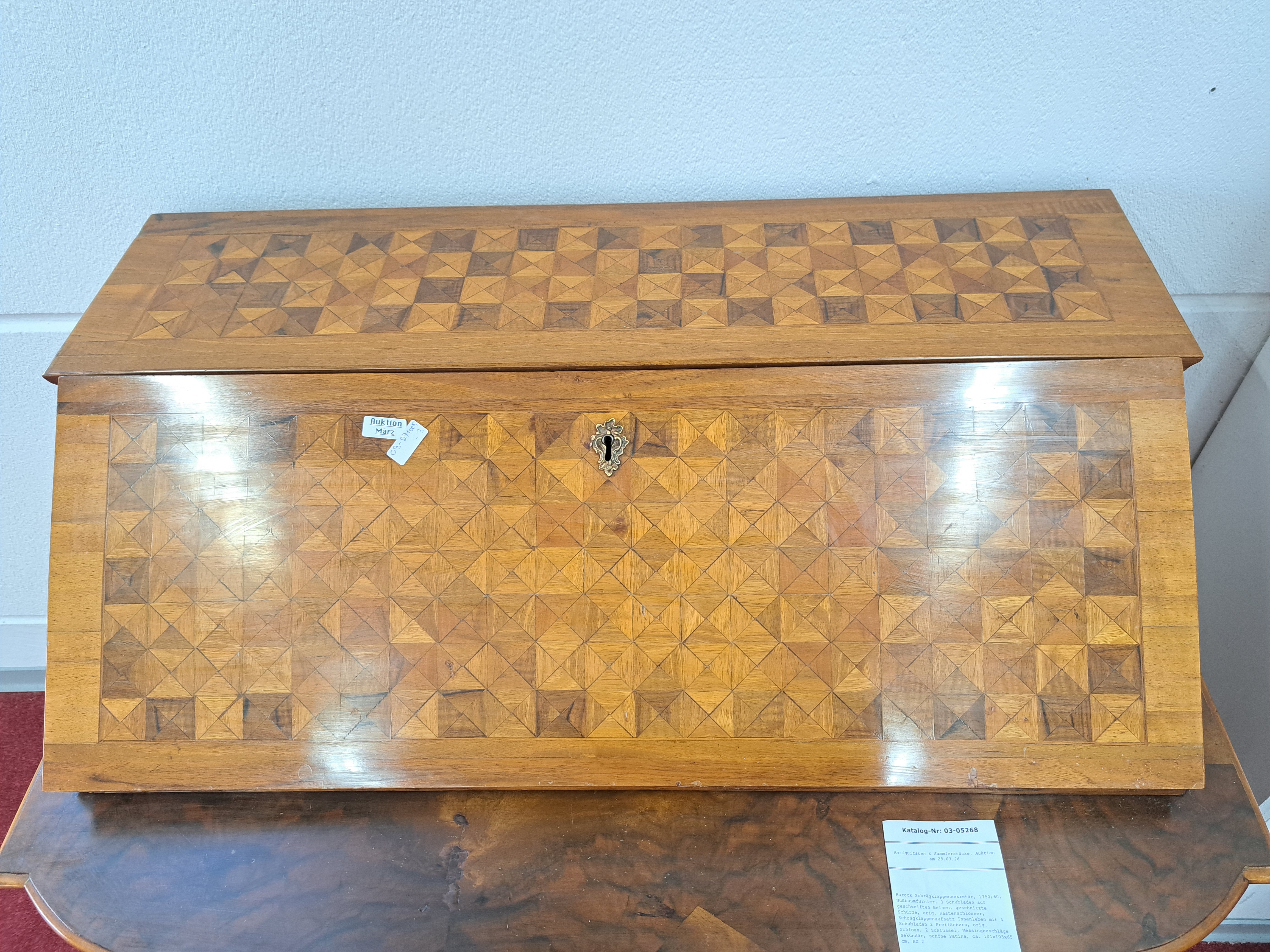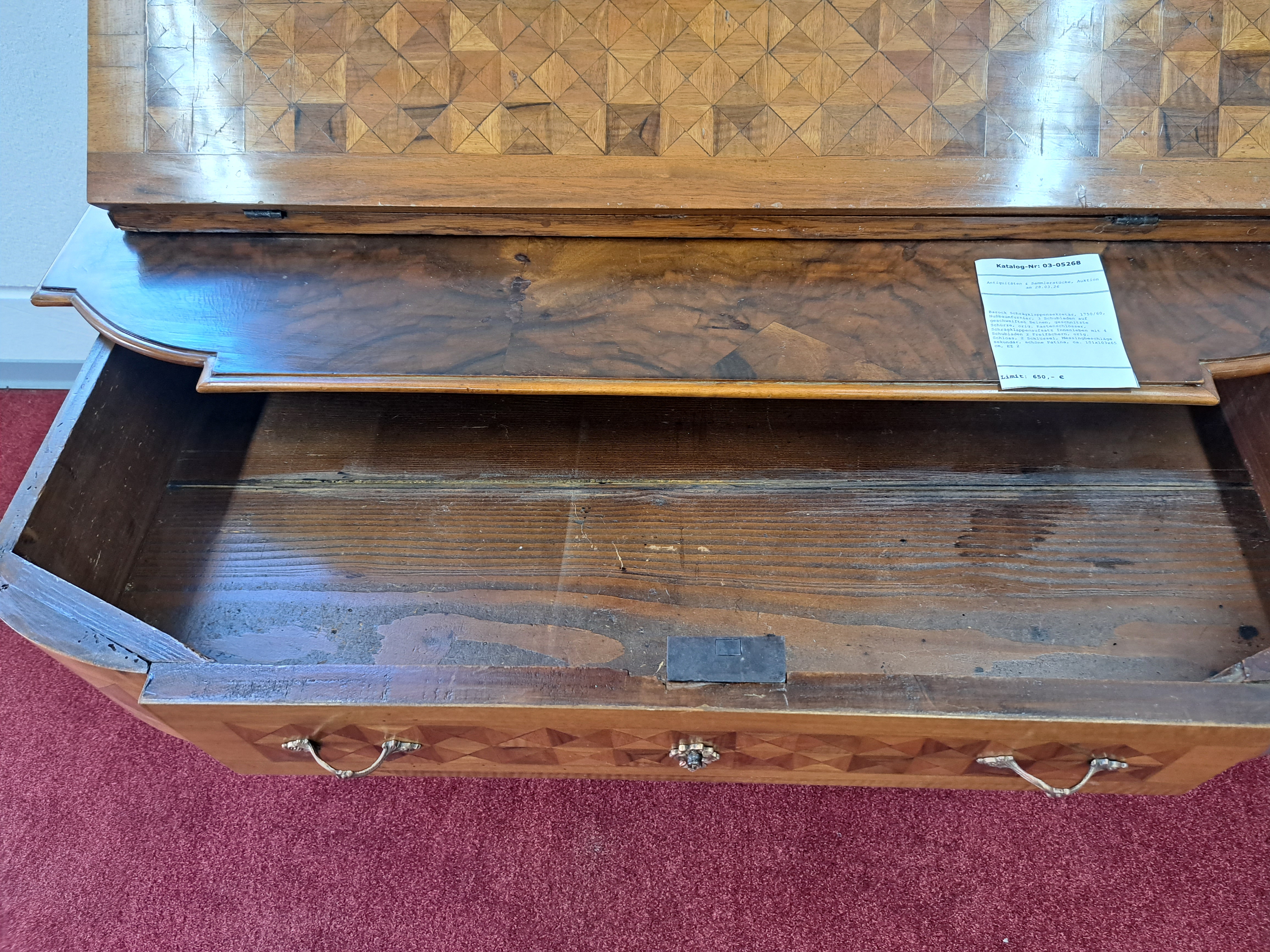 Beinen, geschnitzte Schürze, orig. Kastenschlösser, Schrägklappenaufsatz Innenleben