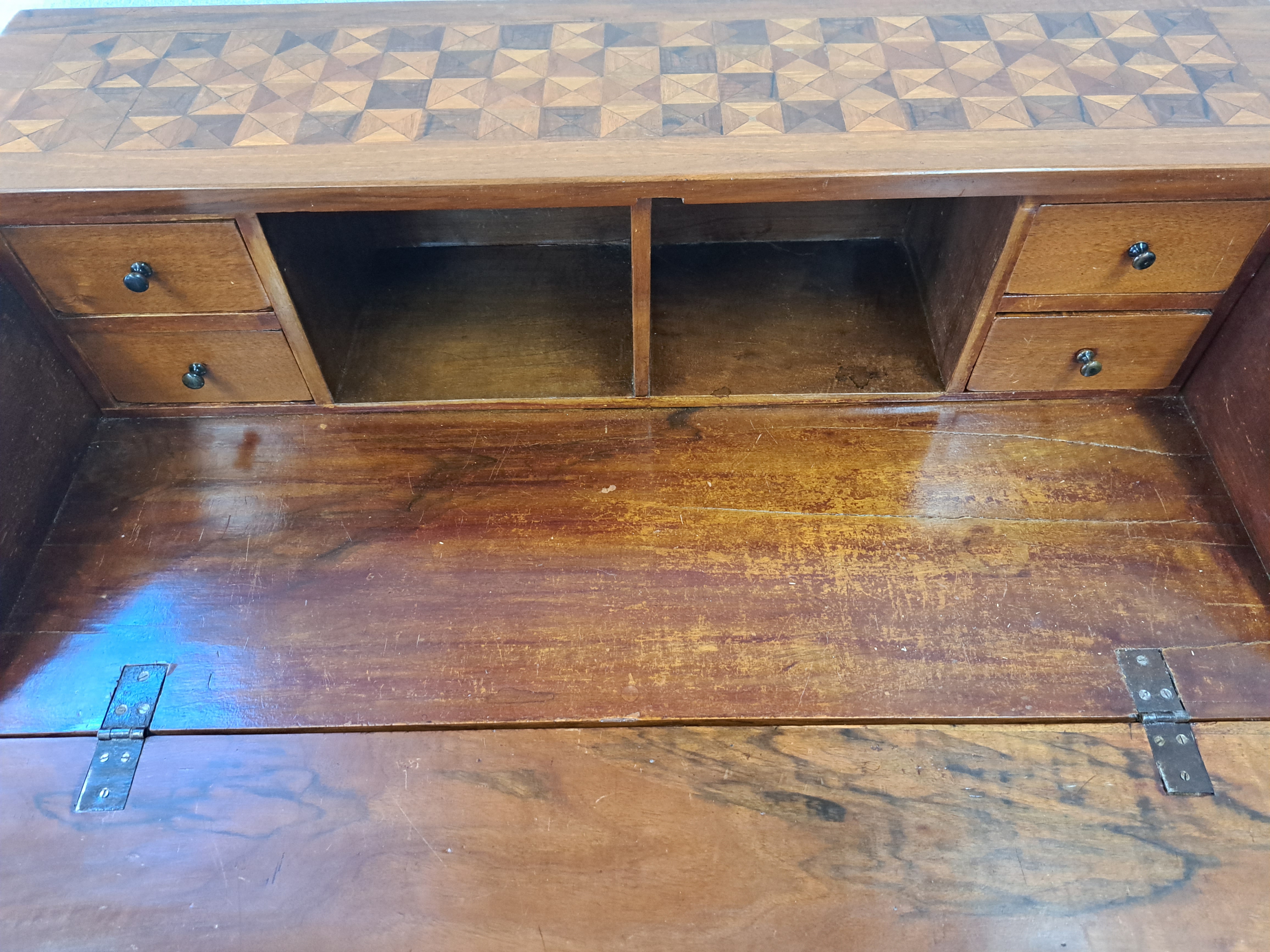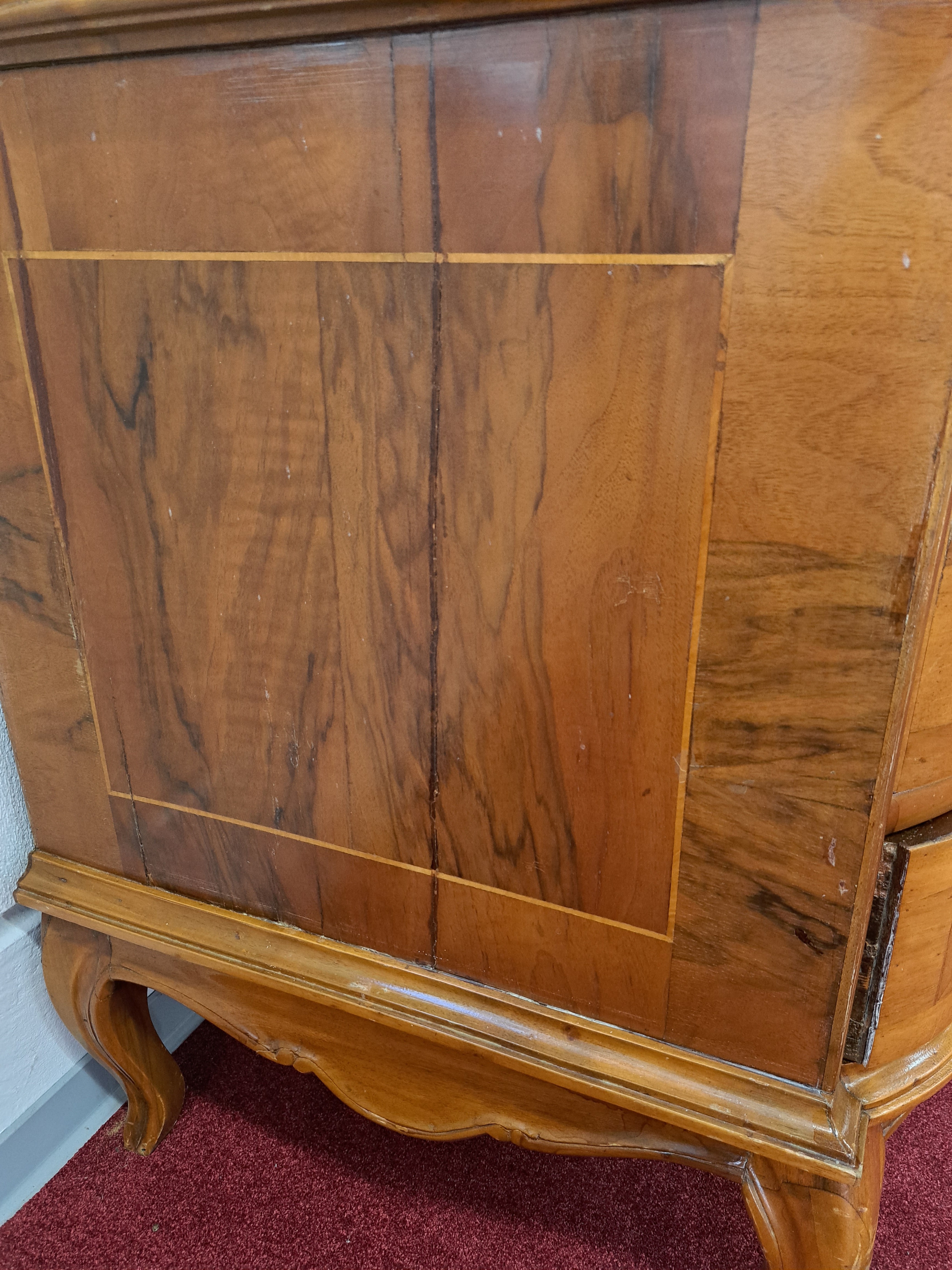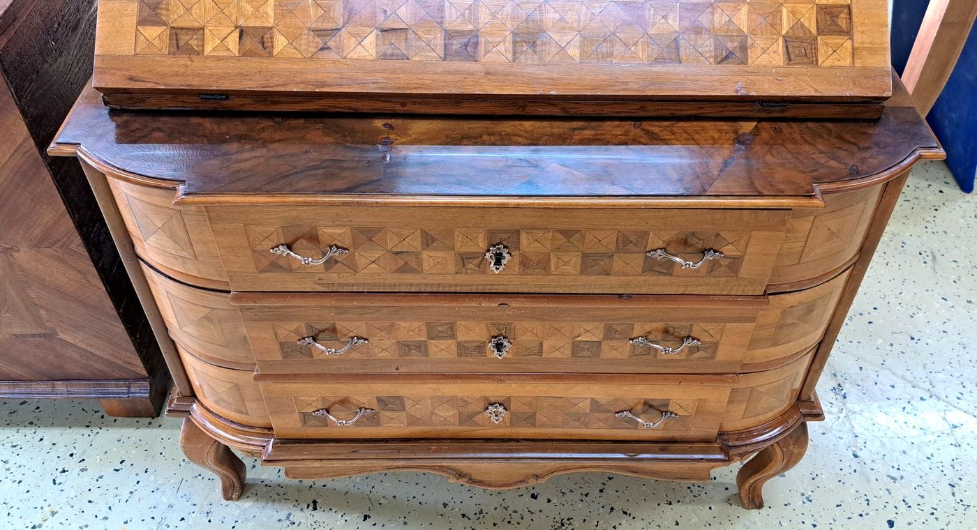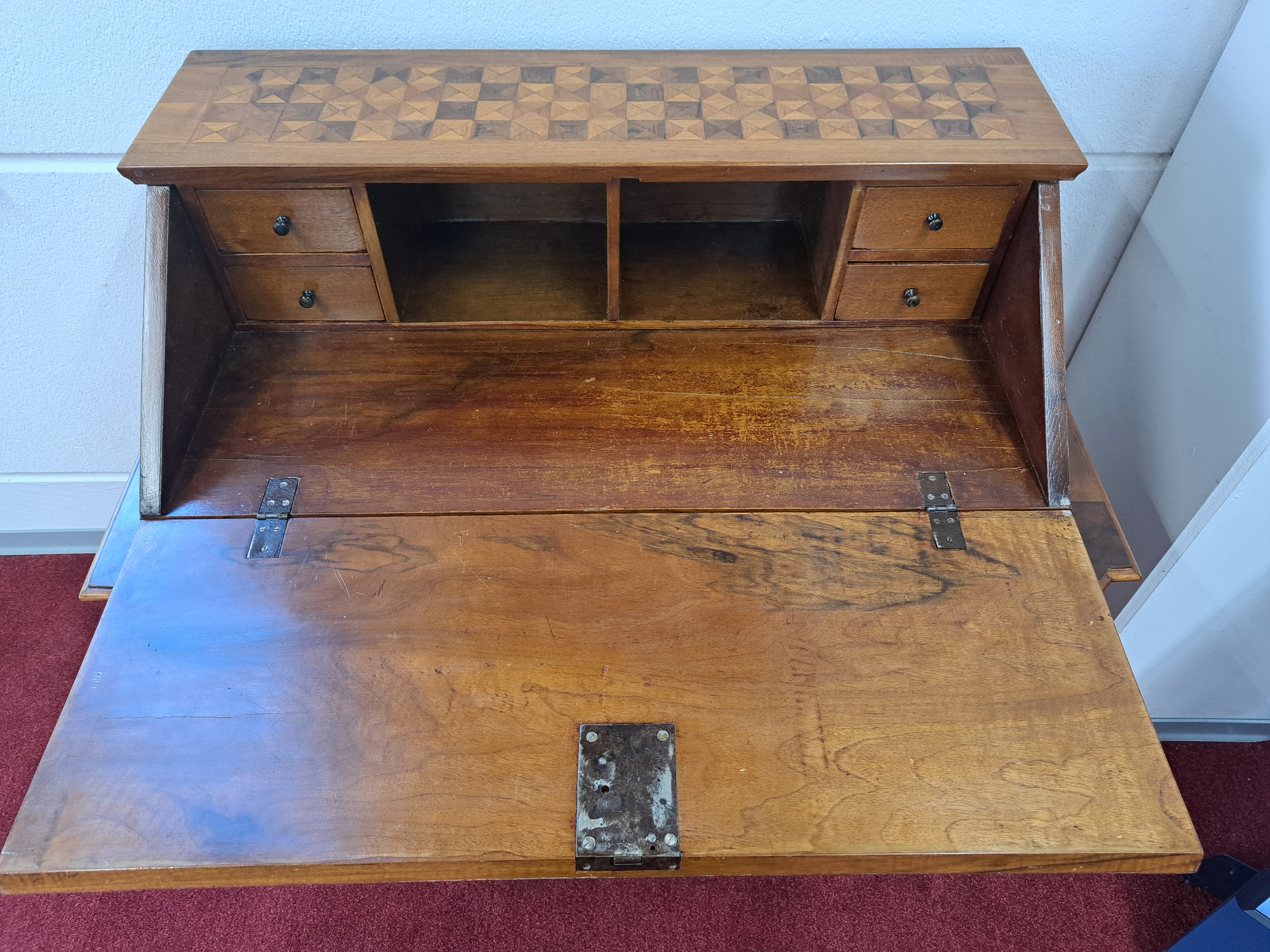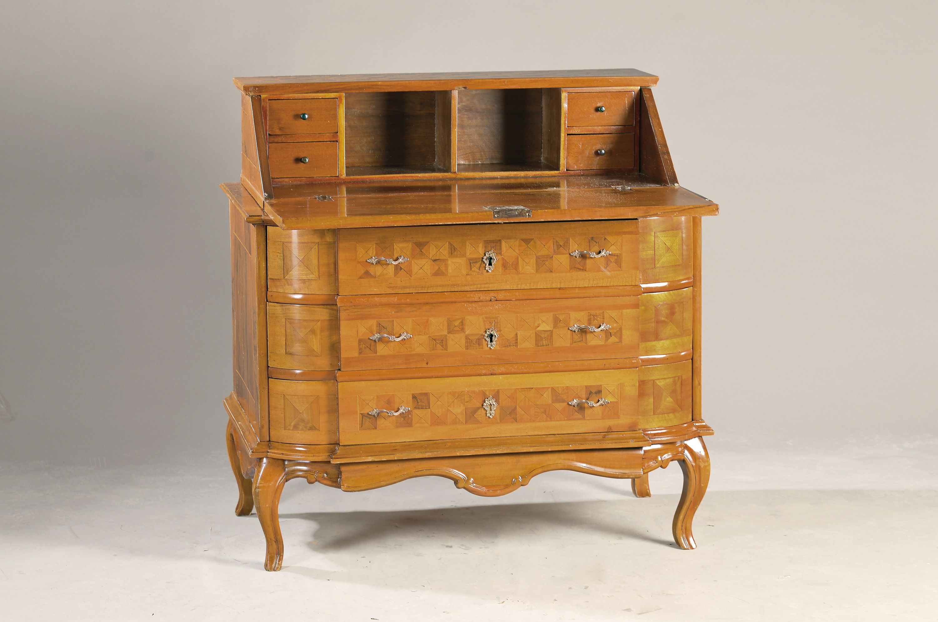 Beinen, geschnitzte Schürze, orig. Kastenschlösser, Schrägklappenaufsatz Innenleben