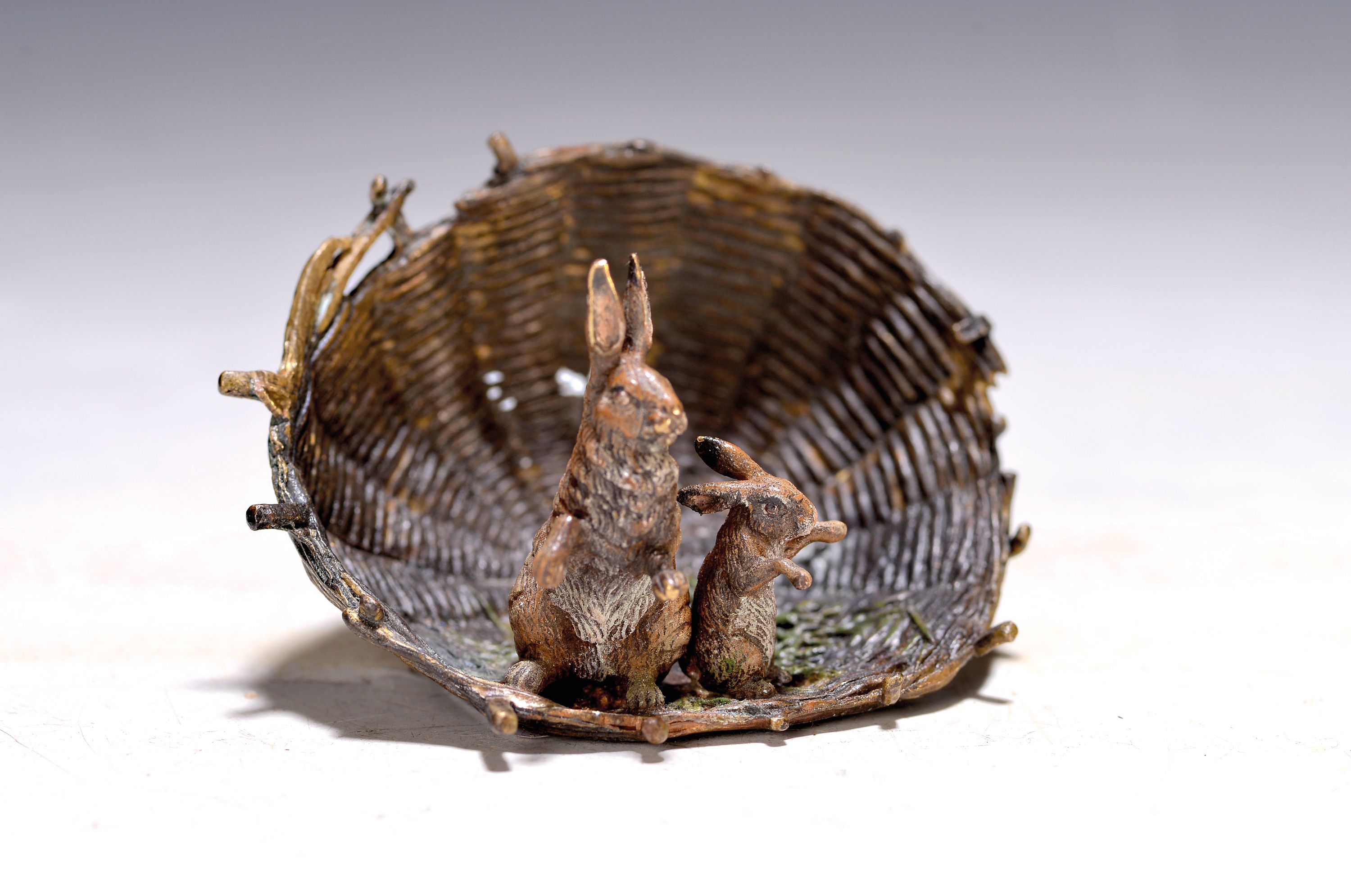 Zwei Hasen im Korb, Wiener Bronze, sign. Bermann, bunt staffiert, ca. 4x6.5 cm