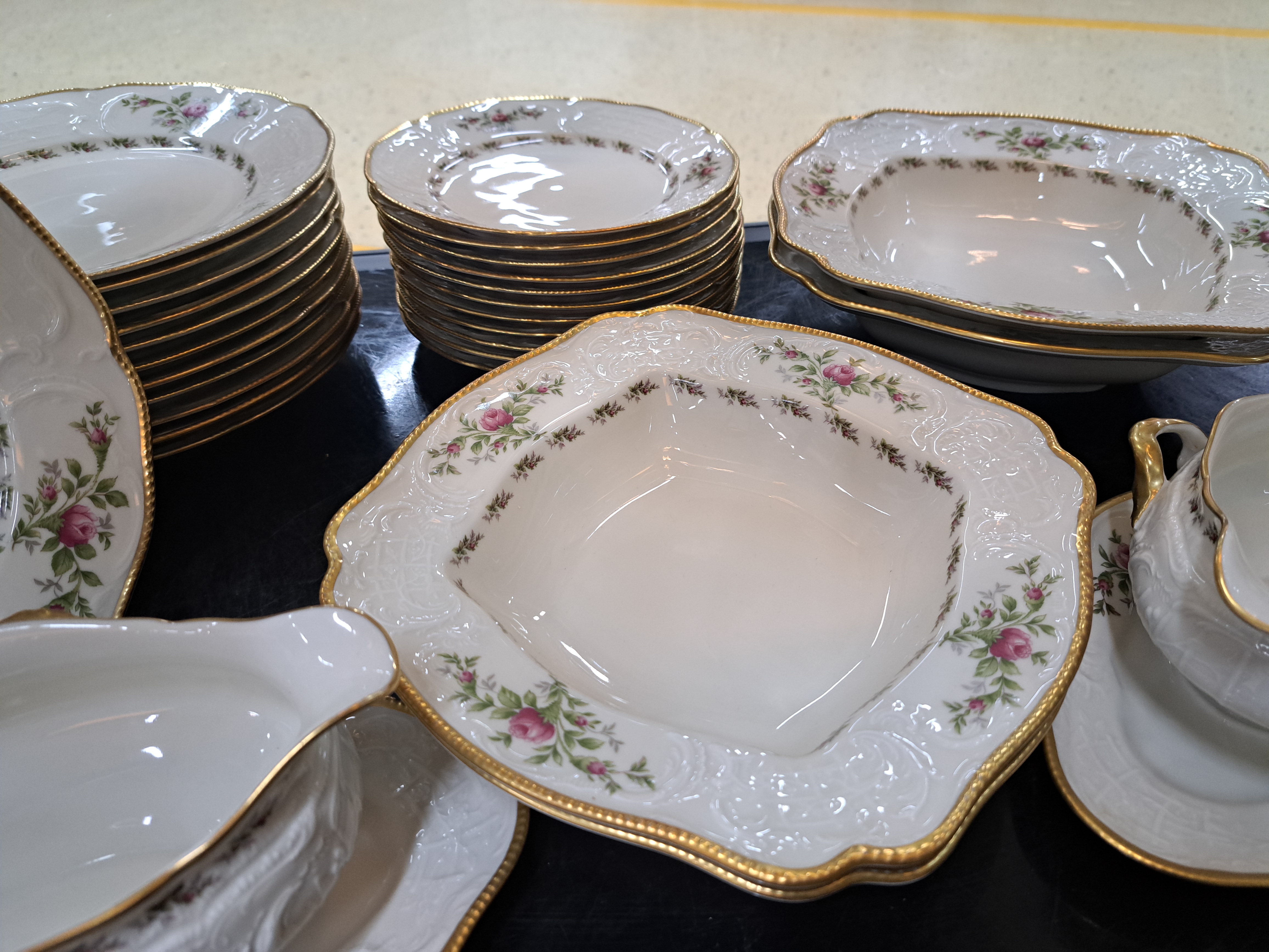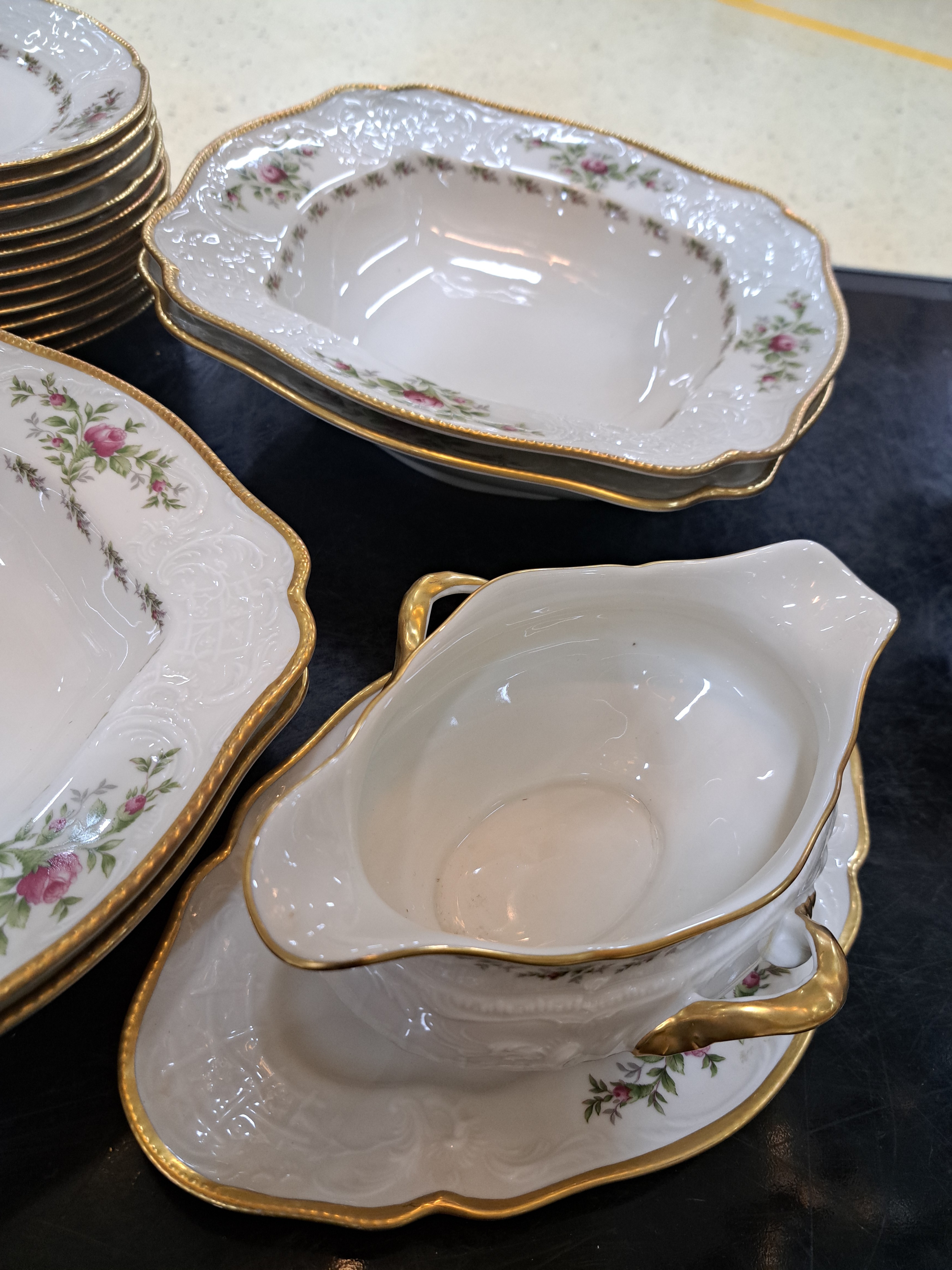 12 flache Speiseteller, 4 eckige Beilagenschüsseln, 2 Saucieren, 2 Kerzenleuchter,