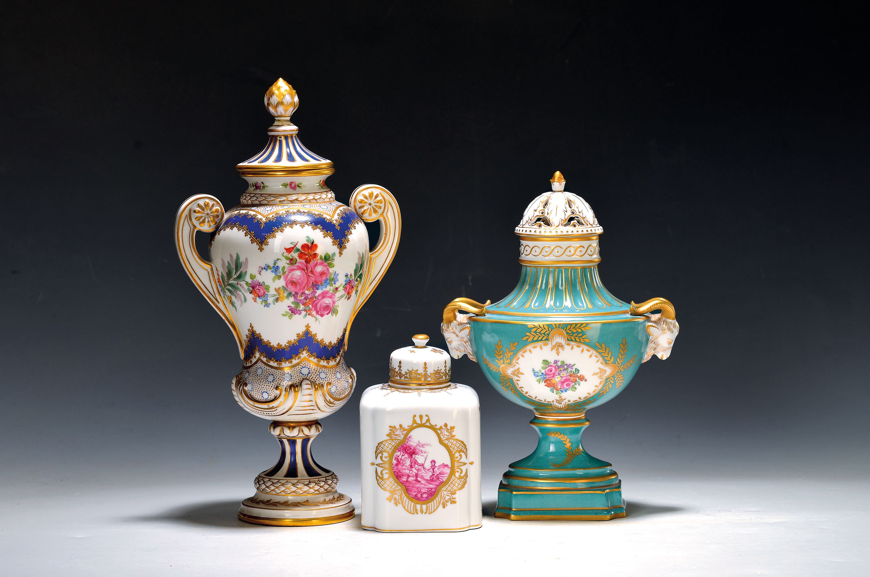 Drei Porzellanstücke, Dresden, 20. Jh., Potschappel, Carl-Johann Gottlob Thieme Nachfolge, Teedose, purpurfarbene Bemalung, Goldstaffage, H. ca. 14 cm, Deckelvase/ Duftvase, türkisfarbener Fond, von Bocksköpfen flankiert, Deckel in Durchbrucharbeit, Goldstaffage, beidseitige Blumenbukettmalerei, H. ca. 26 cm, B. 17 cm, Deckelvase, mit reicher Goldstaffage, partiell blau abgesetzt, beidseitige Blumenbemalung, Deckel am Knopf besch. bzw. alt restauriert, H. ca. 32.5 cm