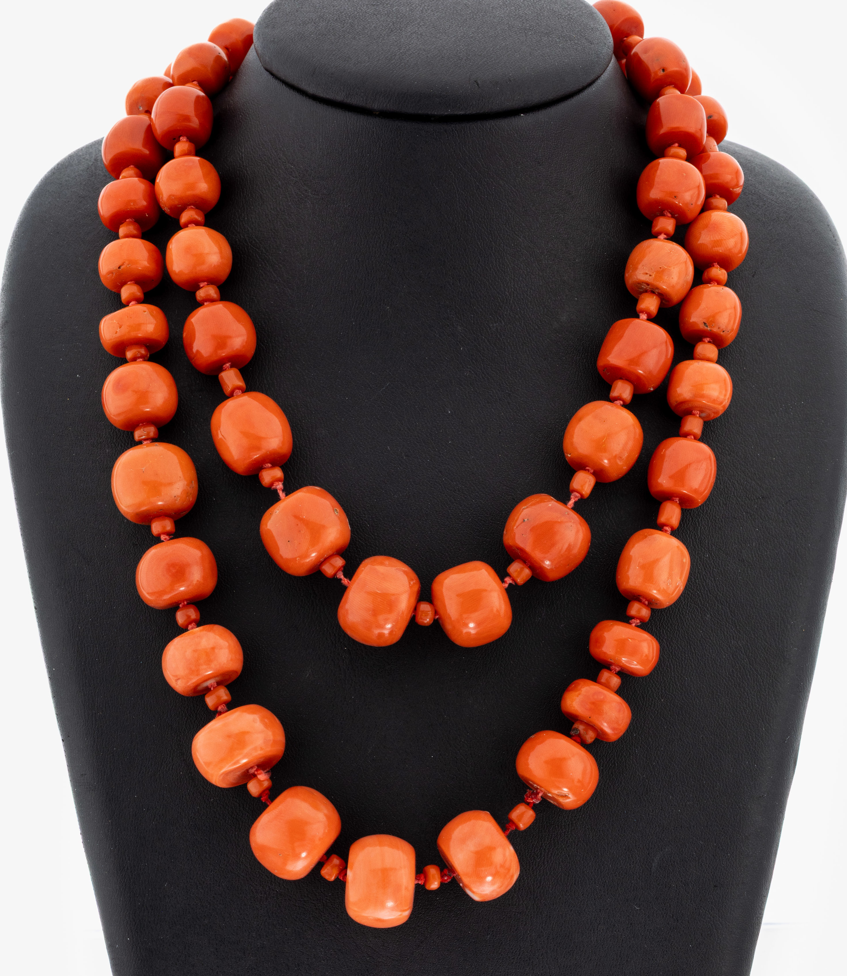Korallen-Collier mit 14 kt Gold Kugelschließe, GG 585/000, 2-rhg., Korallen-Tonnen
