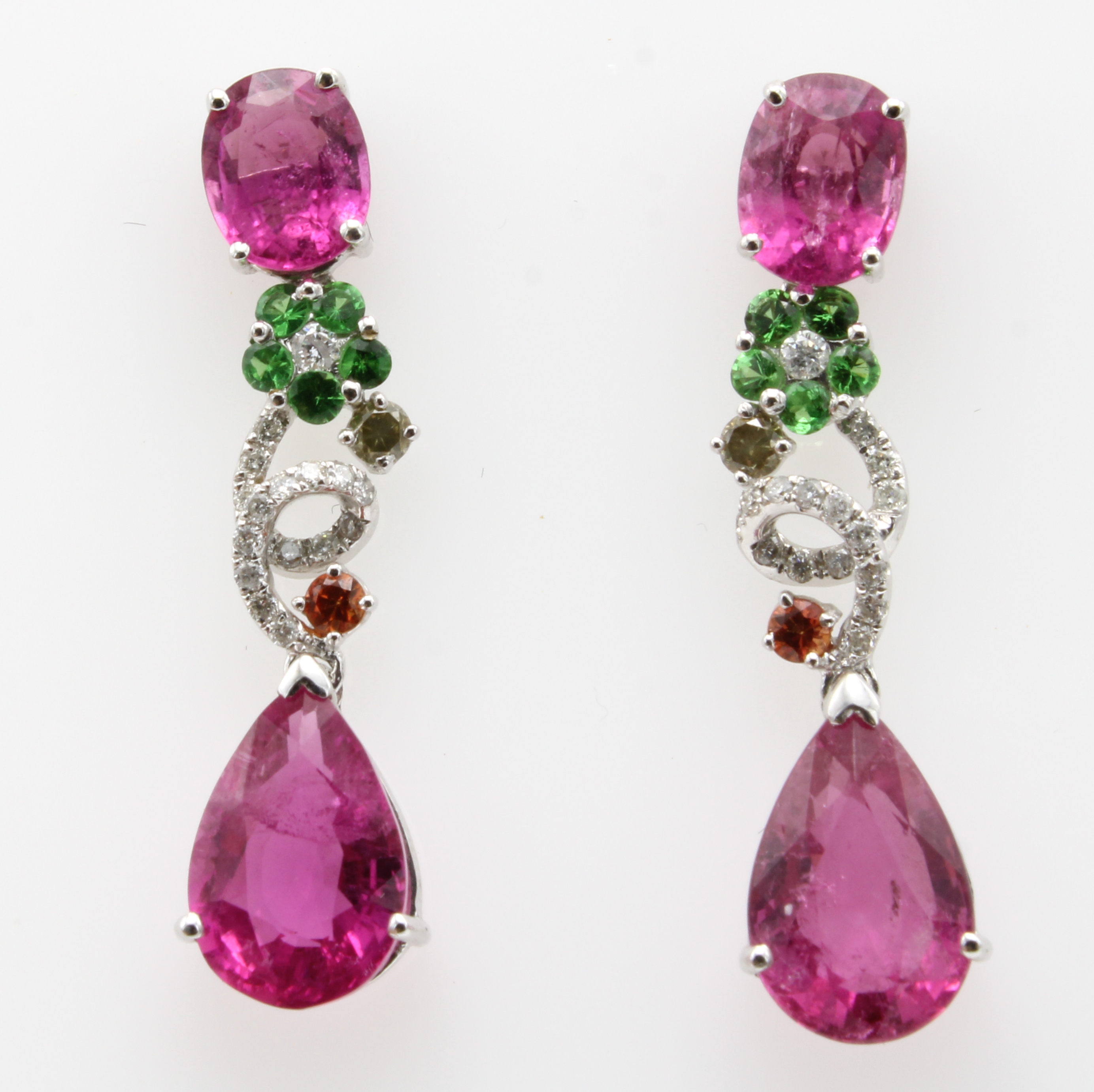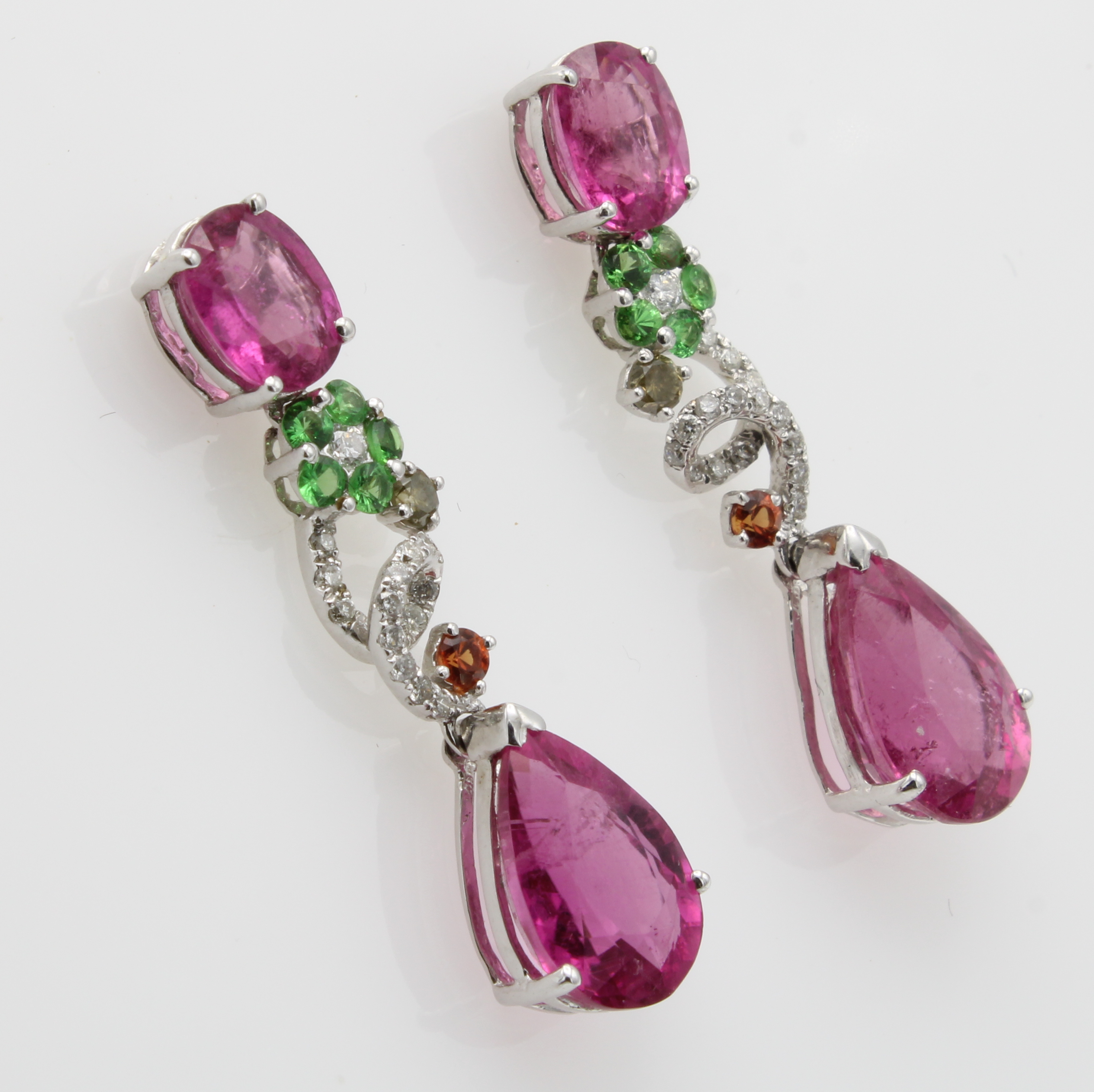 Paar Ohrstecker mit Farbsteinen und Brillanten, WG 750/000, 4 pinkf. Turmaline zus. ca. 8.6 ct, 2 orangef. Saphire zus. ca. 0.10 ct, 10 Tsavorite zus. ca. 9 ct, 34 Brill.zus. ca. 0.40 ct Weiß/p Schätzpreis: 4000, - EUR