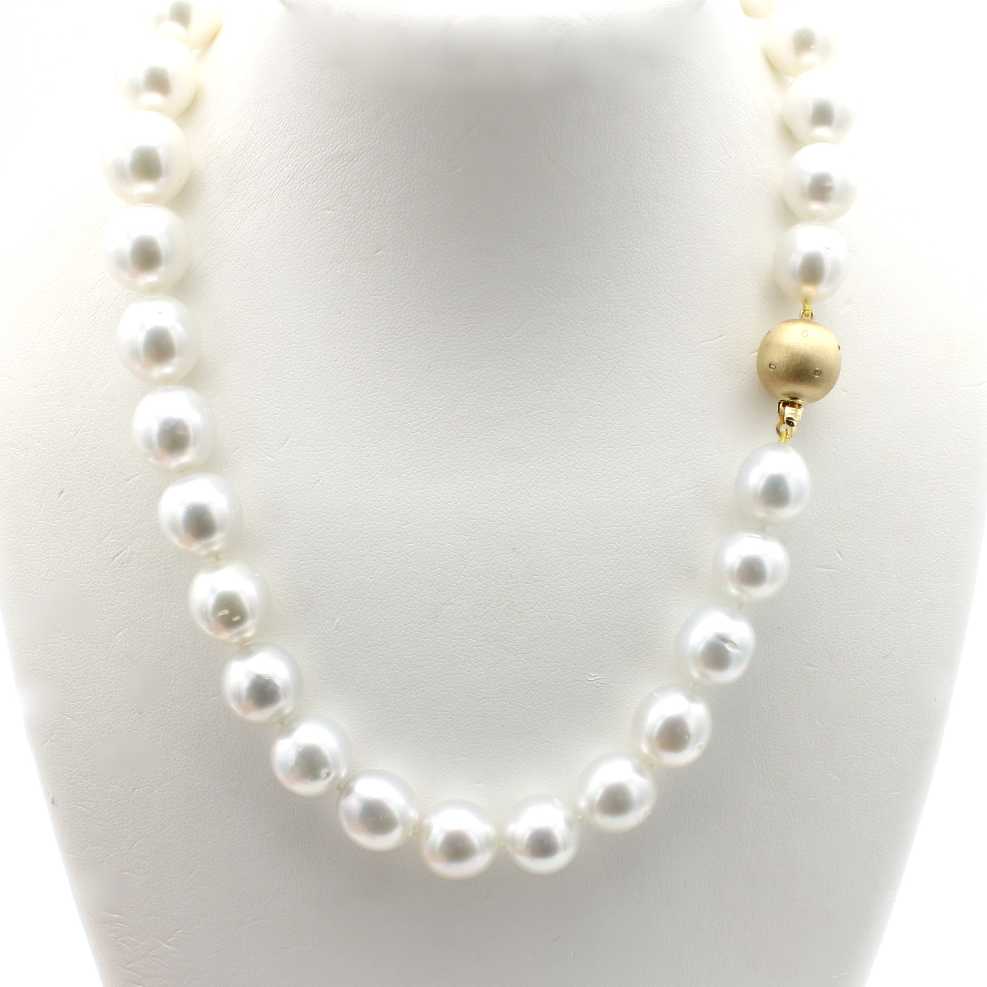 Südseezuchtperlenkette, Kugelschl. GG 585/ 000, z.T. matt. bes. m. 10 Brill. zus. ca. 0.06 ct Weiß/si, 31 weiß-silberf. Perlen im Verlauf m. roséfarb. Überton, D. ca. 12-14.5 mm, L. ca. 45 cm Schätzpreis: 8000, - EUR