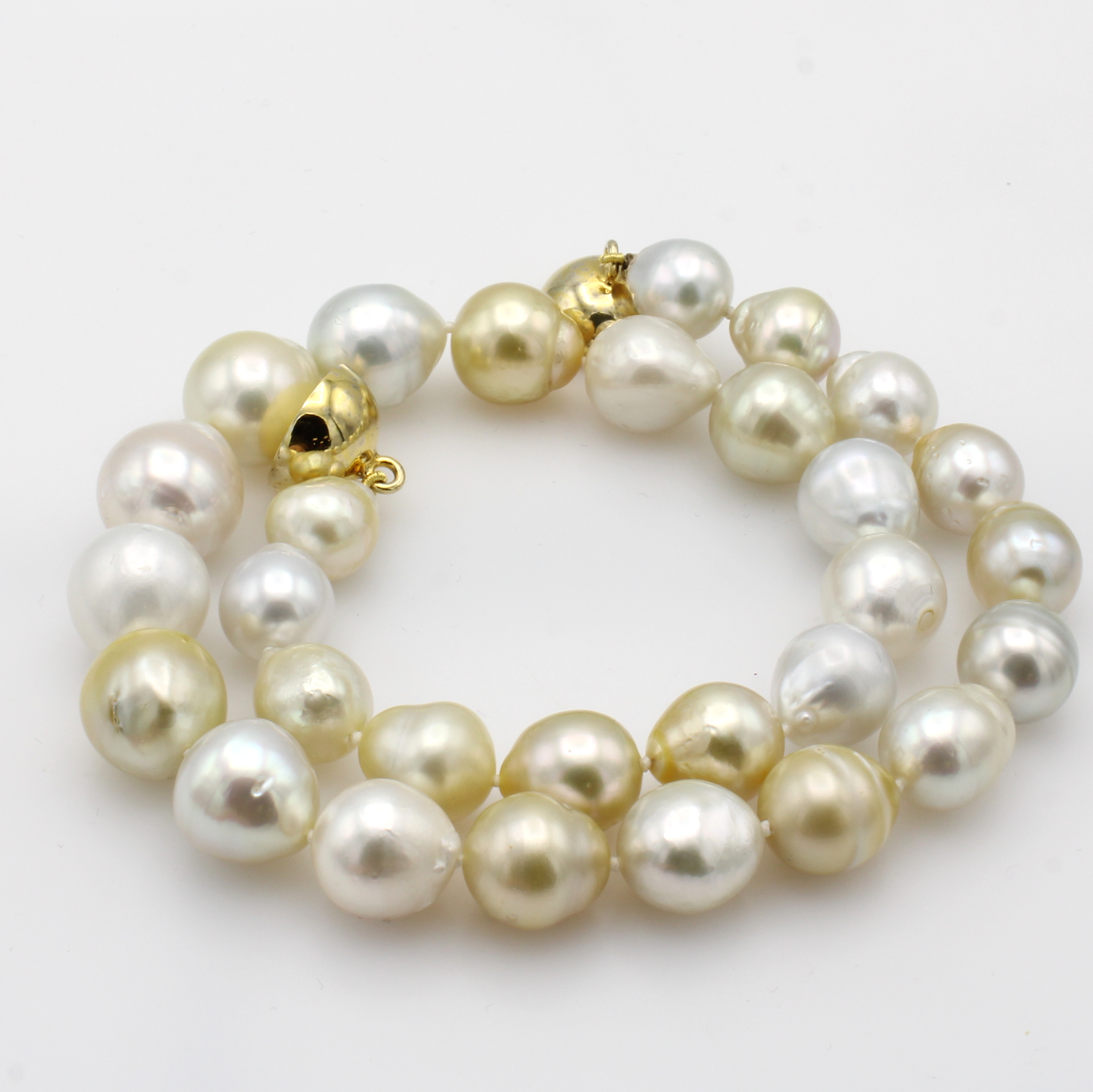Südseezuchtperlenkette, Magnetschl. 925er Silber verg., 29 weiße-silbergraue u. hell- goldene Perlen, l. barocke Tropfenform, teils m. irisierendem Lüster, L. ca. 47 cm Schätzpreis: 3800, - EUR