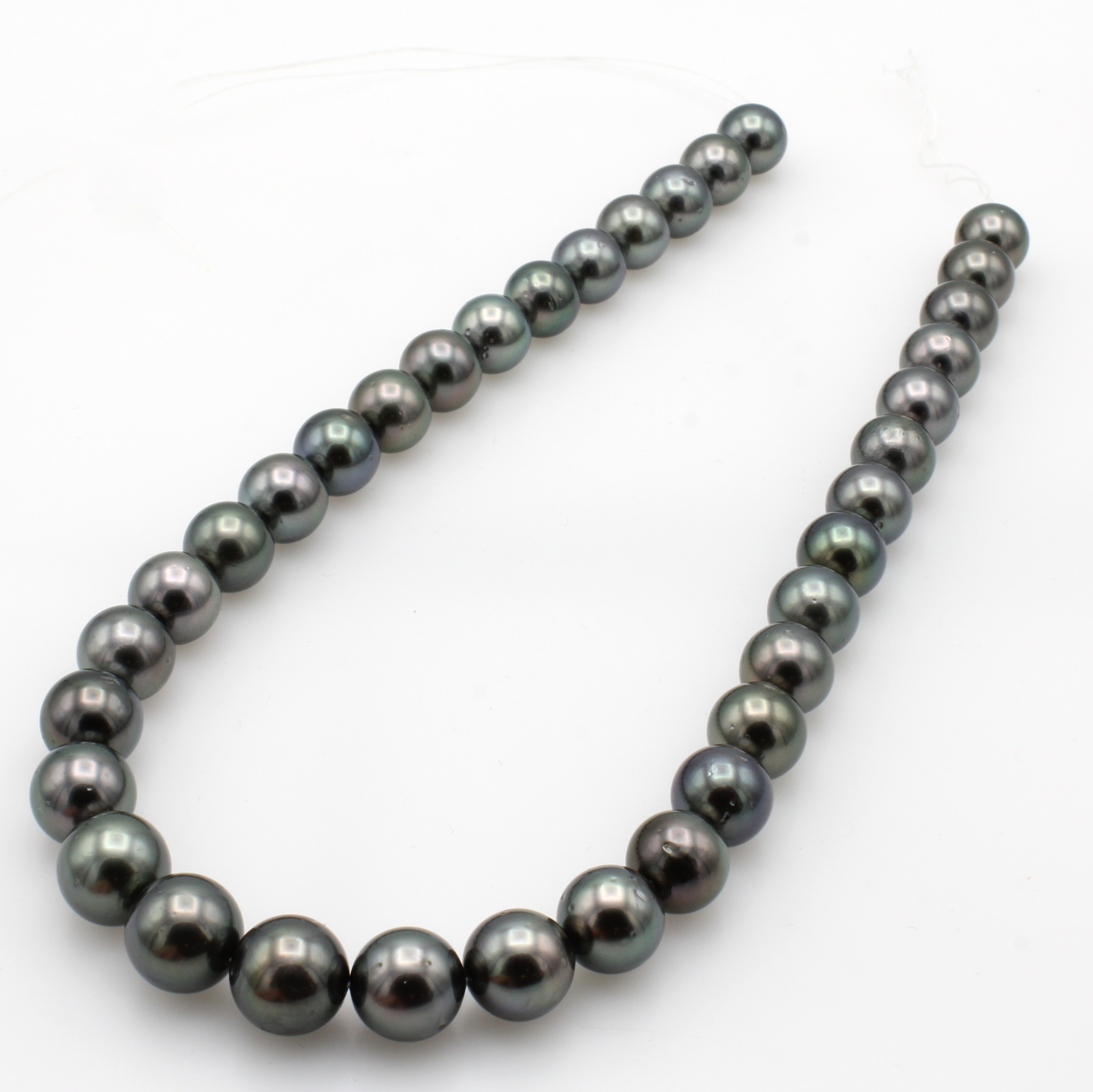Tahitizuchtperlstrang, 35 Perlen im Verlauf v. anthrazitfarb. - grauem Lüster, D. ca. 11.2x12.8 mm, L. ca. 40 cm Schätzpreis: 7000, - EUR