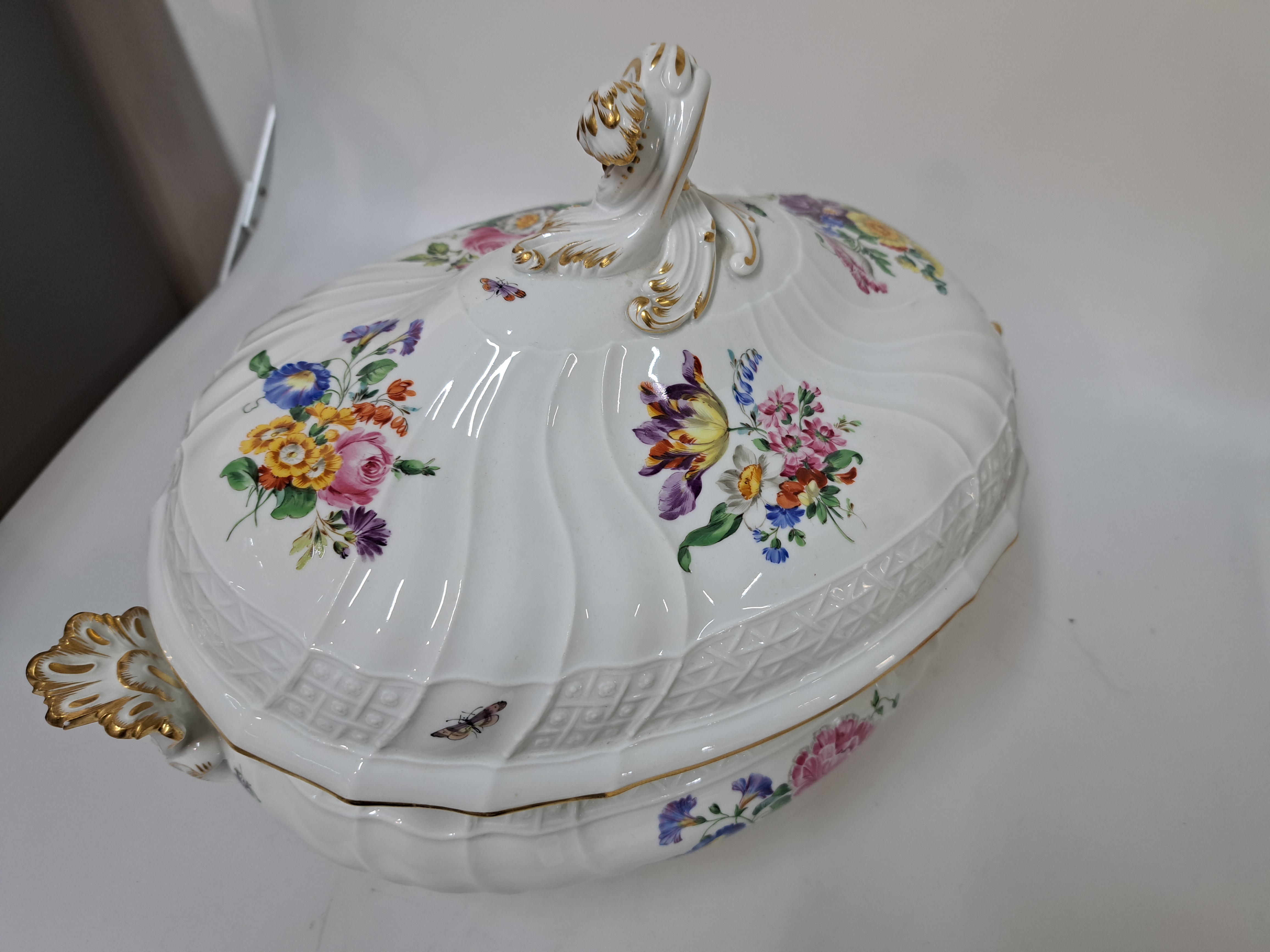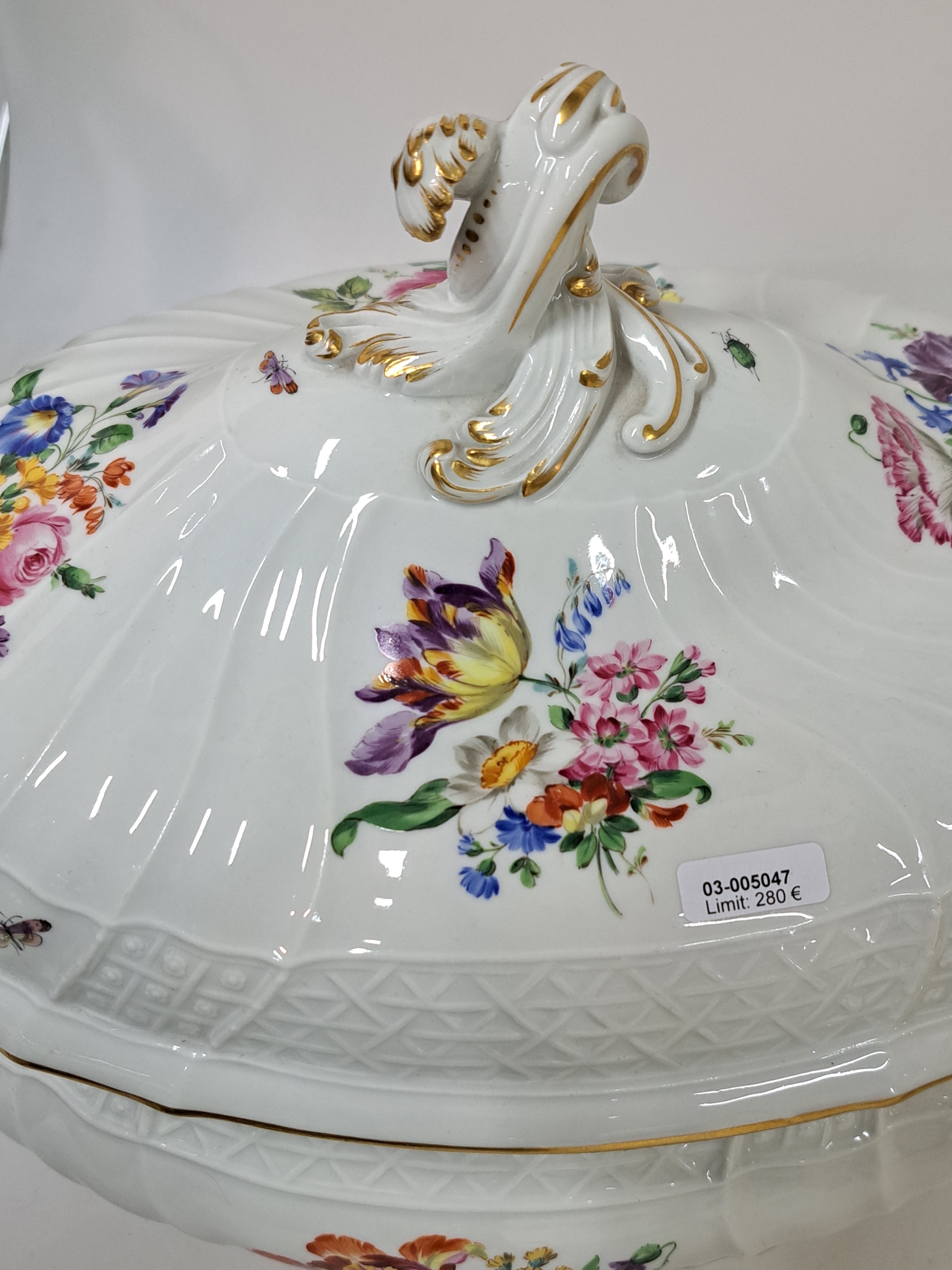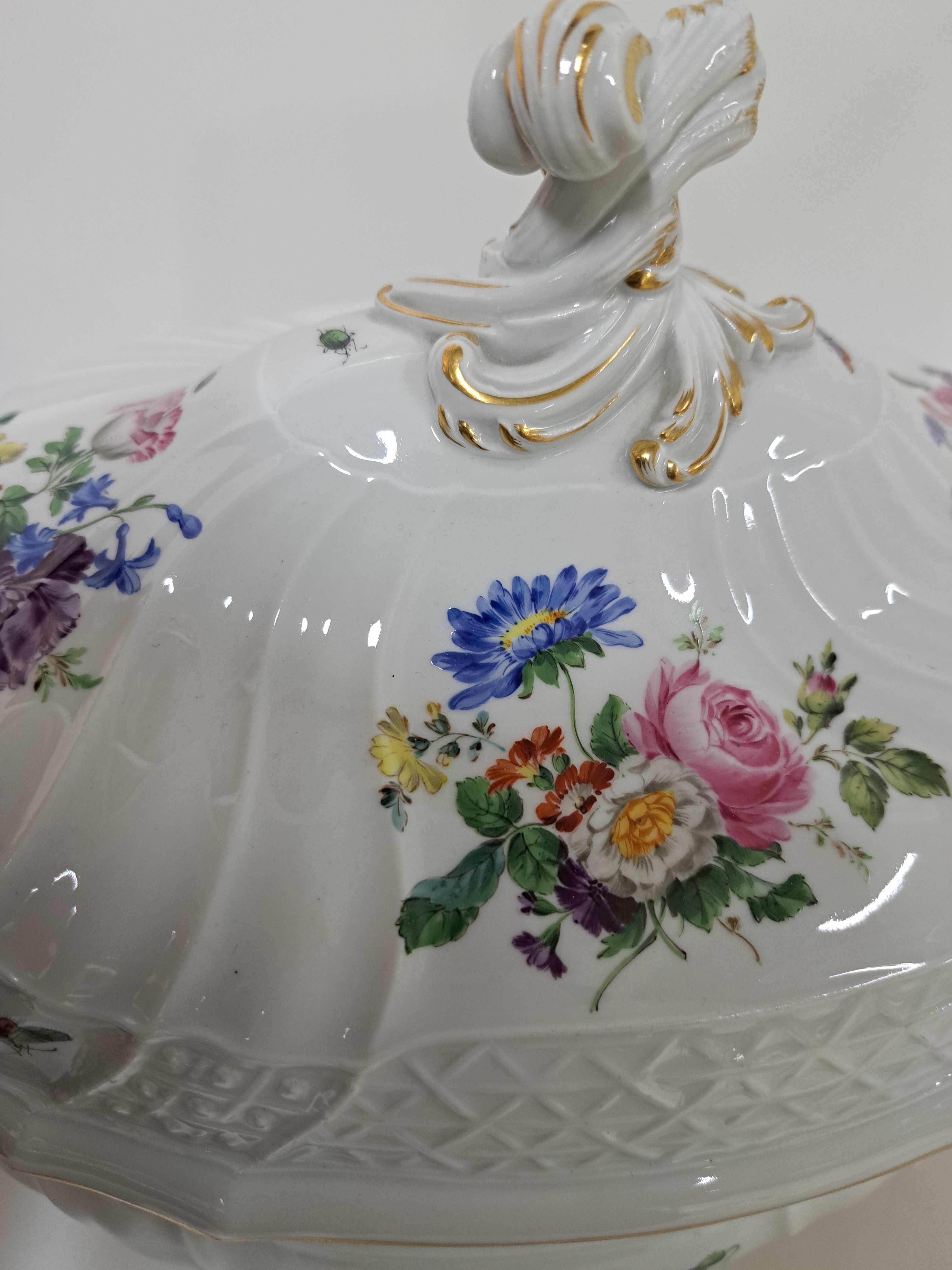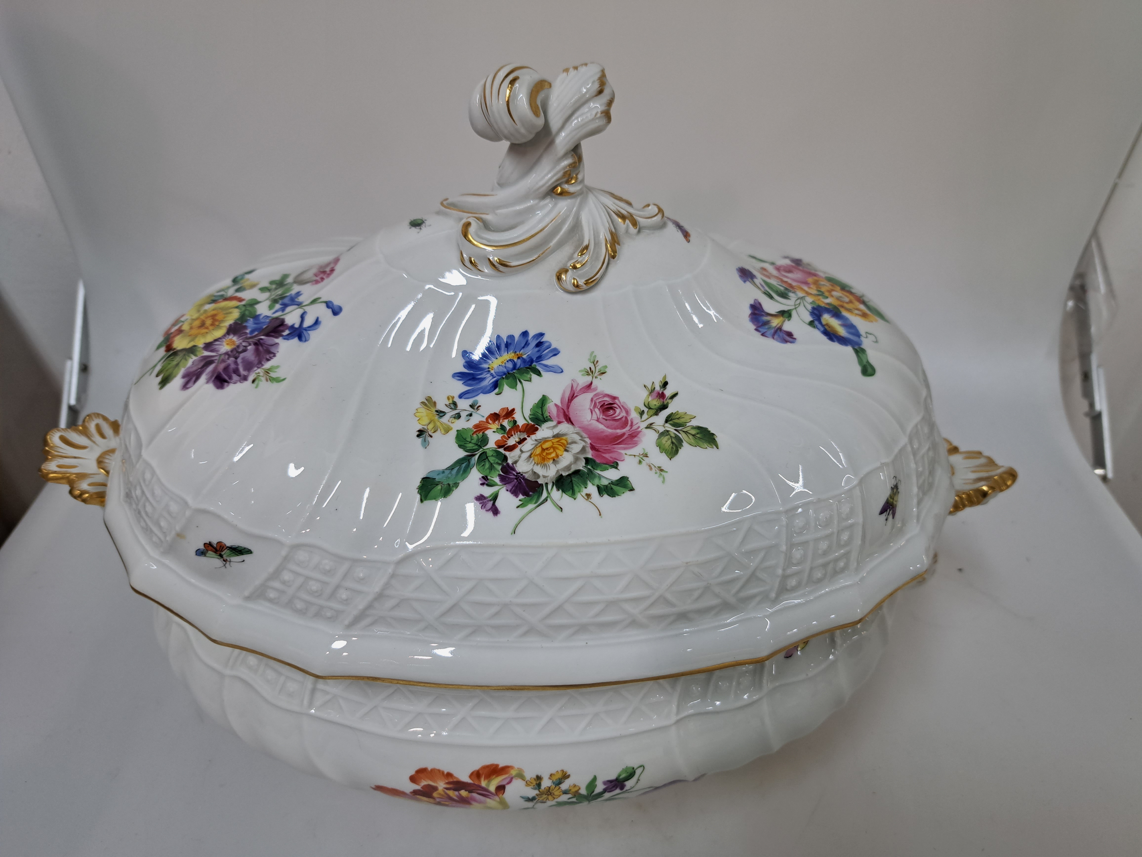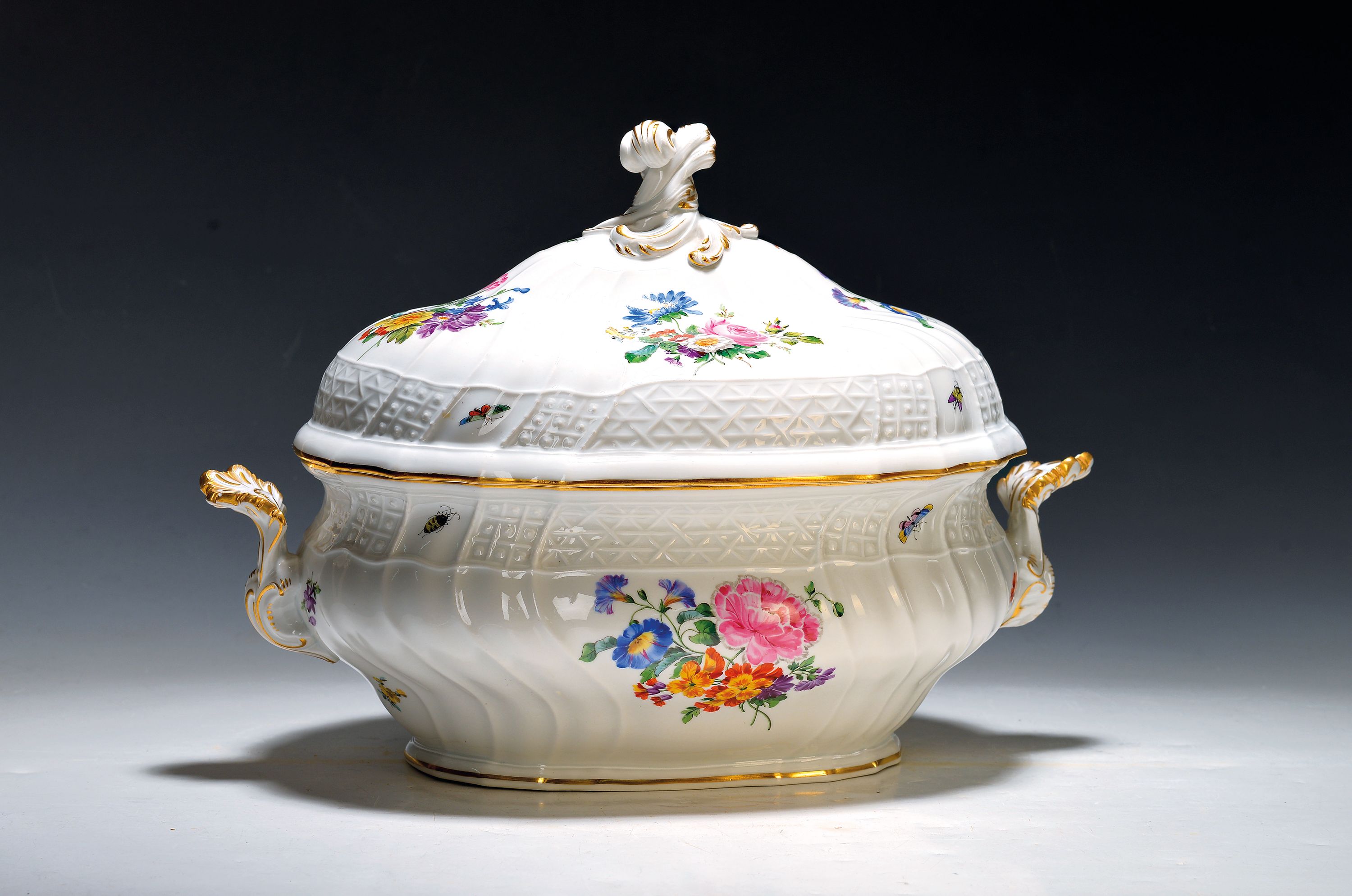 Große Deckelterrine, Meissen, Pfeifferzeit, 2. Wahl, Porzellan, farbig- und goldstaffiert,