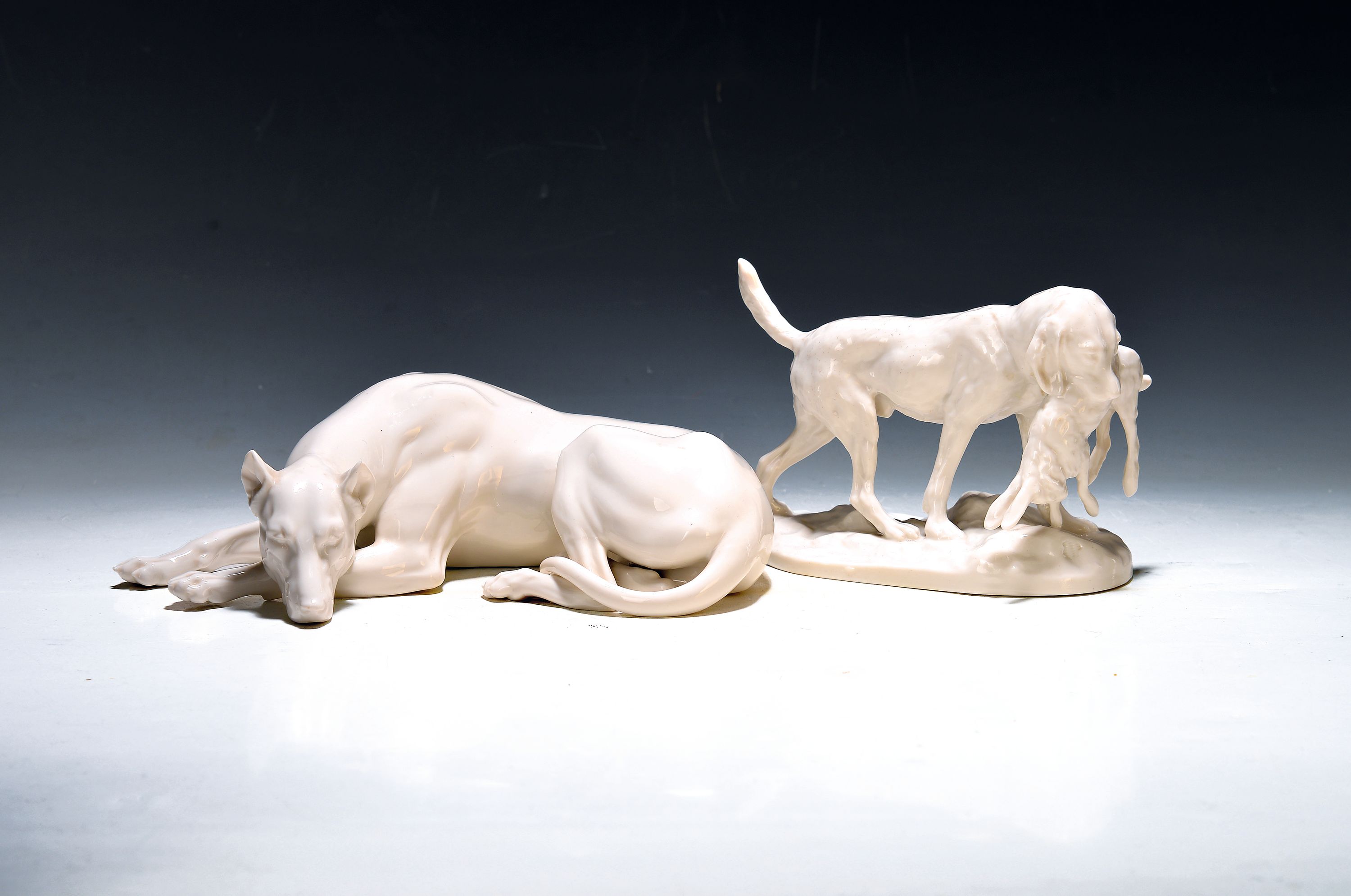 2 Porzellanfiguren, Nymphenburg, 20.Jh., Weißporzellan, liegende Dogge, L. 24 cm;