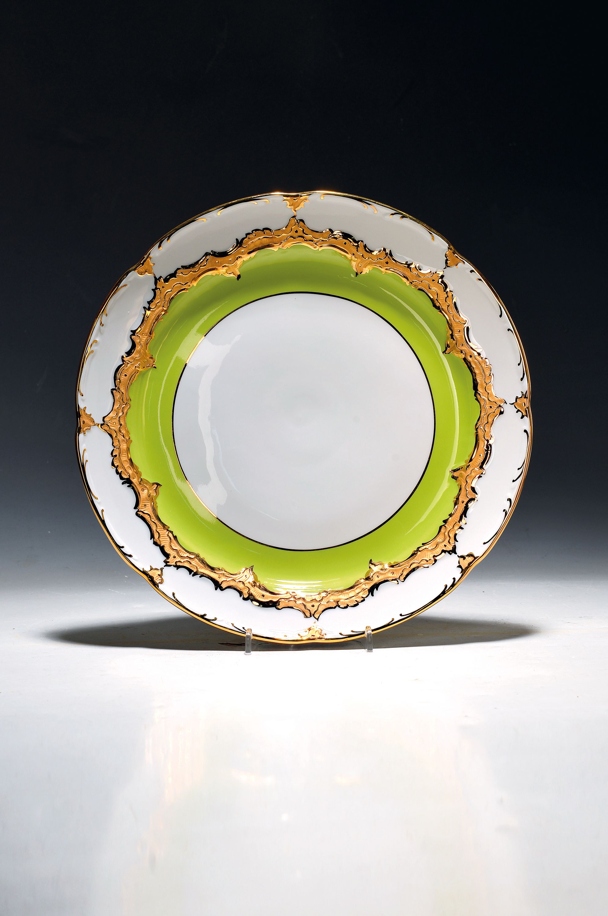 Runde Platte, Meissen, 20. Jh., 1. Wahl, B-Form, partiell grün glasiert, matt- und