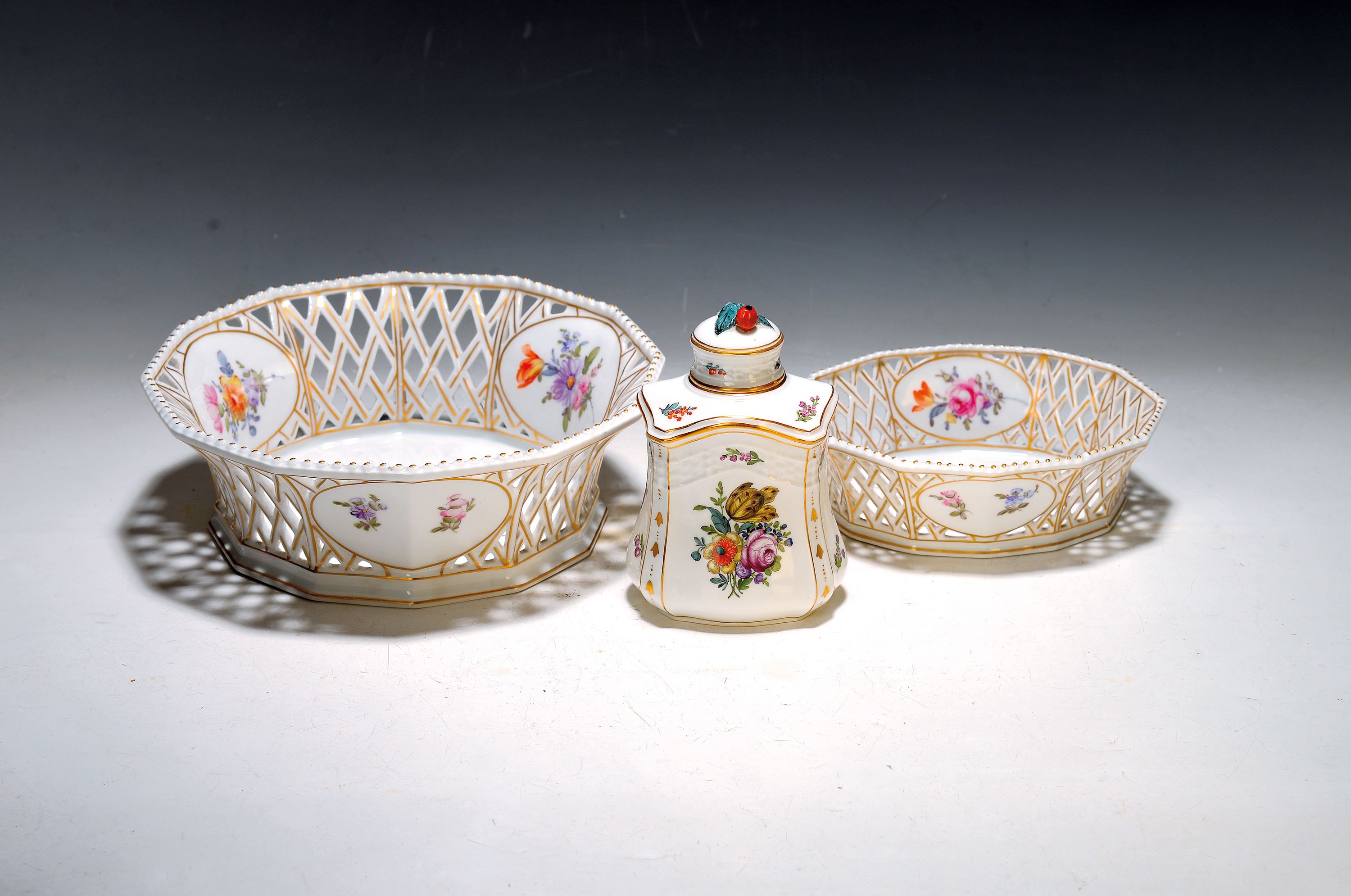 und Durchbrucharbeit, Goldstaffage, Blumenbukettmalerei innen und außen gestreute