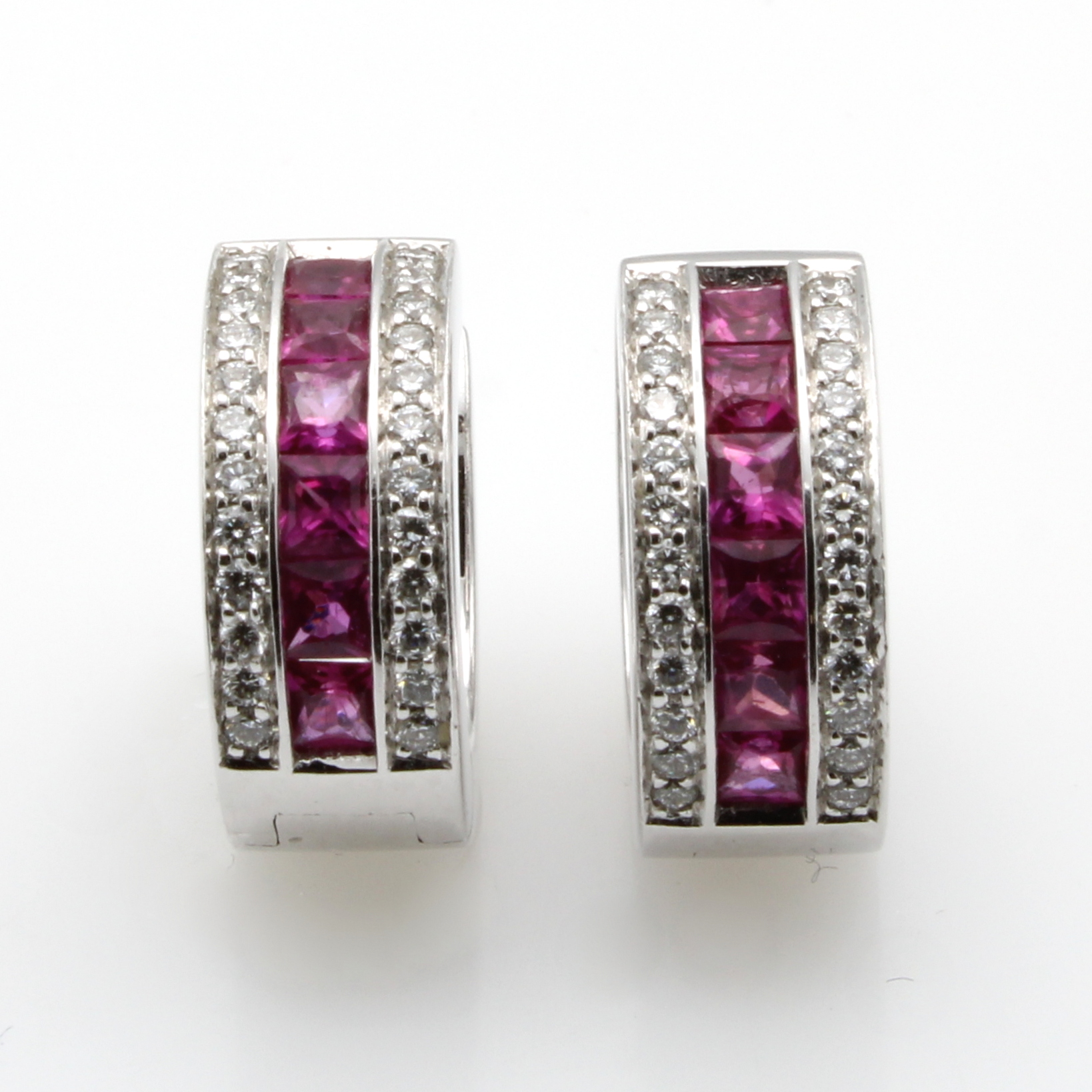 Paar Creolen mit Brillanten und Saphiren, WG750/000, Brill. zus. ca. 0.31 ct feines Weiß/ vs, pinkfarb. Saphircarrées zus. ca. 1.06 ct Schätzpreis: 4900, - EUR