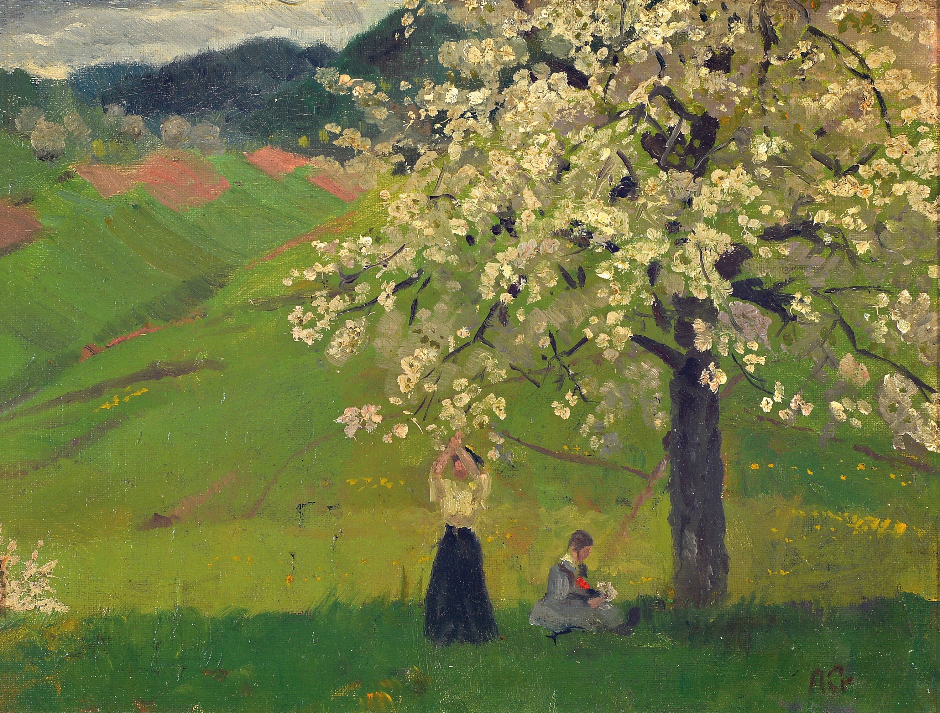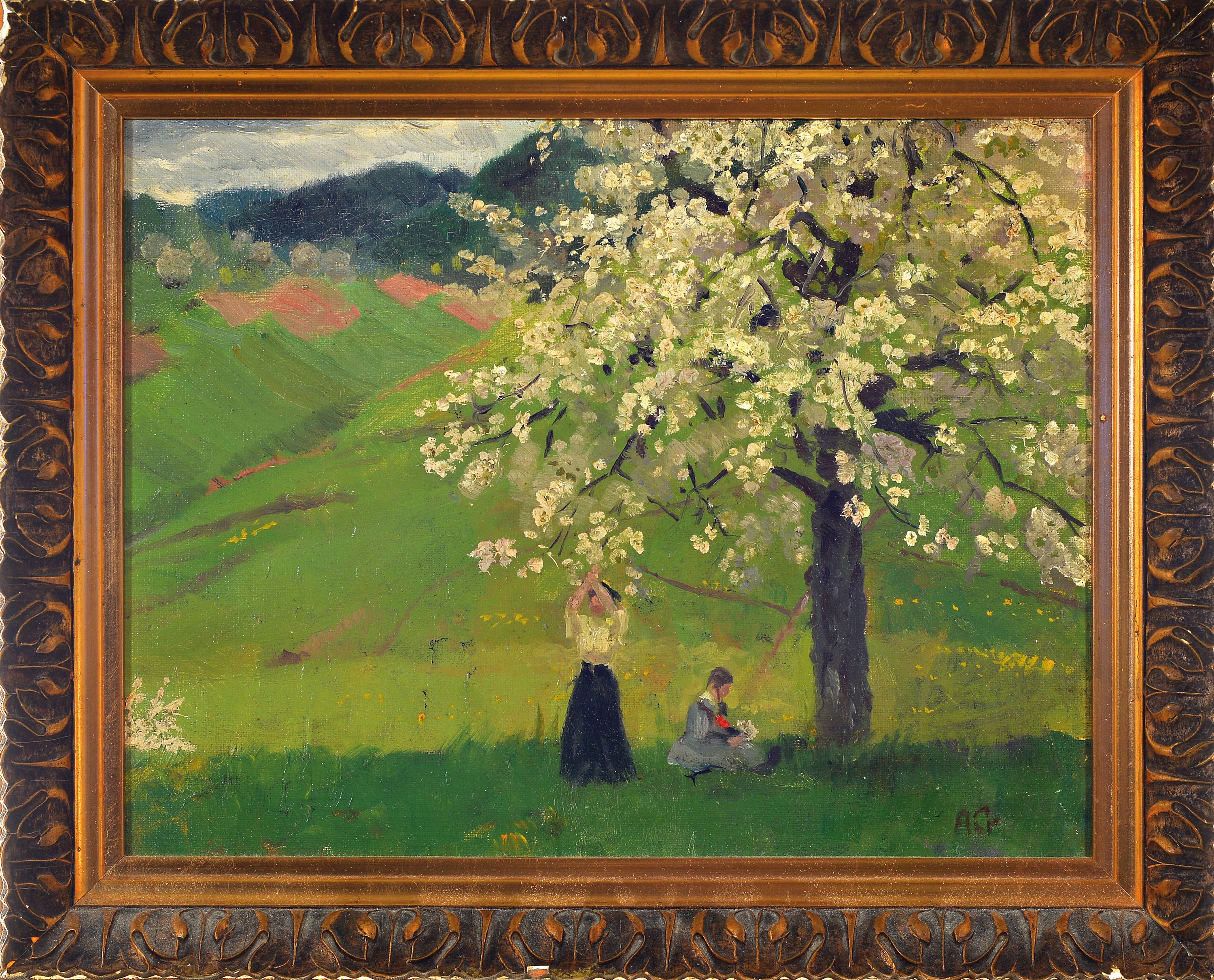 August Croissant, 1870-1941 Landau, Zwei junge Frauen unter einem blühenden Baum