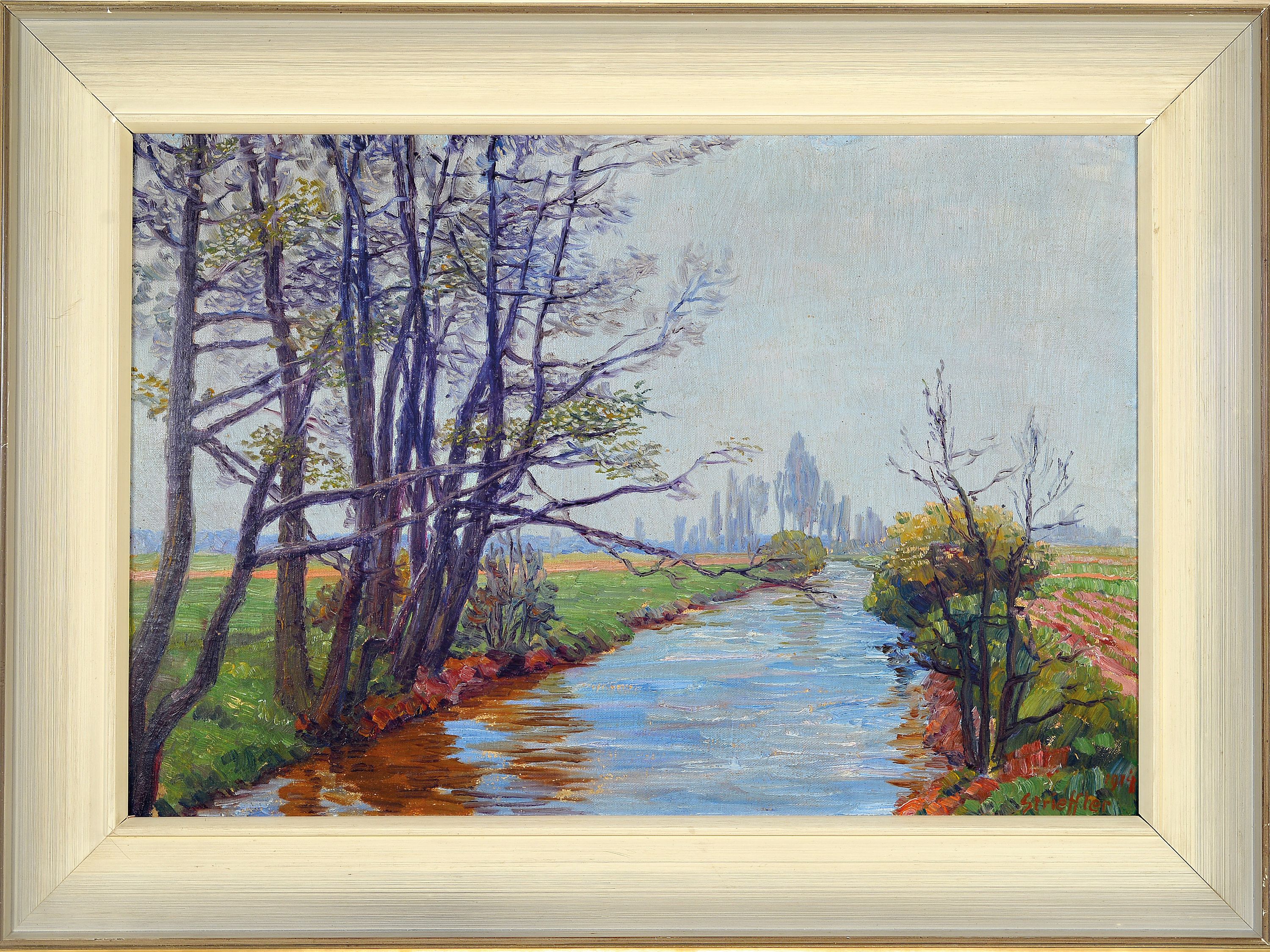 Heinrich Strieffler, 1872 Neustadt-1949 Landau, Vorfrühling an der Queich, Öl/Karton,