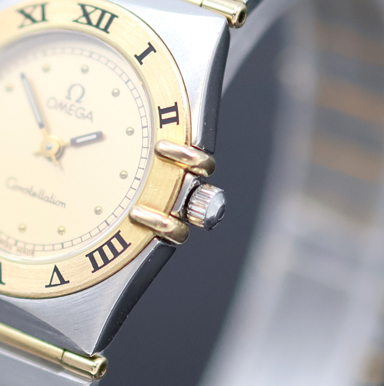 OMEGA Constellation Damenarmbanduhr in Stahl/ Gold Referenz 795.1080, quarz, Boden aufgedr., Gliederband m. Faltschl., Goldlünette m. röm. Zahlen, gold. Zifferbl., gold. Zeiger, Anz. v. Std. & Min, D. ca. 24 mm, L. ca. 18 cm, EZ 2-3