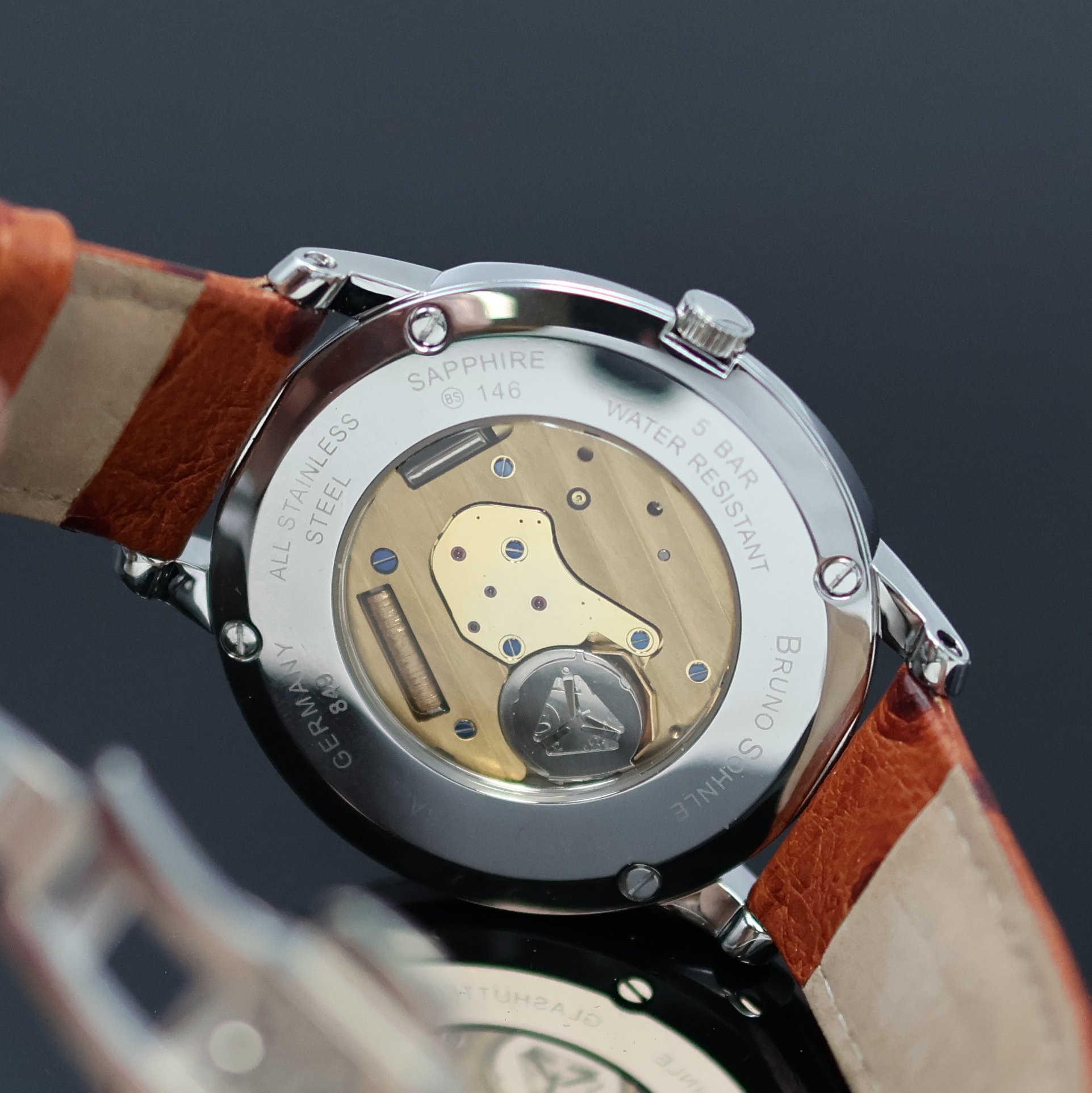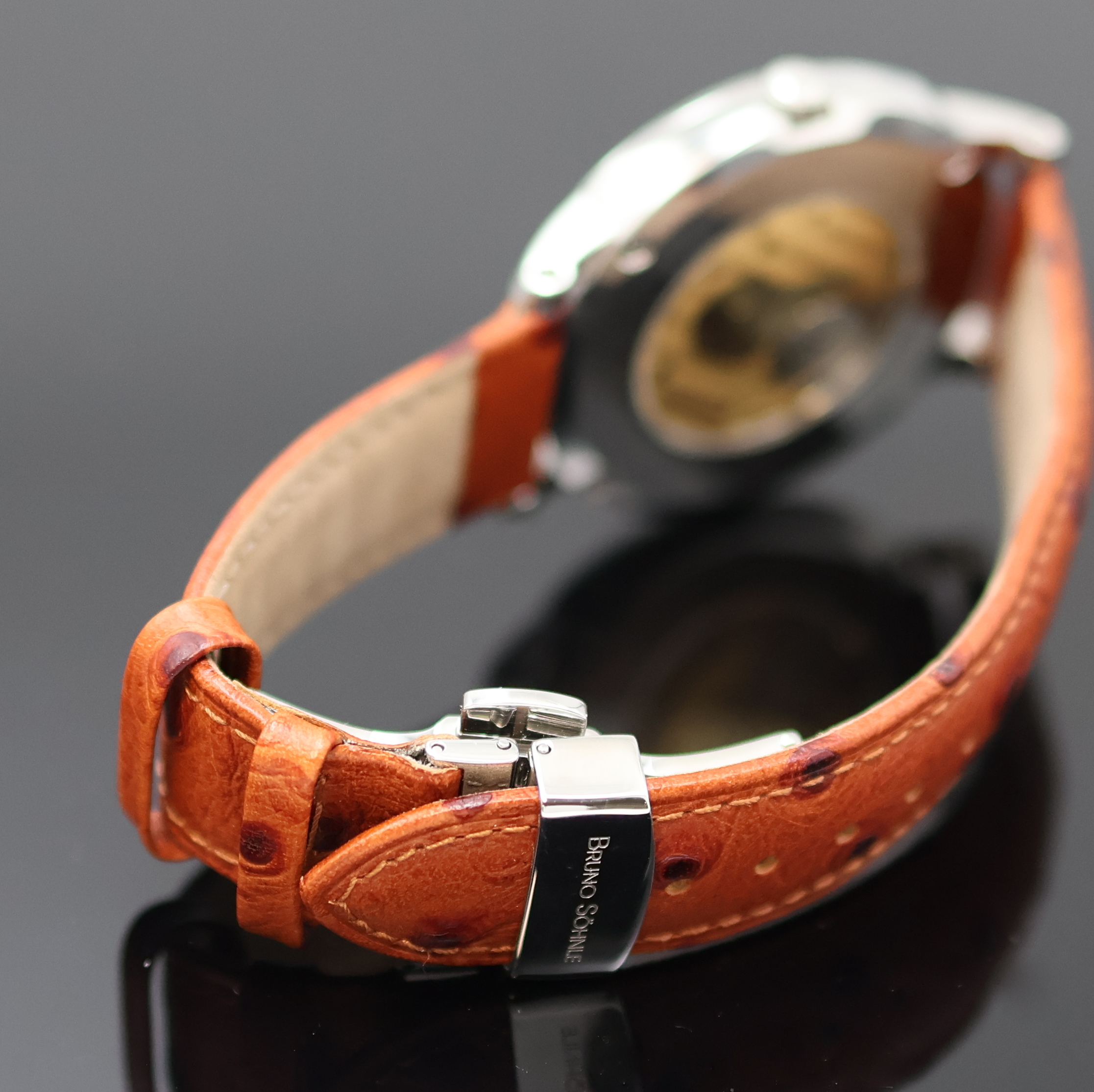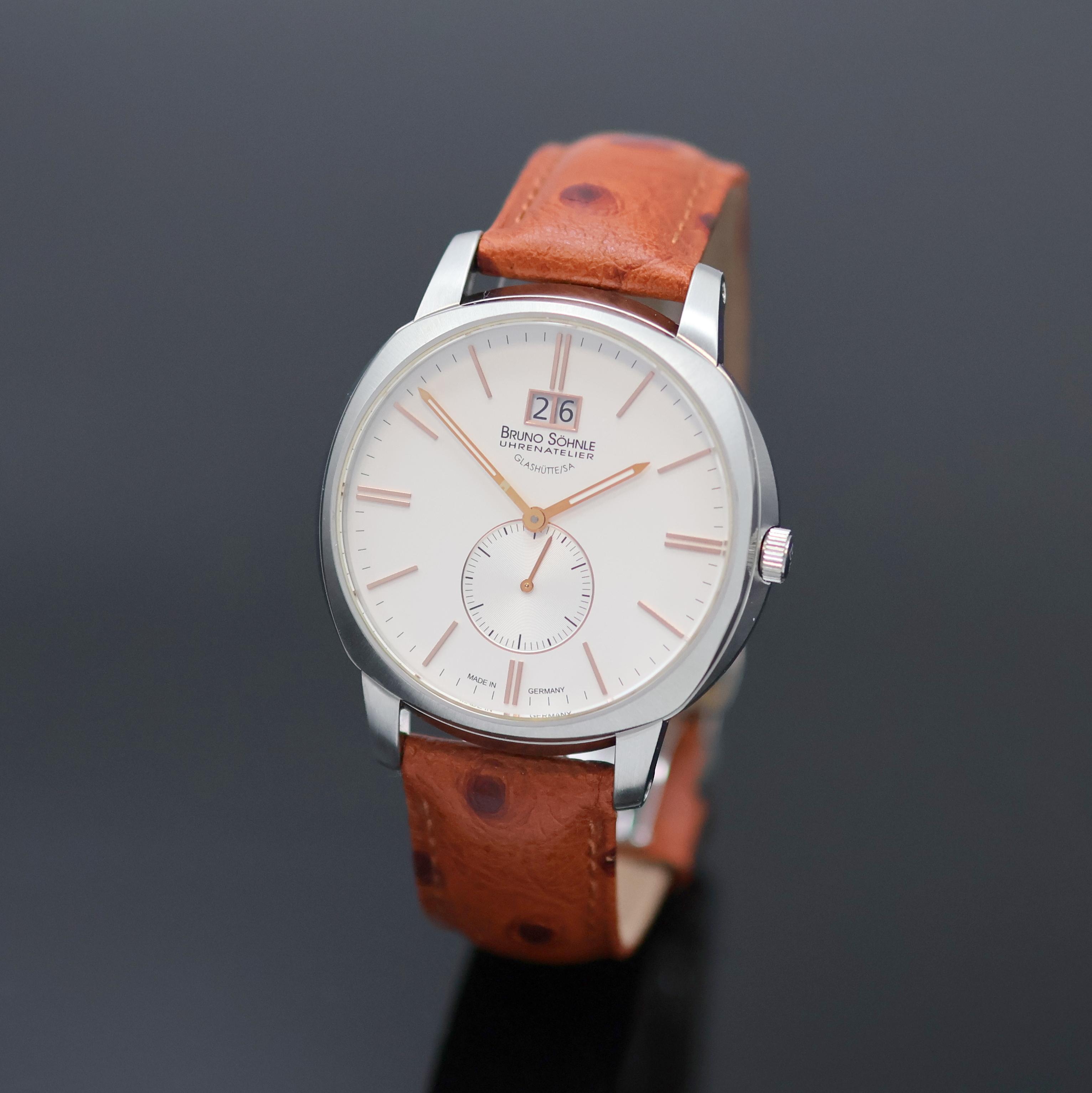 BRUNO SÖHNLE Uhrenatelier Glashütte/SA Herrenarmbanduhr, quarz, beids. vergl. Edelstahlgeh. inkl. Lederband m. orig. Faltschl., Boden 4-fach verschr., silb. Zifferbl. m. aufgel. Indizes, Anz. v. Std., Min., kl. Sek. & Großdatum, D. ca. 43 mm, EZ 2