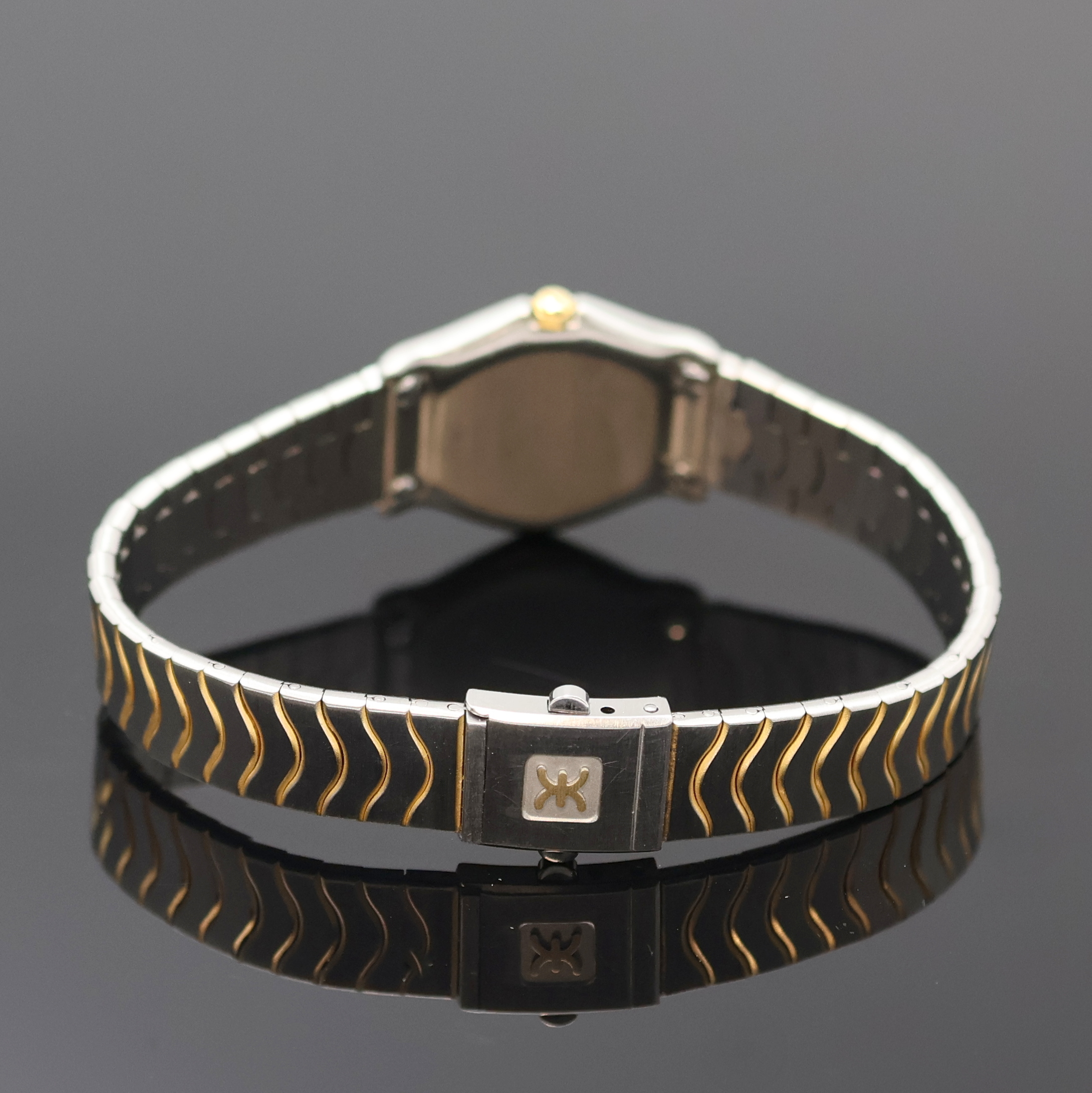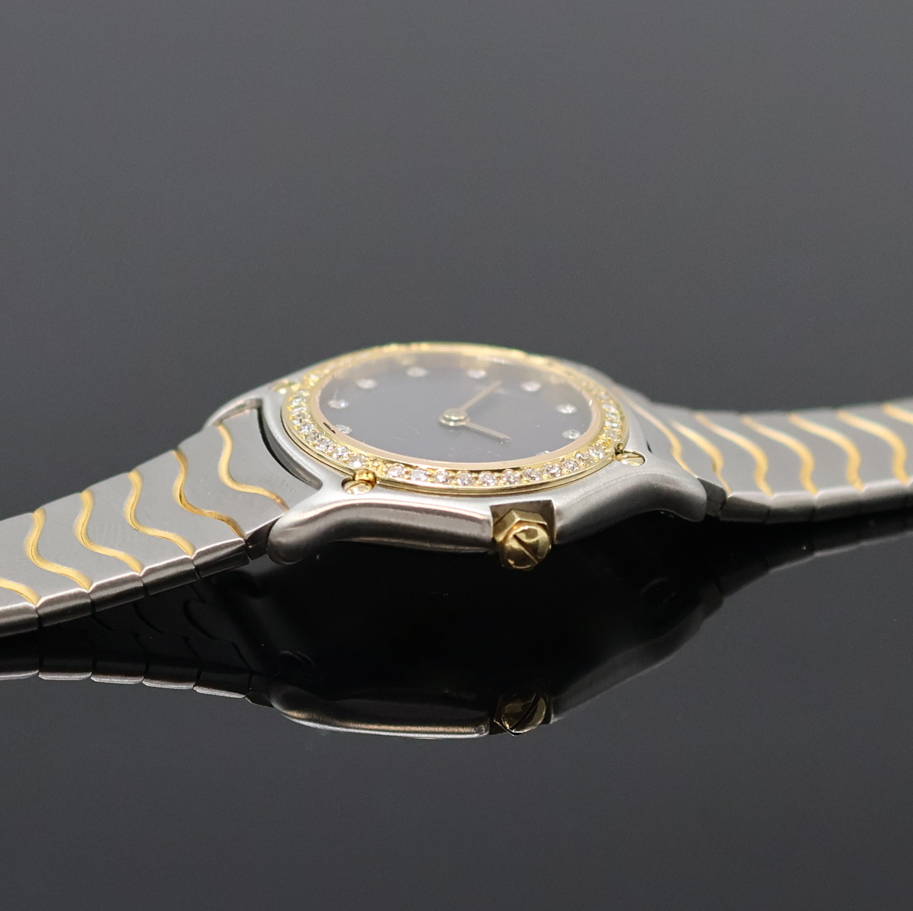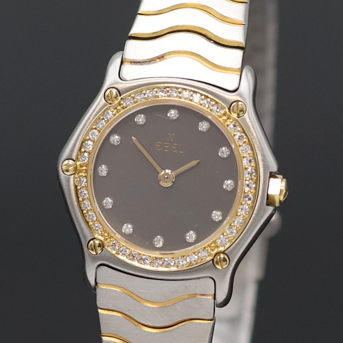 EBEL Classic Wave Damenarmbanduhr Referenz 166901, quarz, Edelstahl/Gold kombiniert inkl. Wellengliederband m. Kastenschl., 5-fach verschr. Goldlünette aufw. m. Brillanten bes., graues Zifferbl. m. Diamantindizes, Anz.v. Std. & Min., D. ca. 24 mm, L. ca. 17 cm, EZ 2