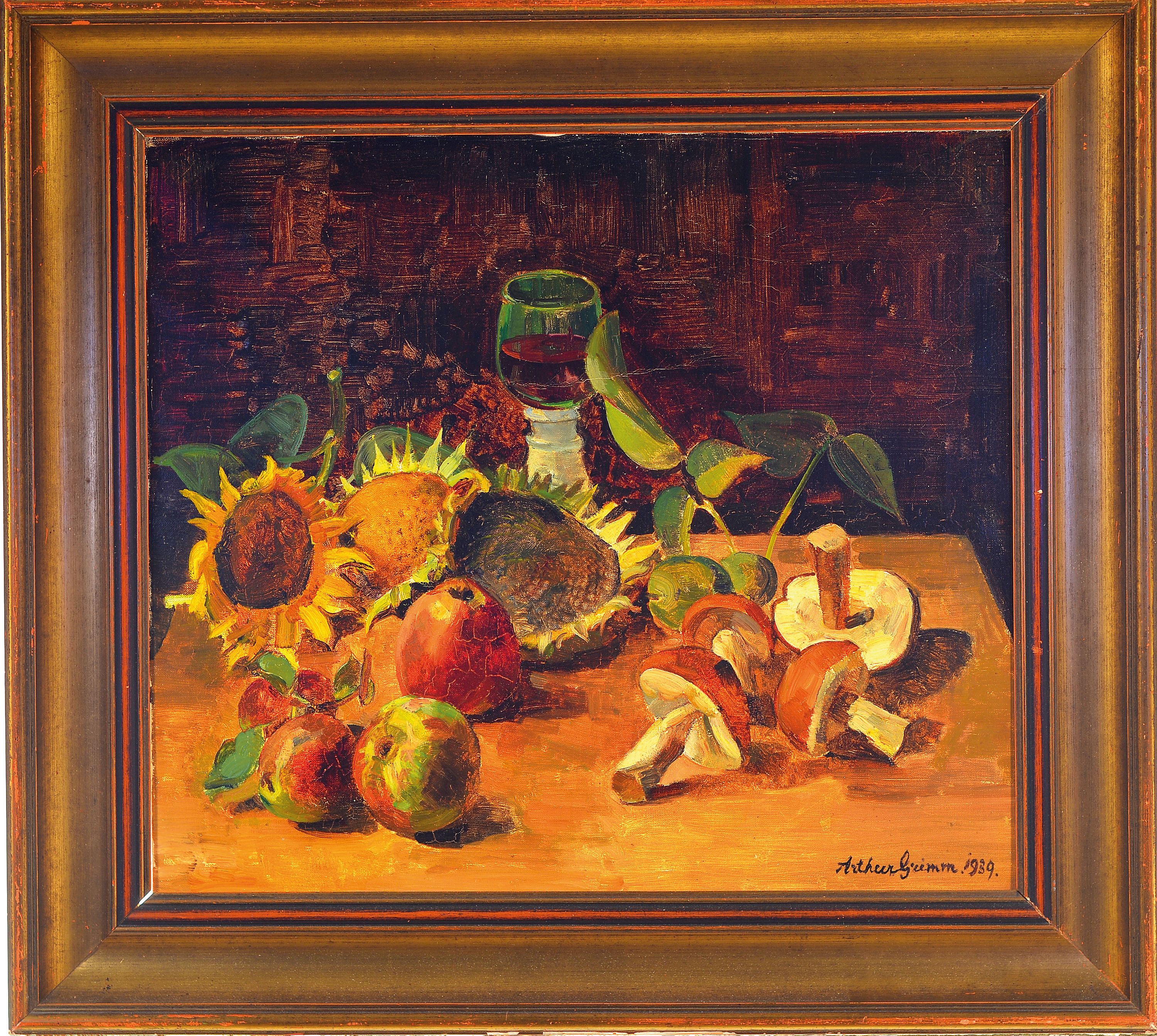 Arthur Grimm, 1883 Mudau-1948 Karlsruhe, Stillleben mit Sonnenblumen, Äpfeln, Pilzen