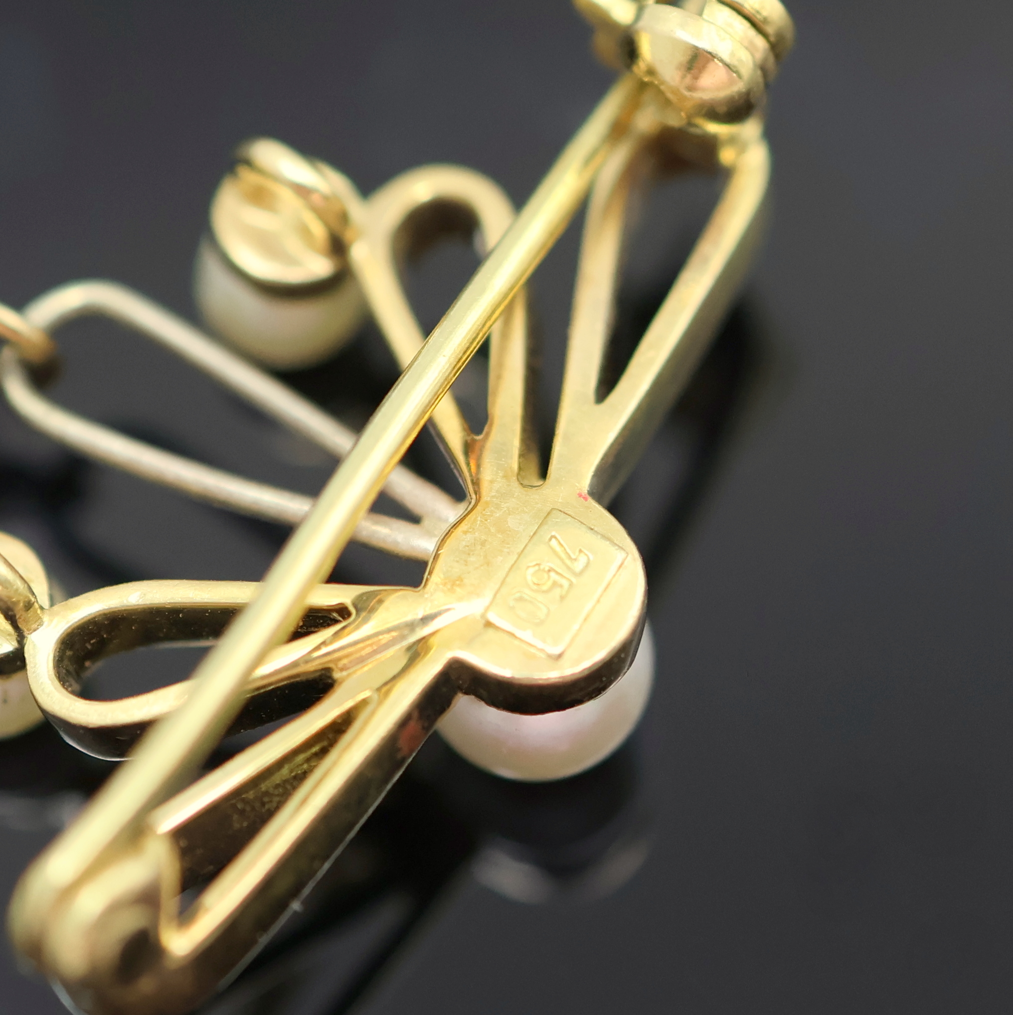 verziertes RoseG/GG 750/000 Geh., Goldcuvette, Brosche m. 3 Perlen besetzt, mattverg.