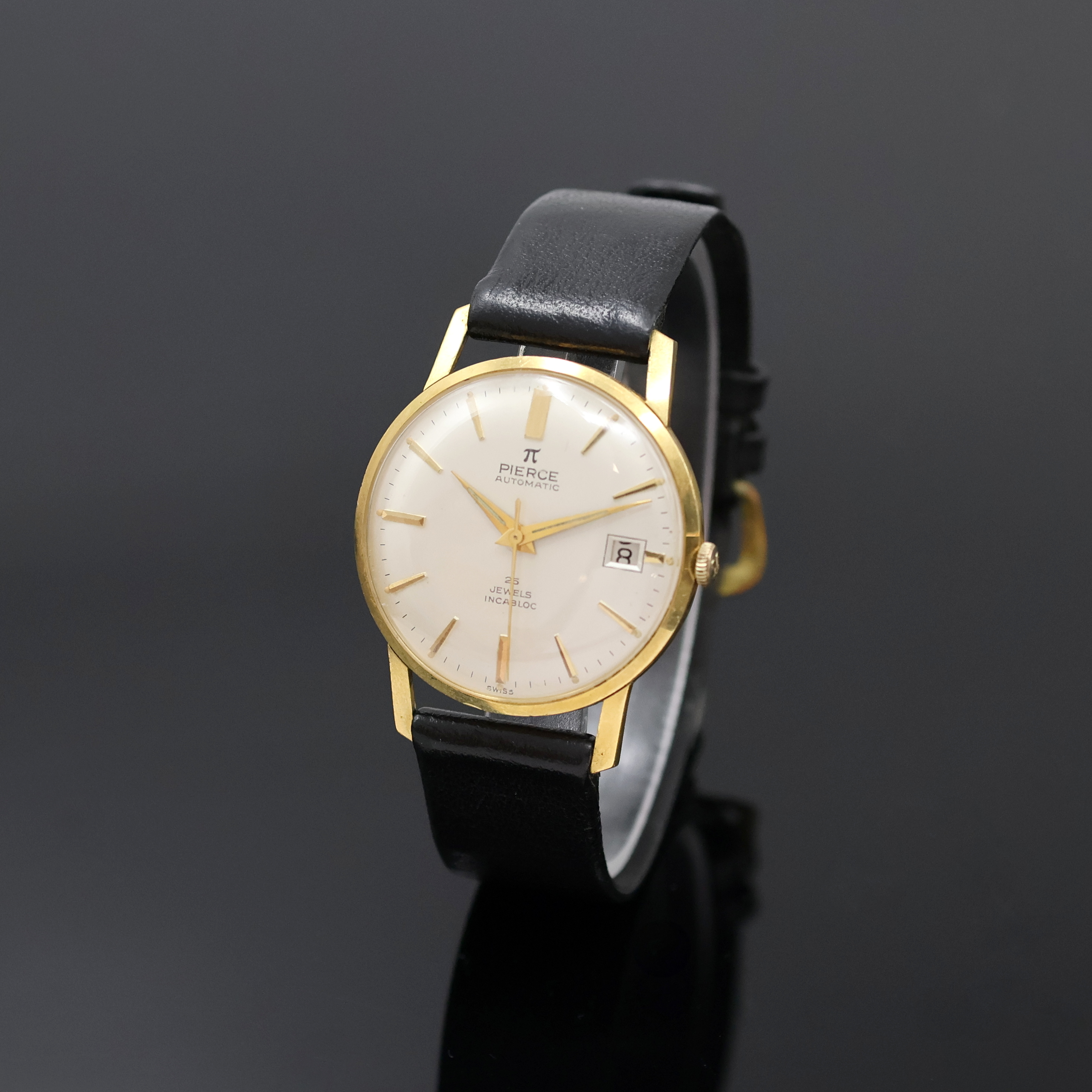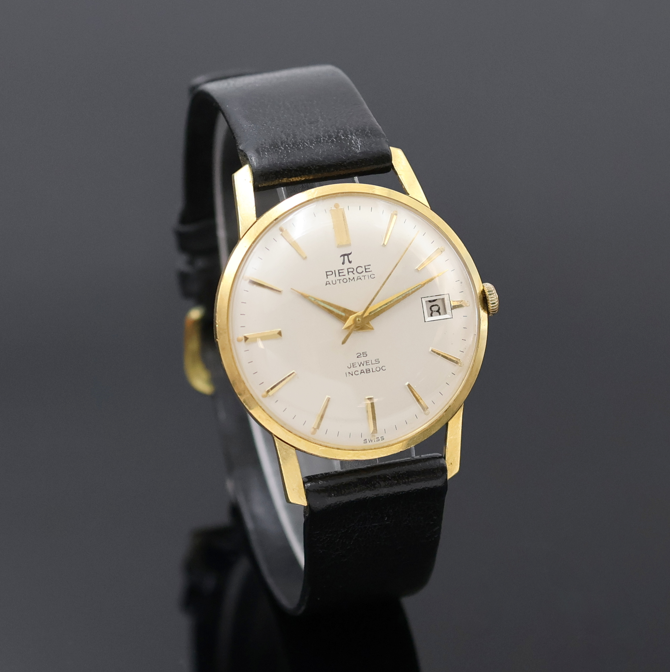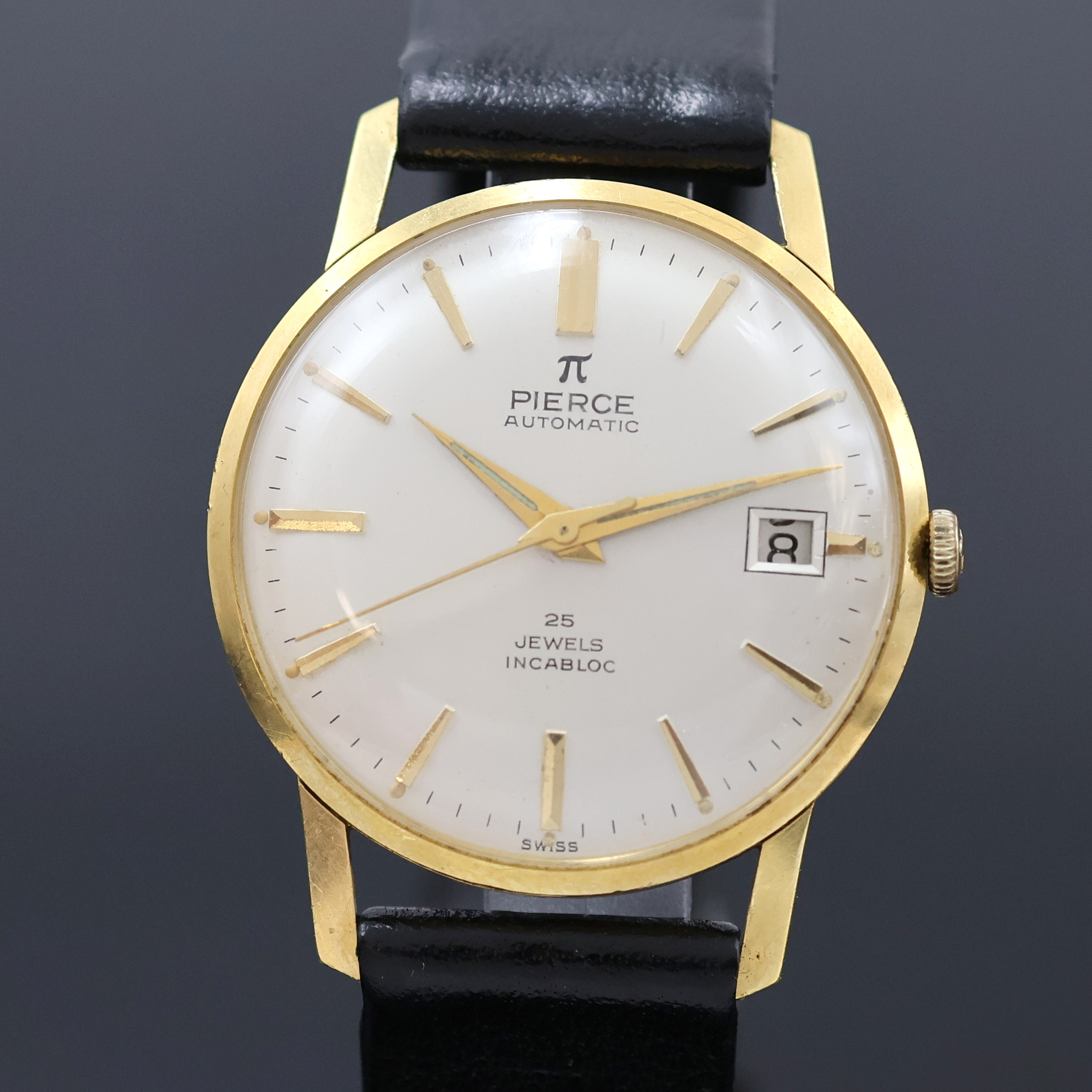 PIERCE Herrenarmbanduhr in GG 750/000, Automatik, Schweiz um 1965, 3-teil. Goldgeh.,