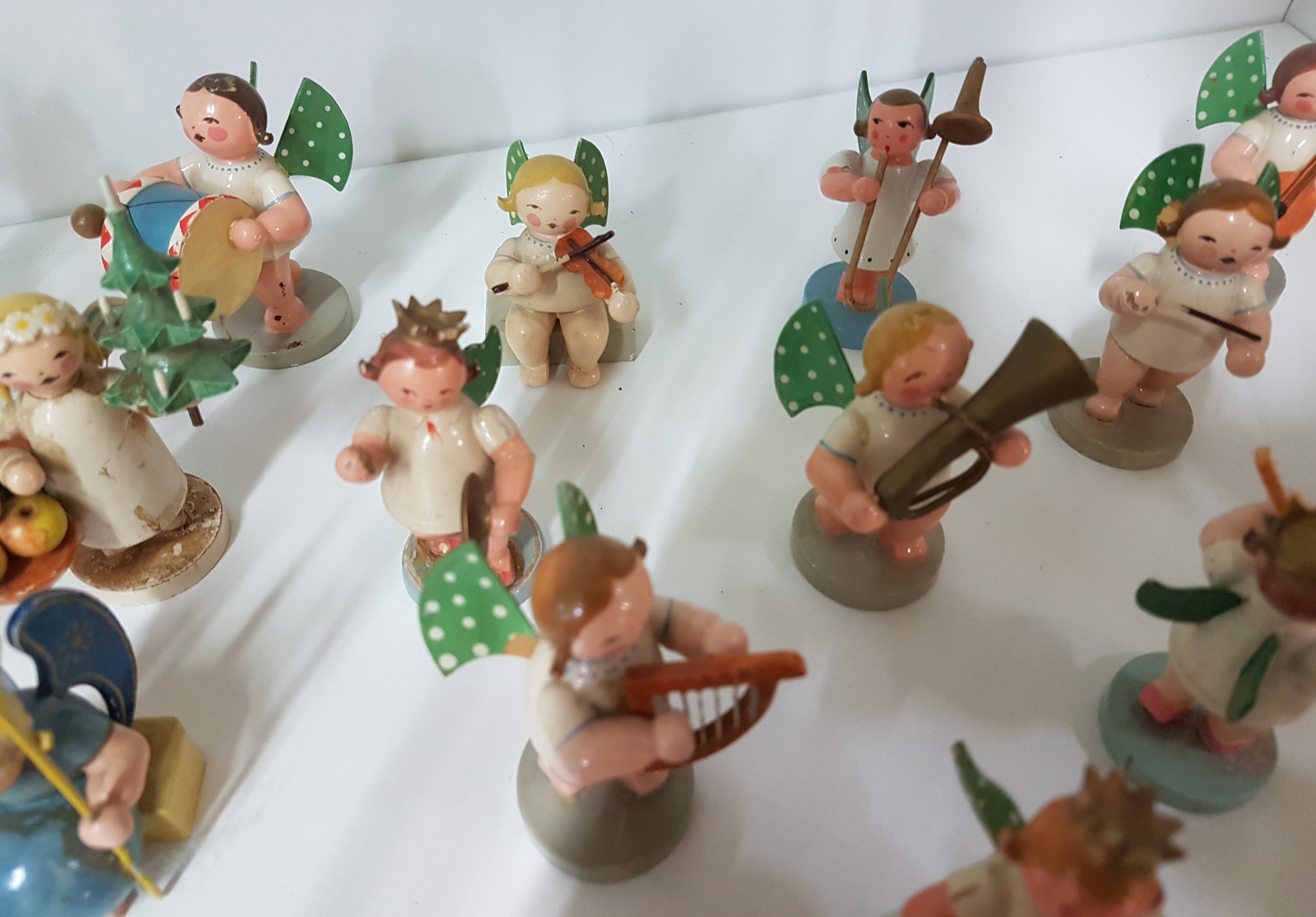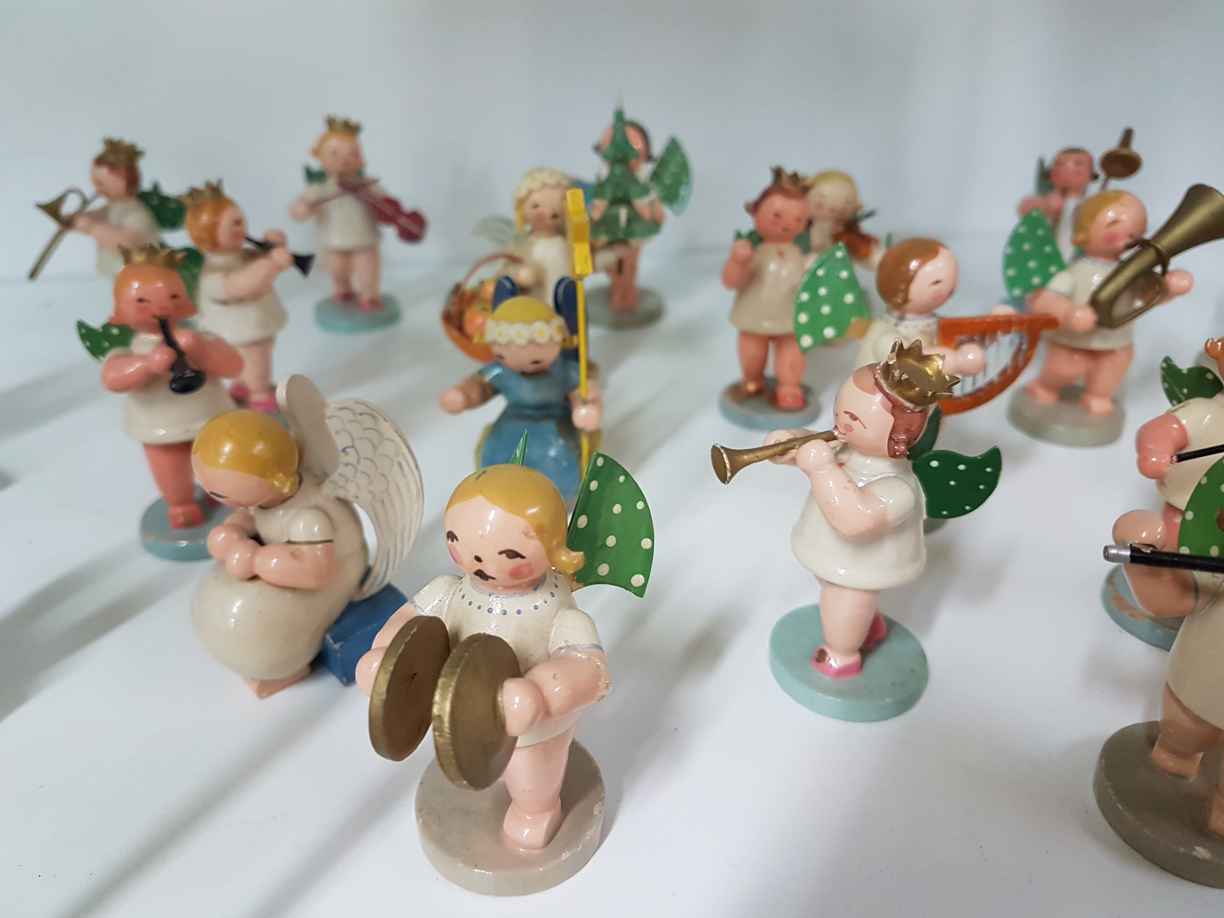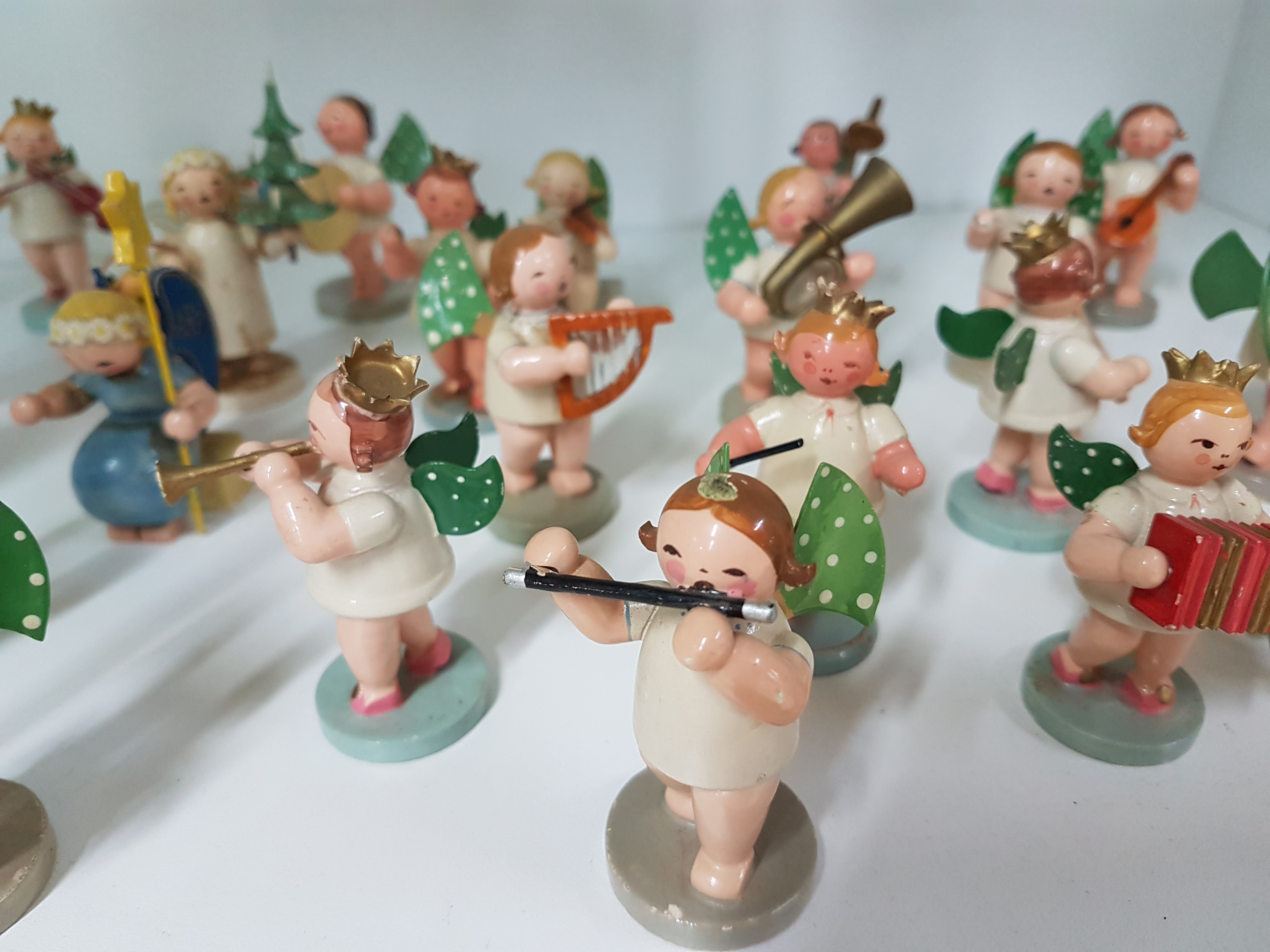 Angel chapel, Erzgebirge, 20th century, 24 figures, colorfully painted wood, green wings each with 11 white dots, height approx. 6 cm each
