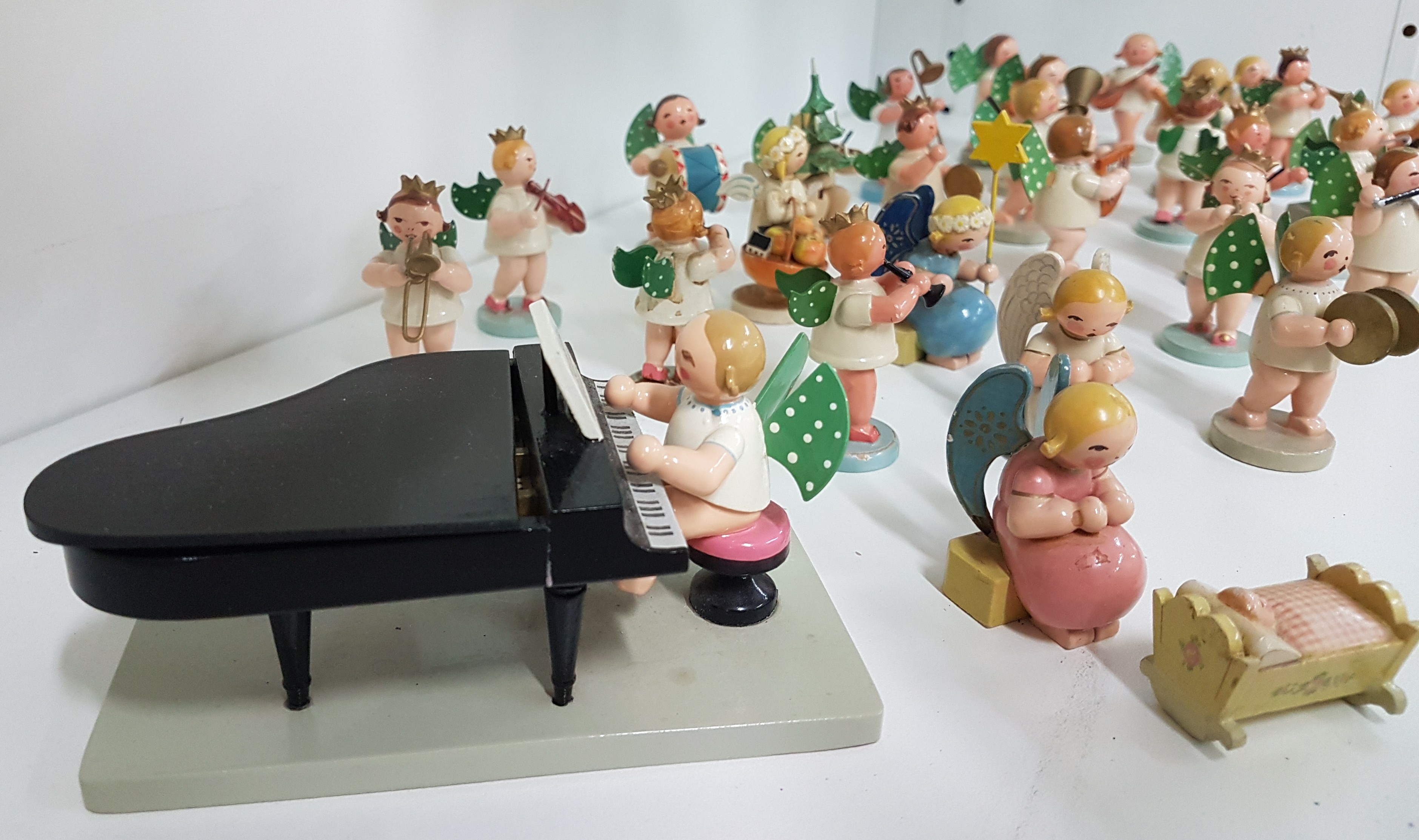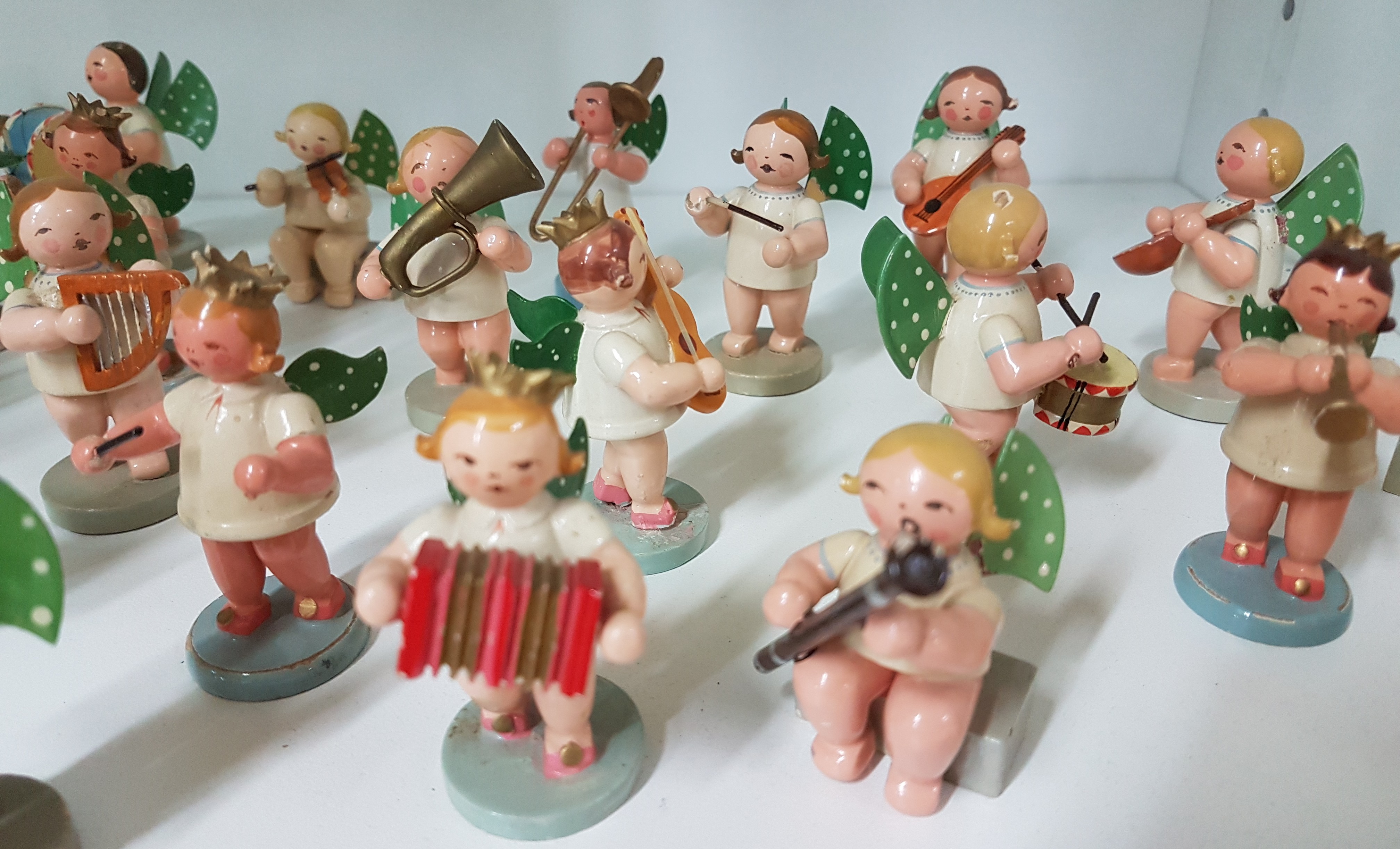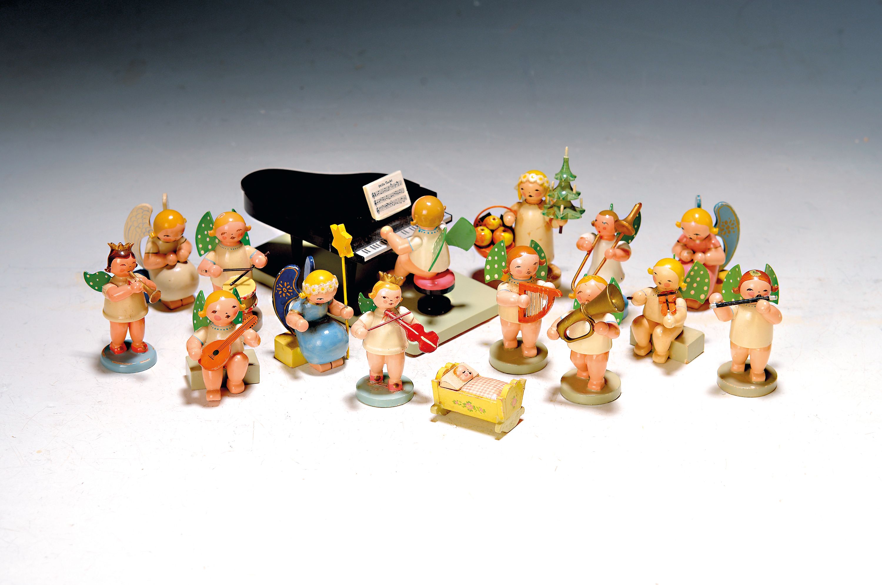 Angel chapel, Erzgebirge, 20th century, 24 figures, colorfully painted wood, green wings each with 11 white dots, height approx. 6 cm each