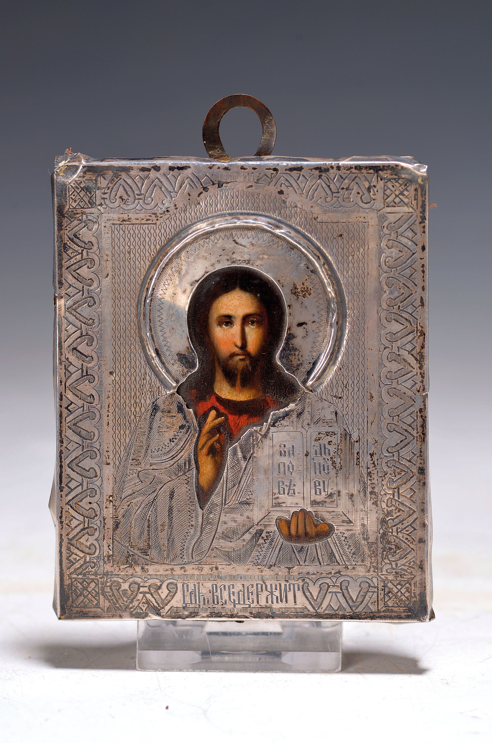 Kleine Ikone, Russland, um 1900, Christus Pantokrator, Tempera auf Holz, Oklad wohl