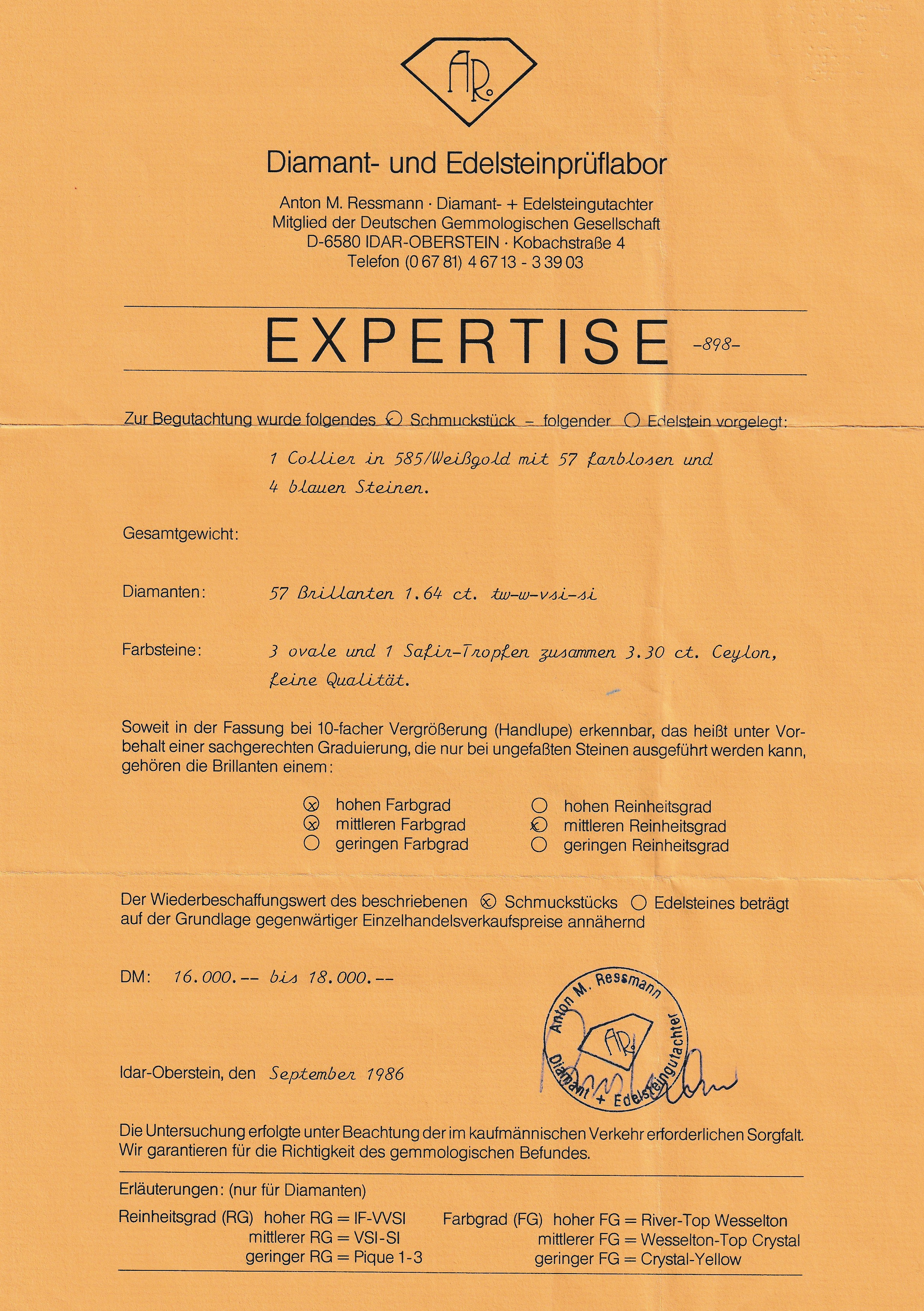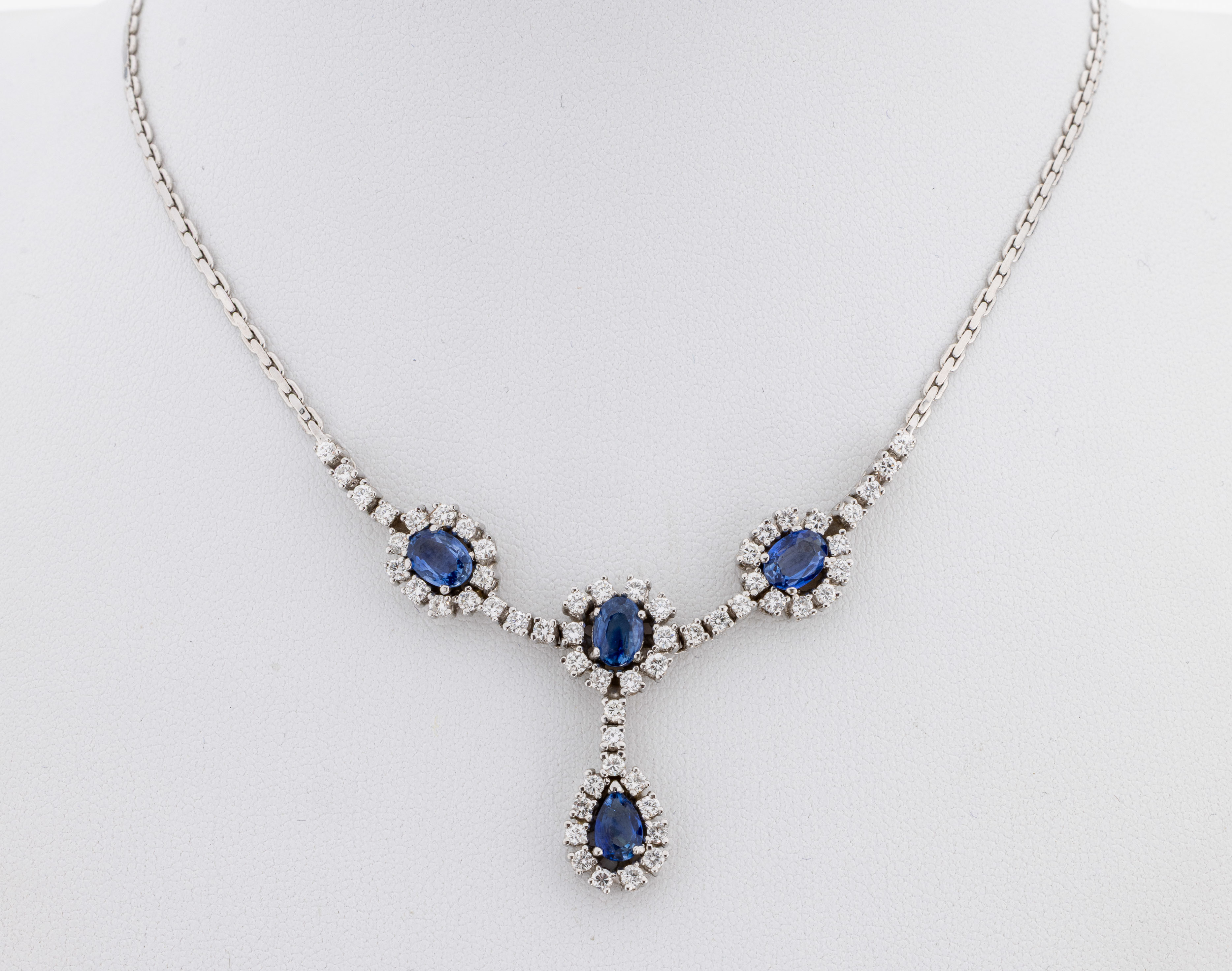 14 kt Gold Saphir-Brillant-Collier, WG 585/000, 3 ovalfacett. Saphire und facett.