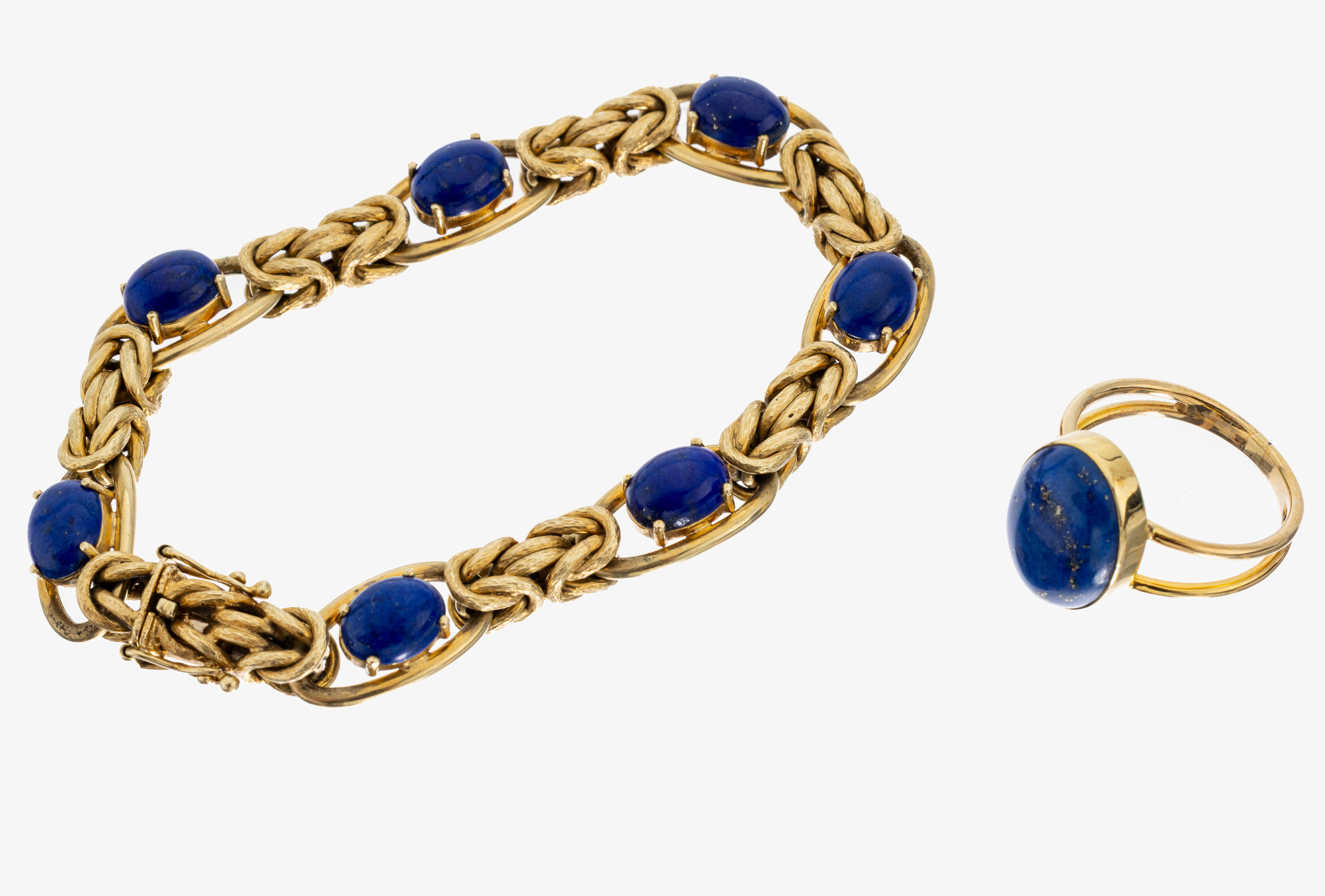und 1 Armband, L. ca. 19.5 cm, 7 ovale Lapislazulicabochons, Kastenschloss mit 2