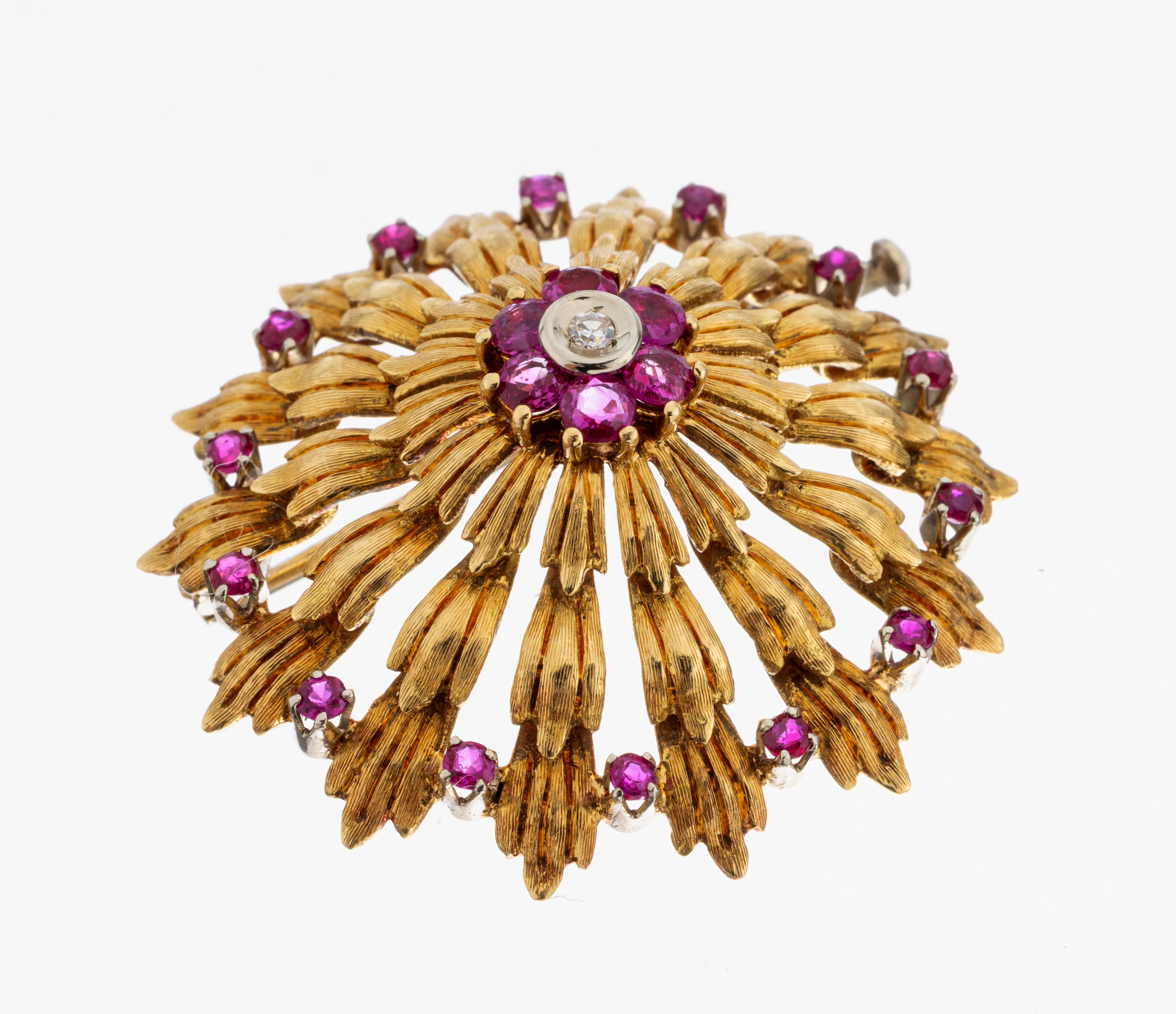 18 kt Gold Rubin-Diamant-Brosche, 1960er Jahre, GG 750/000, abstrakte Blüte, 20