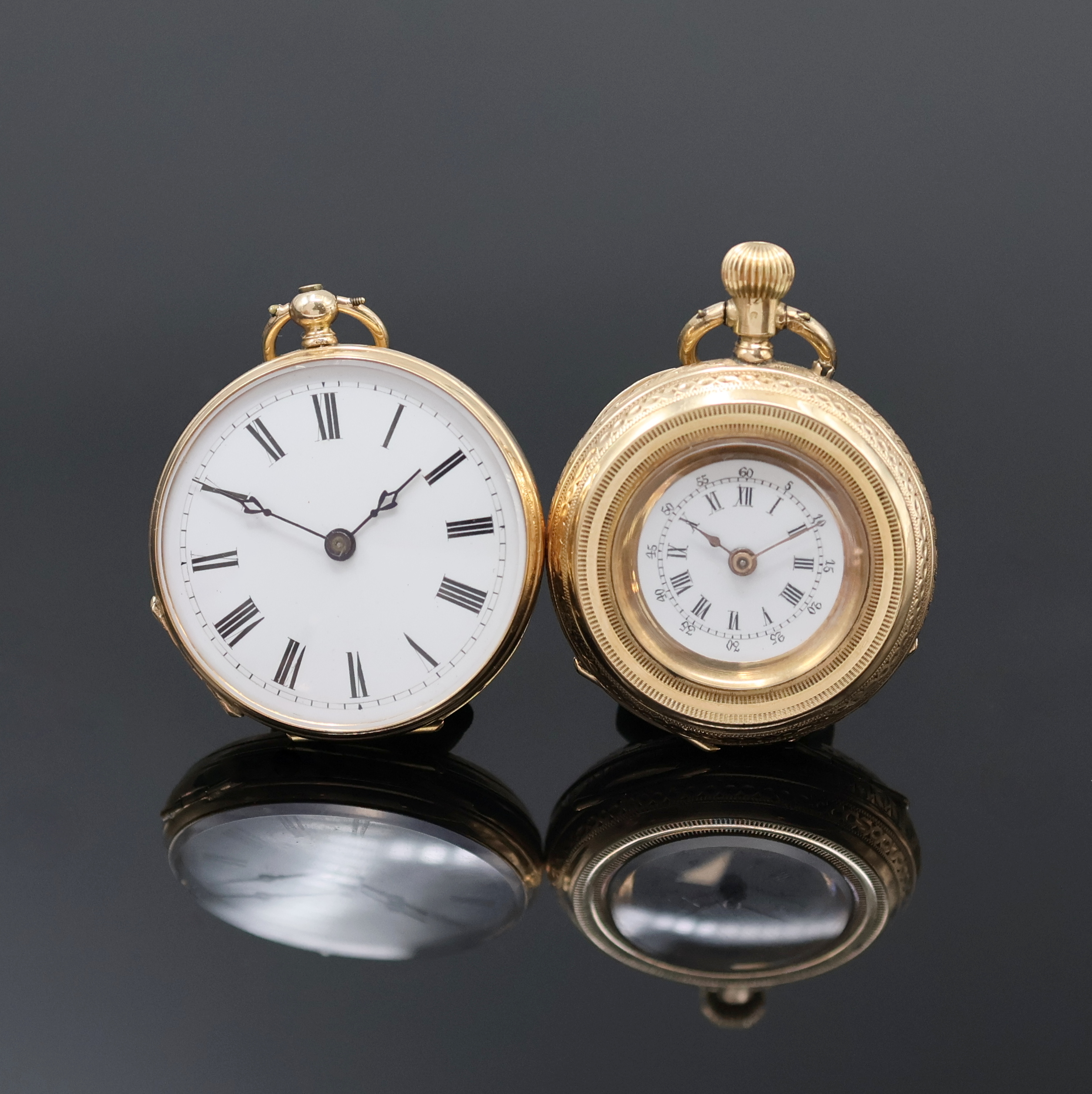 2 Offene Taschenuhren in GG 585/000, Schweiz um 1890/1910, 1x Schlüsselaufzug, teils