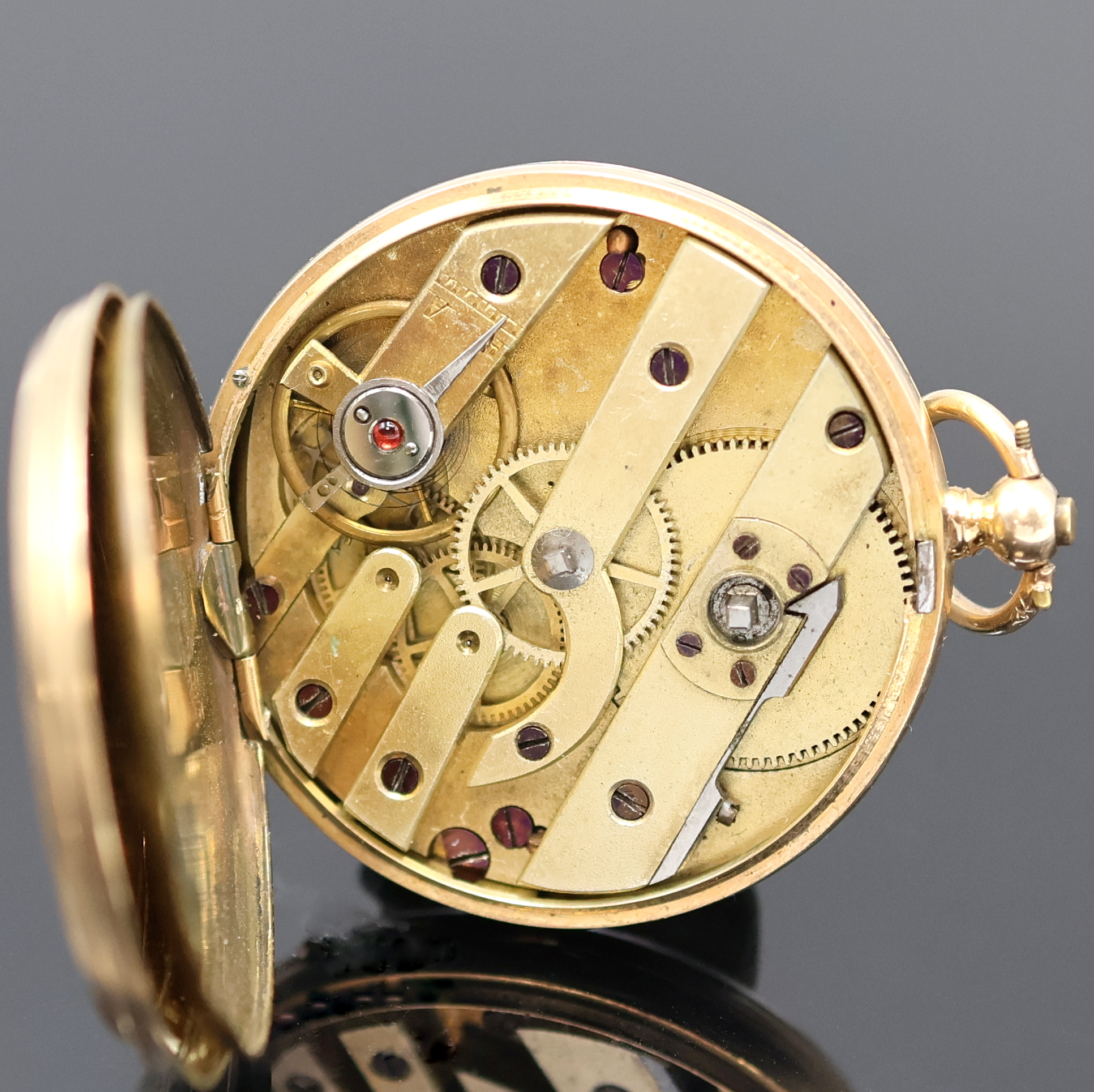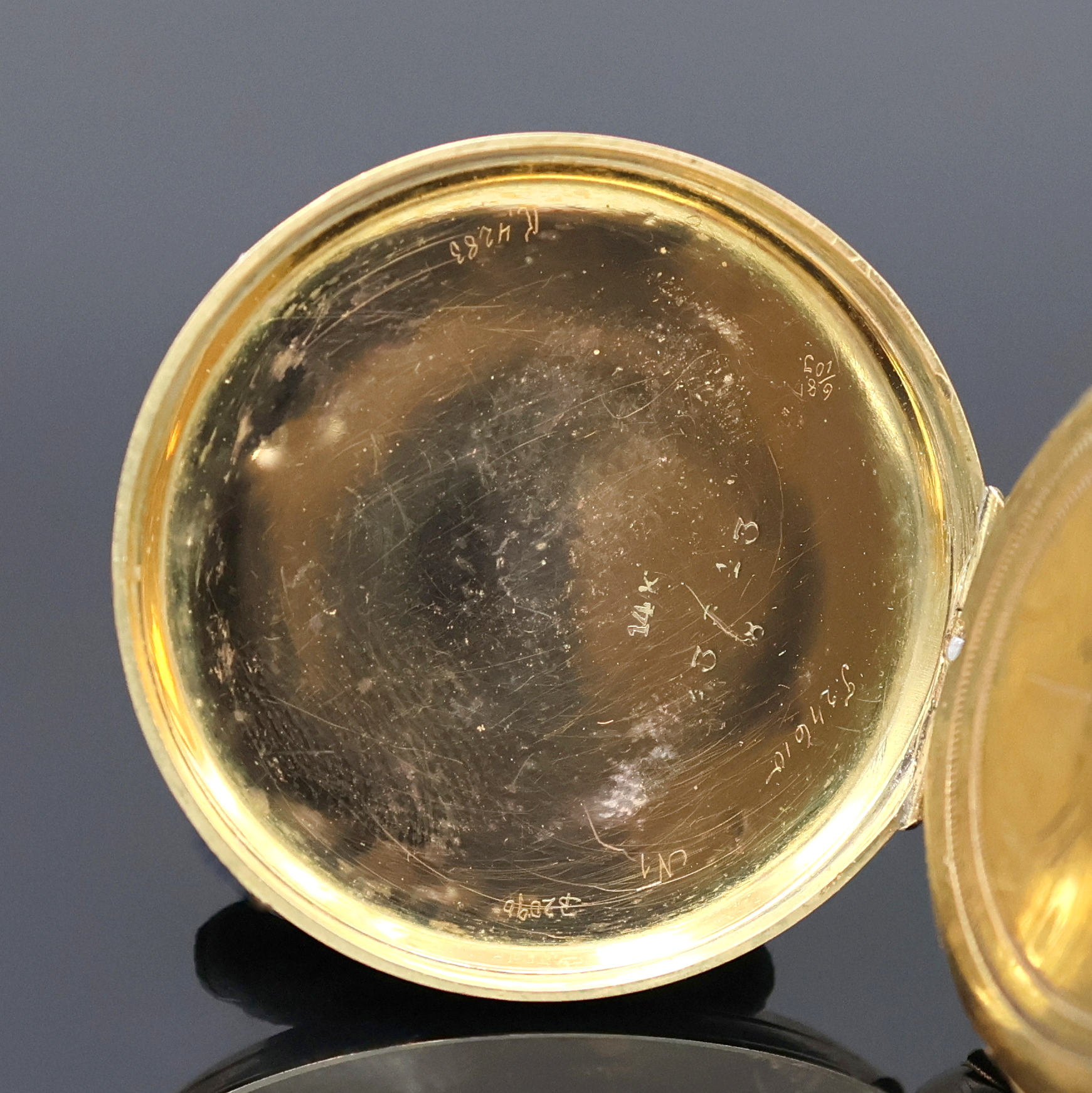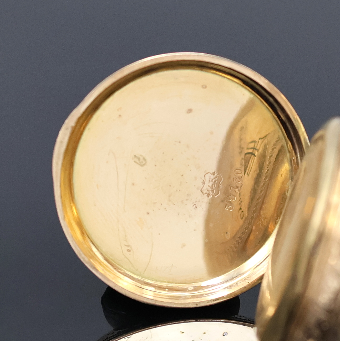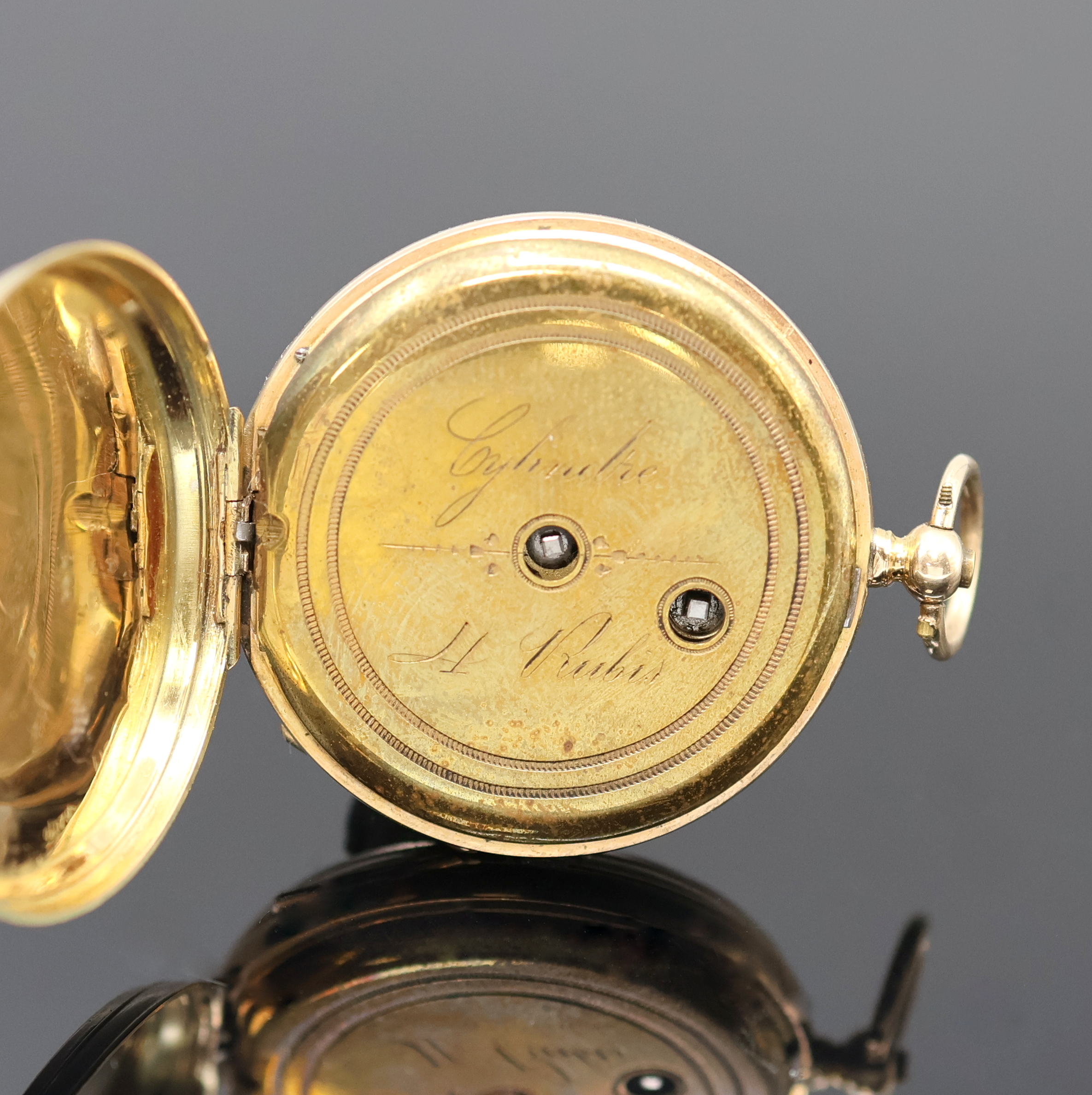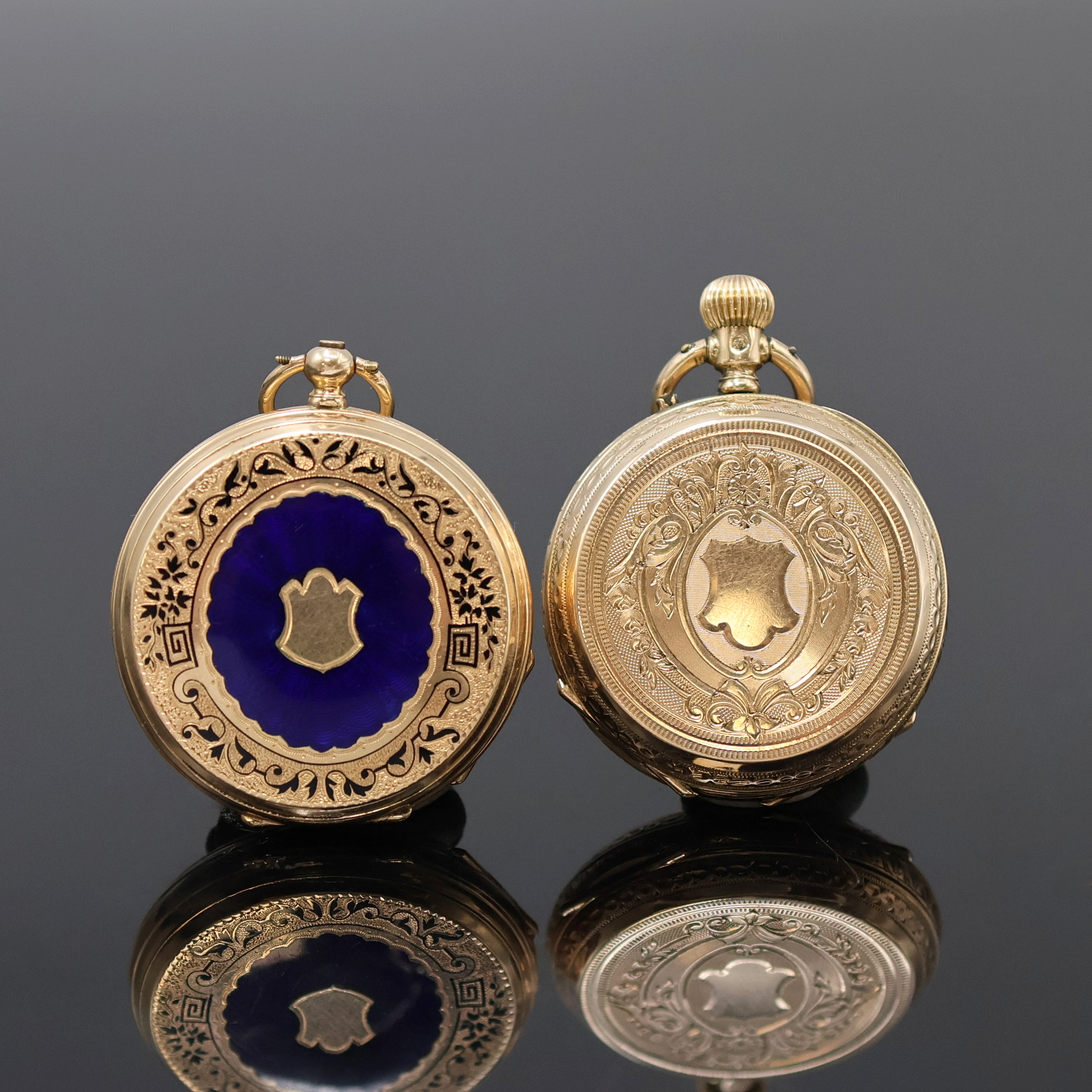 grav. Gehäuse dell., Monogrammspiegel, 1x emaill., Emailzifferblätter l. riss.,