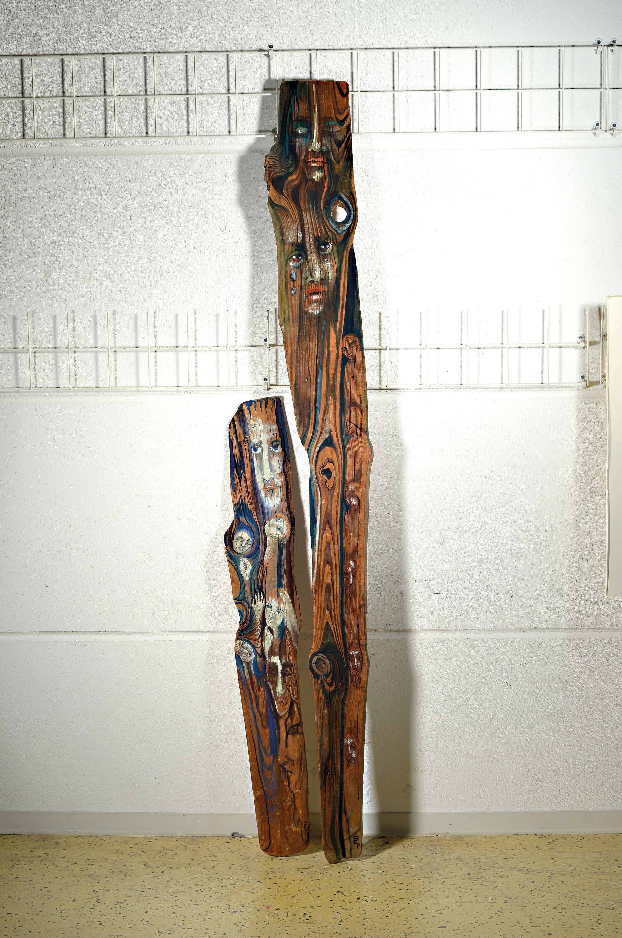 SEP, ungedeuteter Künstler des 20./21.Jh., zwei Treibholz-Stelen, handbemalt, monogrammiert,