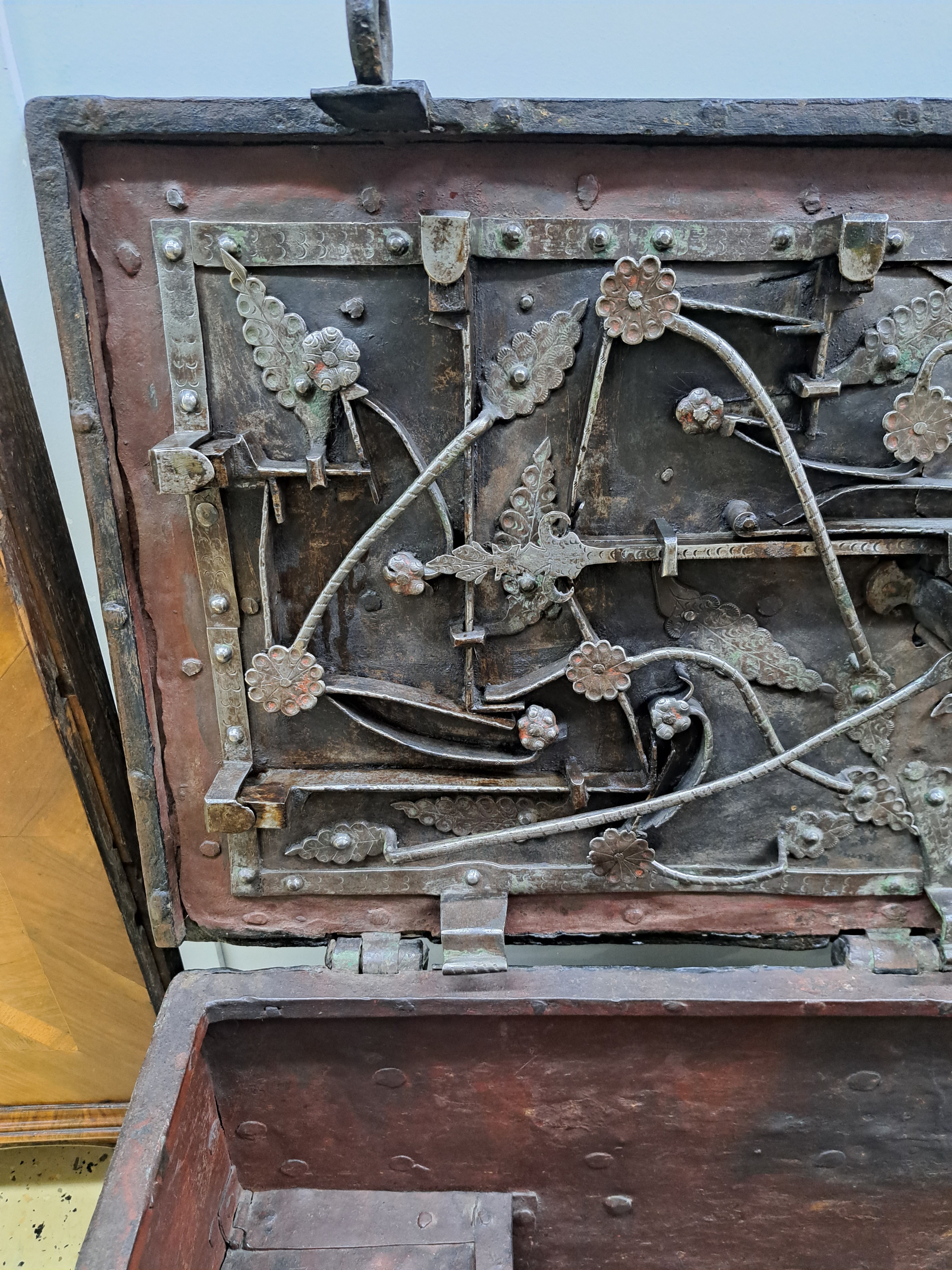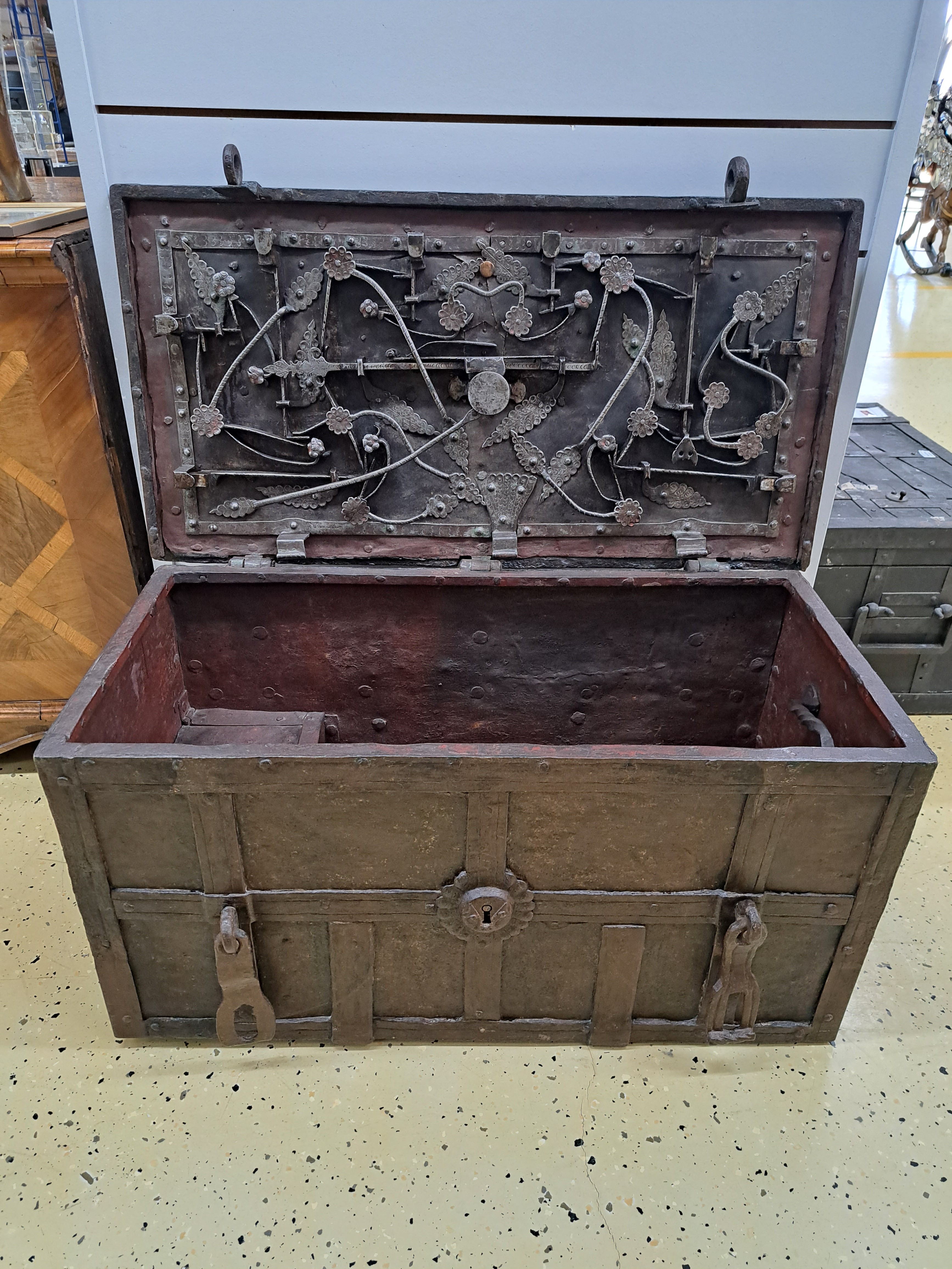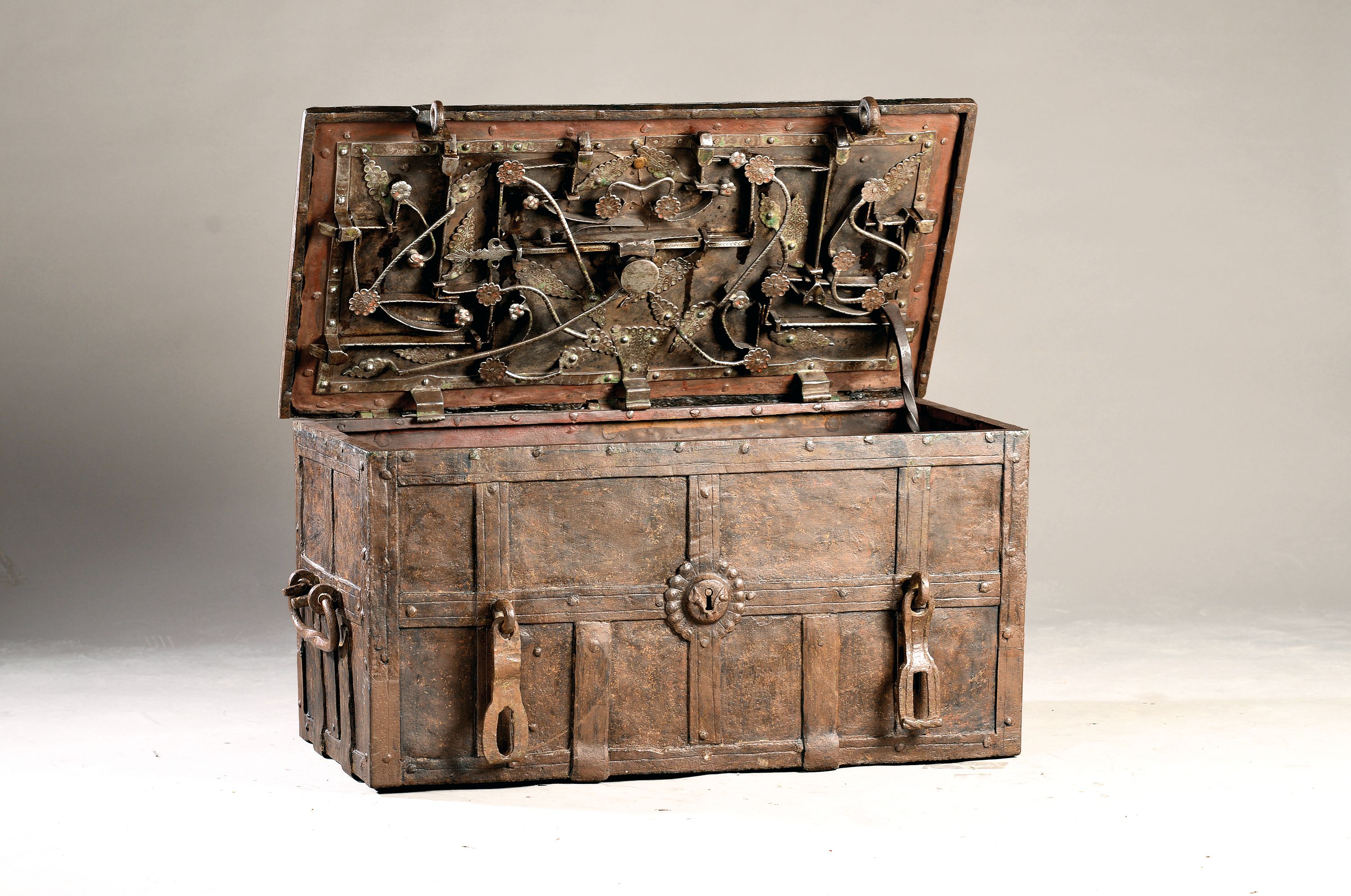 Große Eisenkassette/Kriegskassette um 1680- 1720, gebändert und genietet, aufwendiges