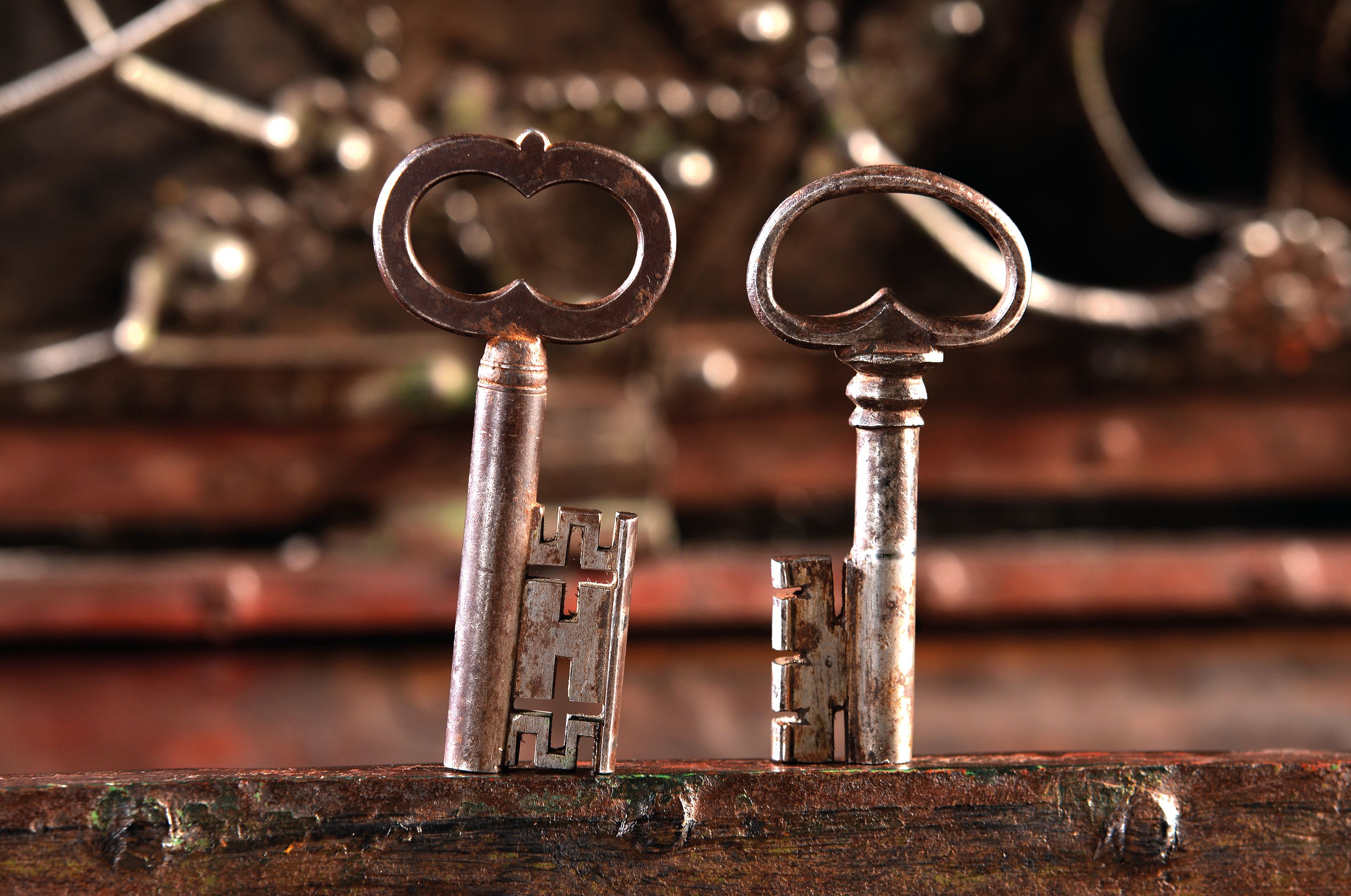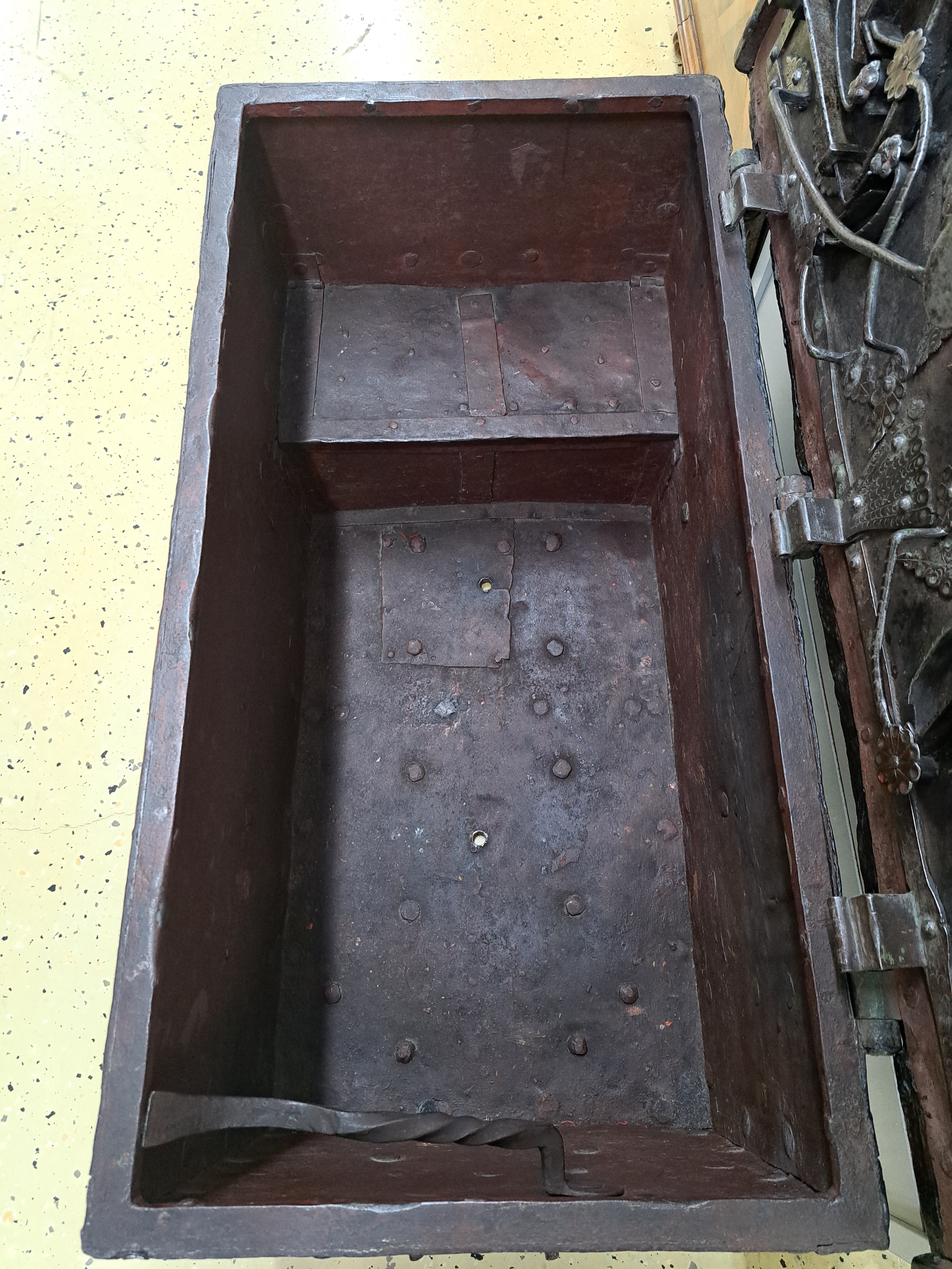 innen kleines abschließbares Fach mit orig. Schlüssel, orig. Truhenschlüssel,