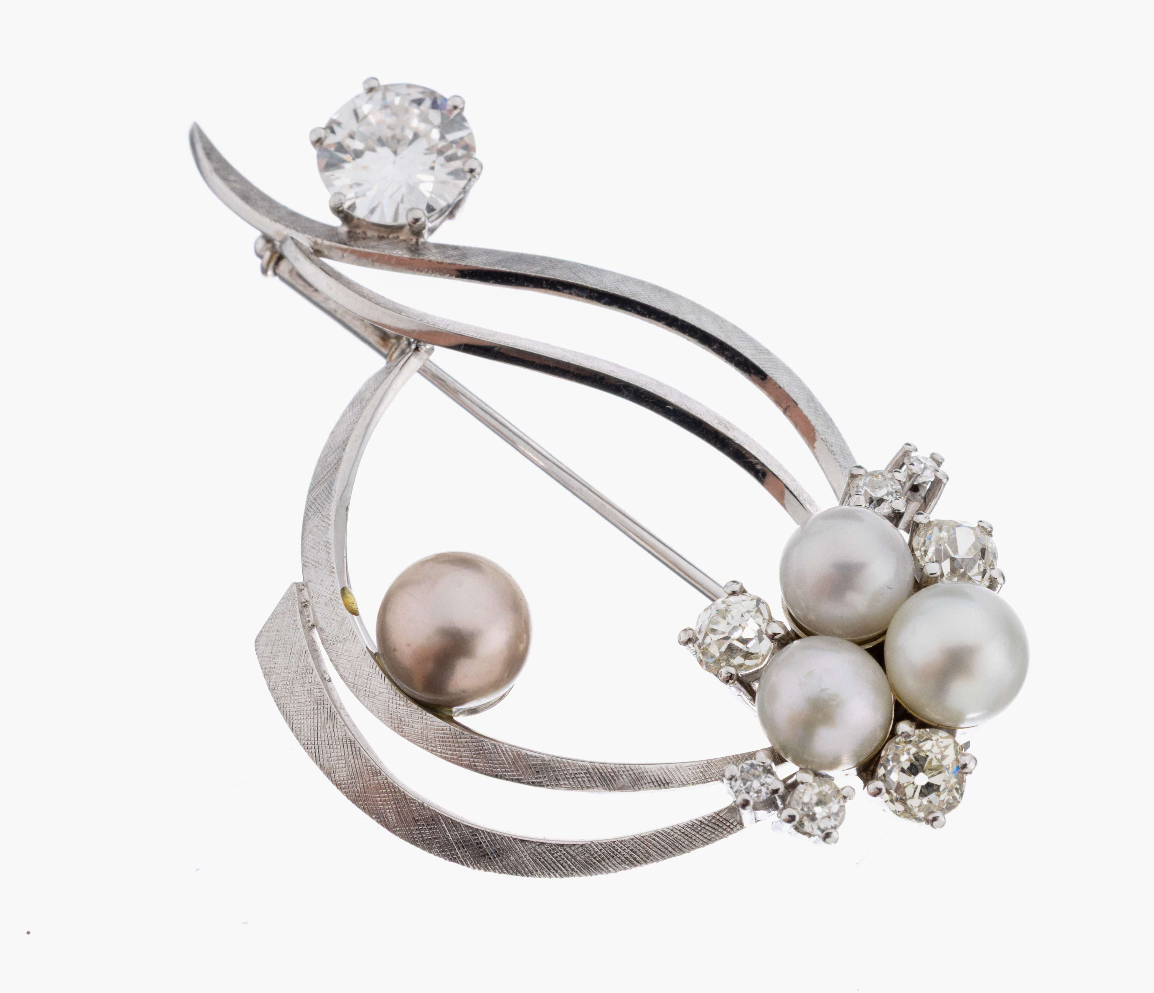18 kt Gold Perl-Diamant-Brosche, WG 750/000, geschwungene Gestaltung, 4 Zuchtperlen,