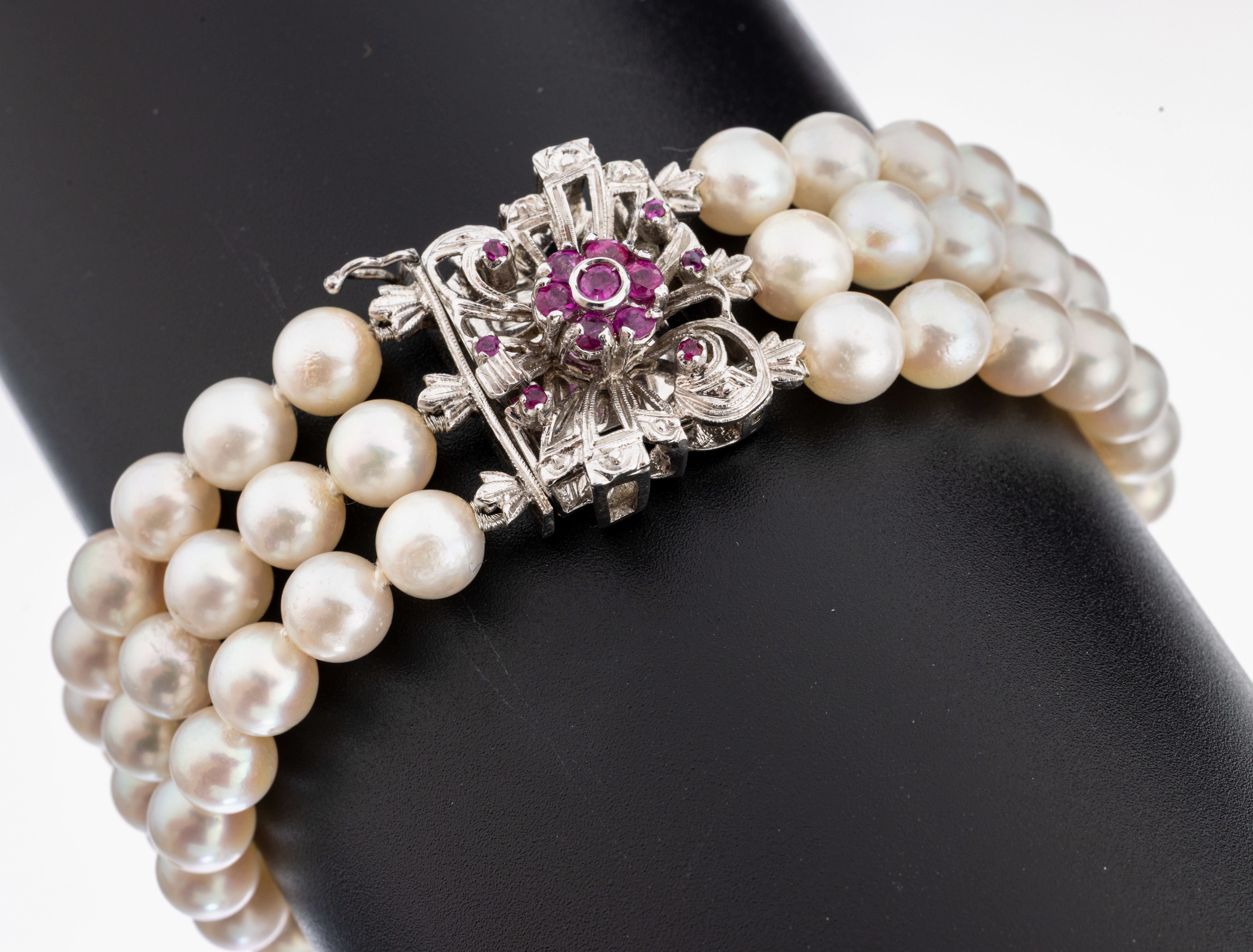 18 kt gold pearl-diamond-ruby-bracelet , WG 750/000, 3-rows cultured akoya pearls,