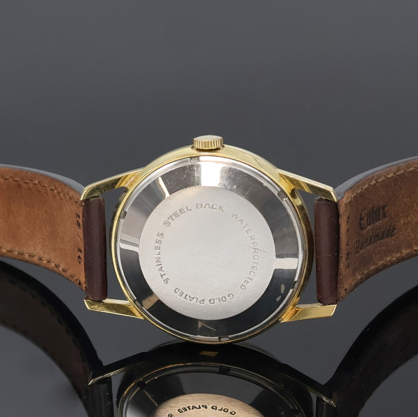1 x self winding, gold-plated case, screwed down stainless steel case-back, silvered