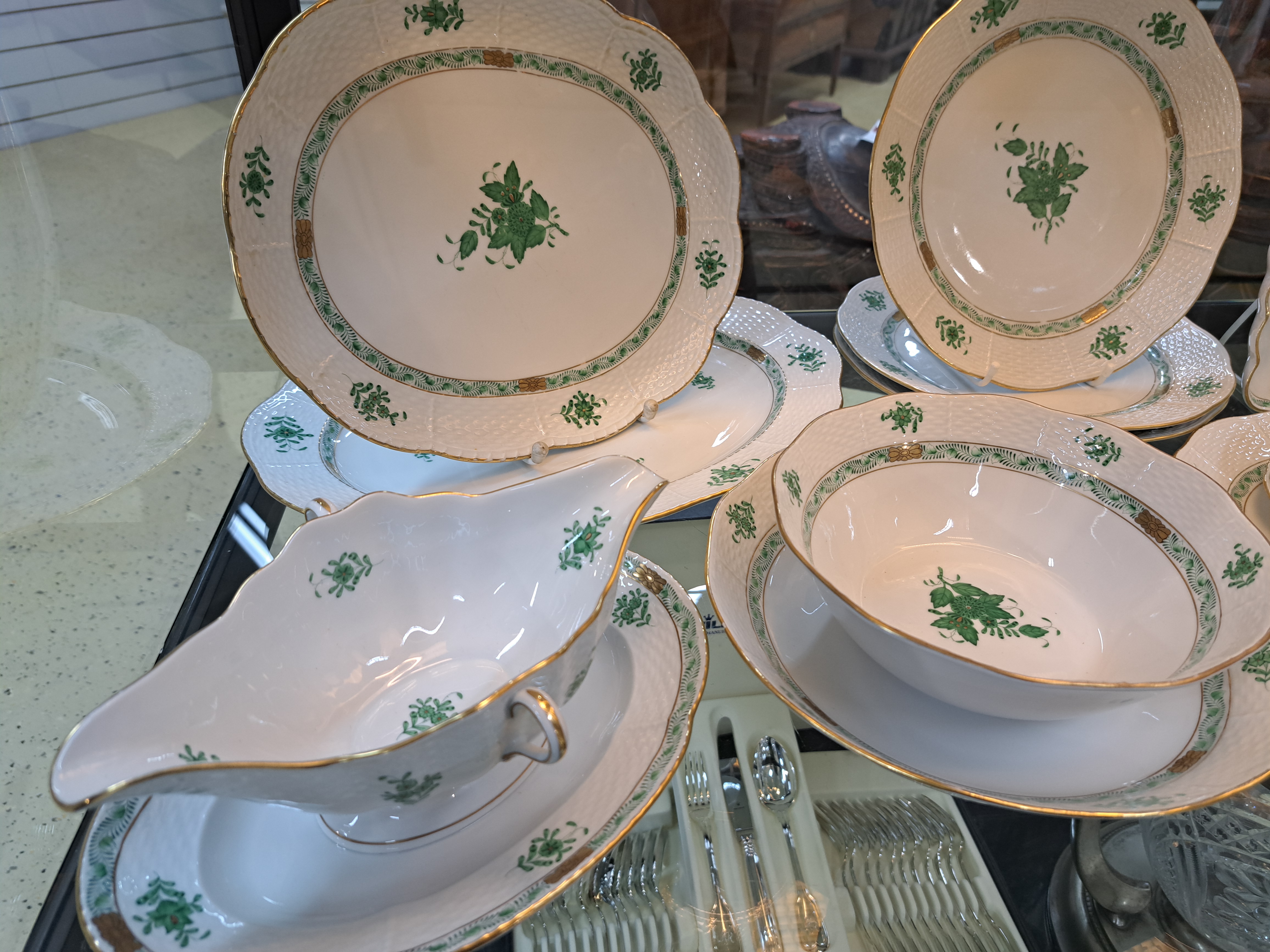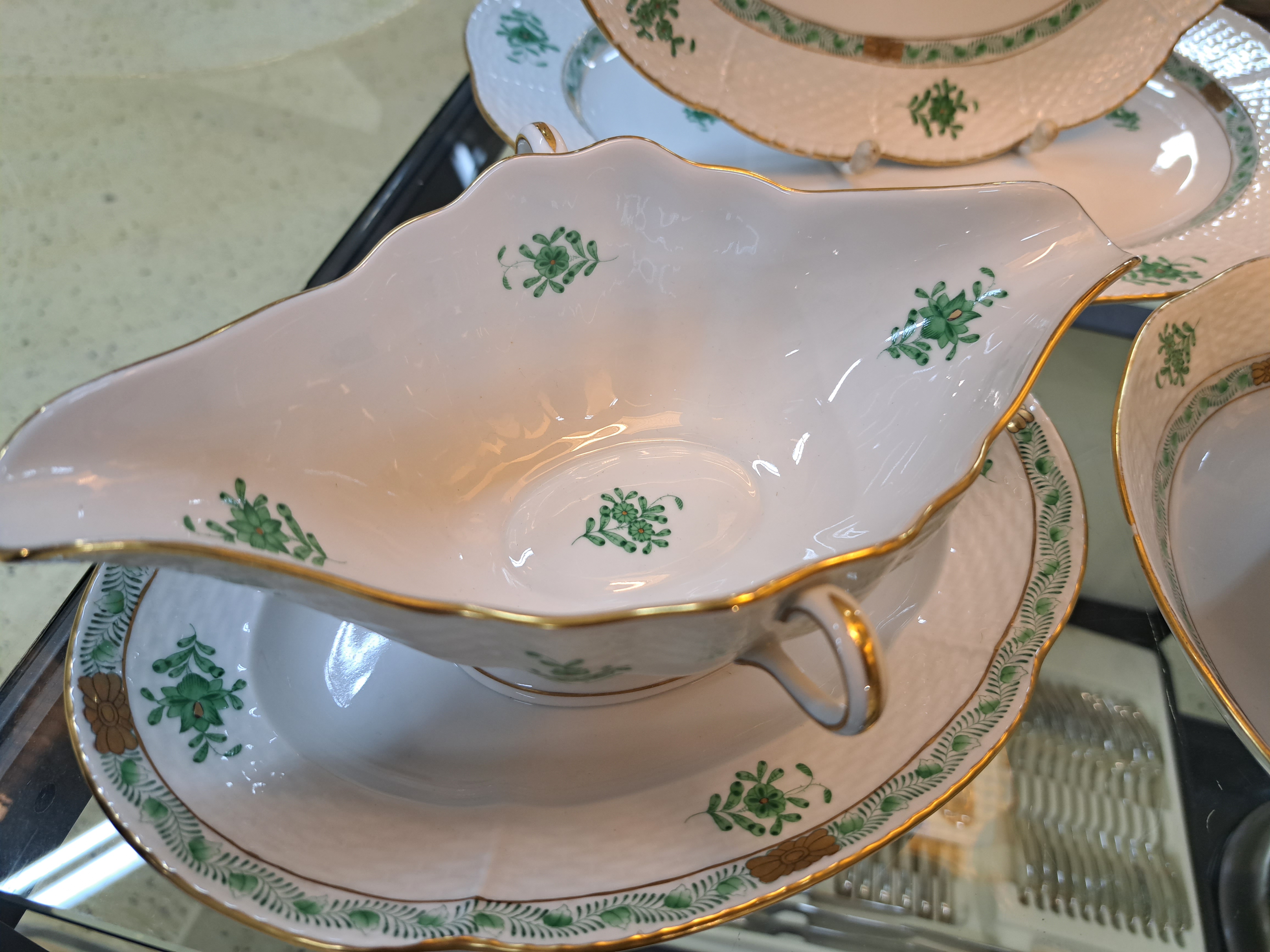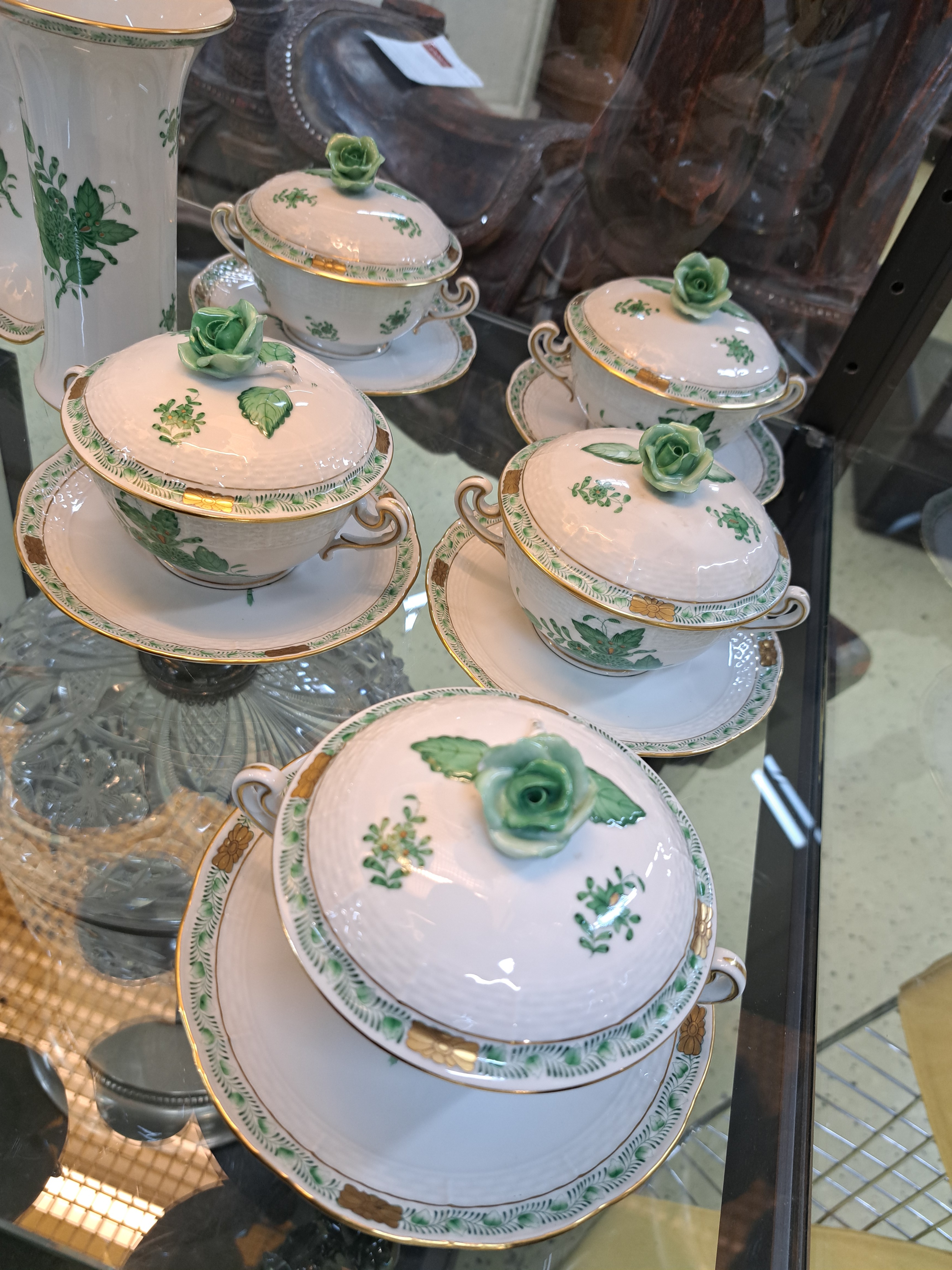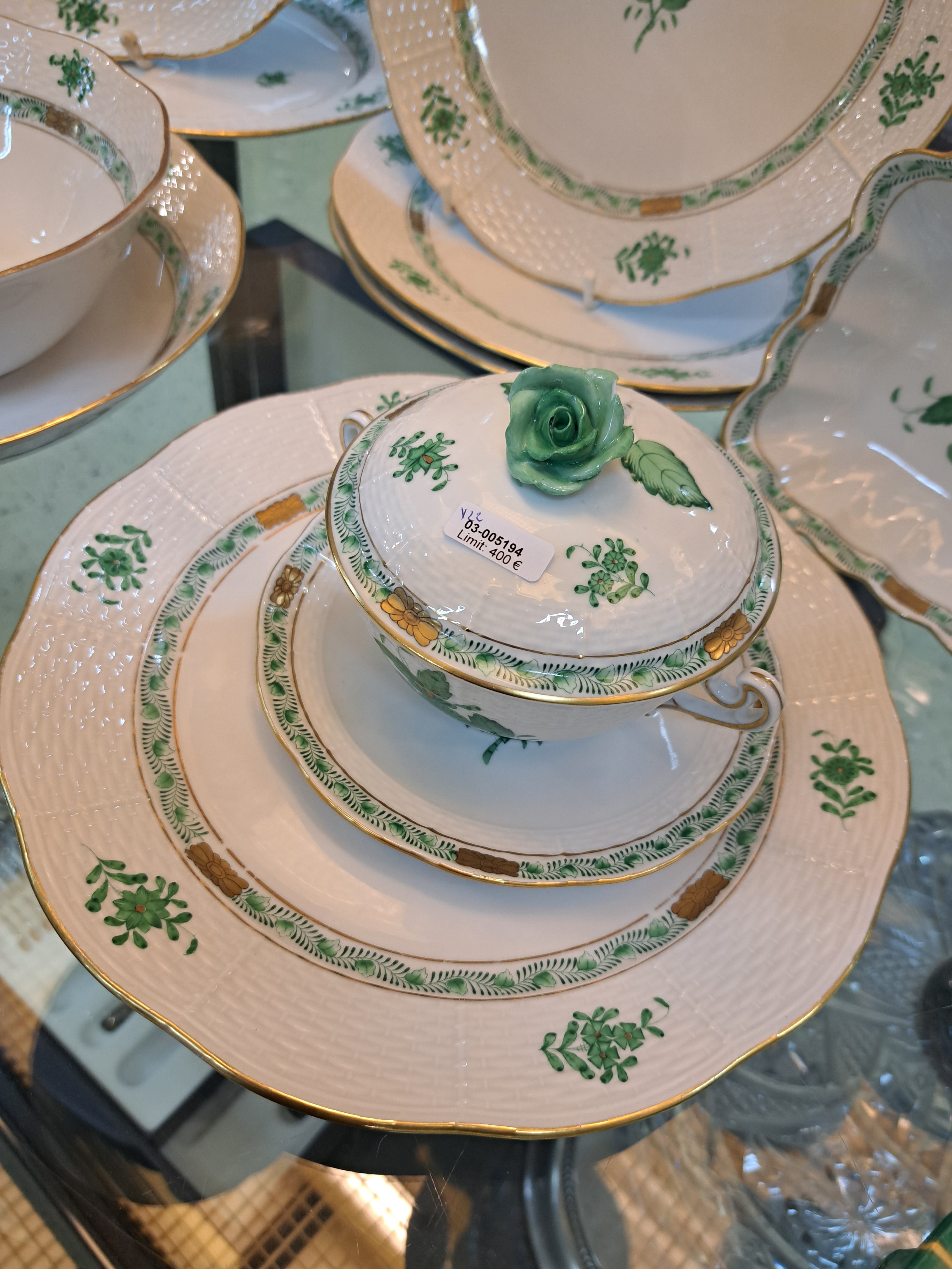 Speiseservice, Herend, Apponiy, grün, 20. Jh. , 6 Deckelsuppentassen mit Untertassen,