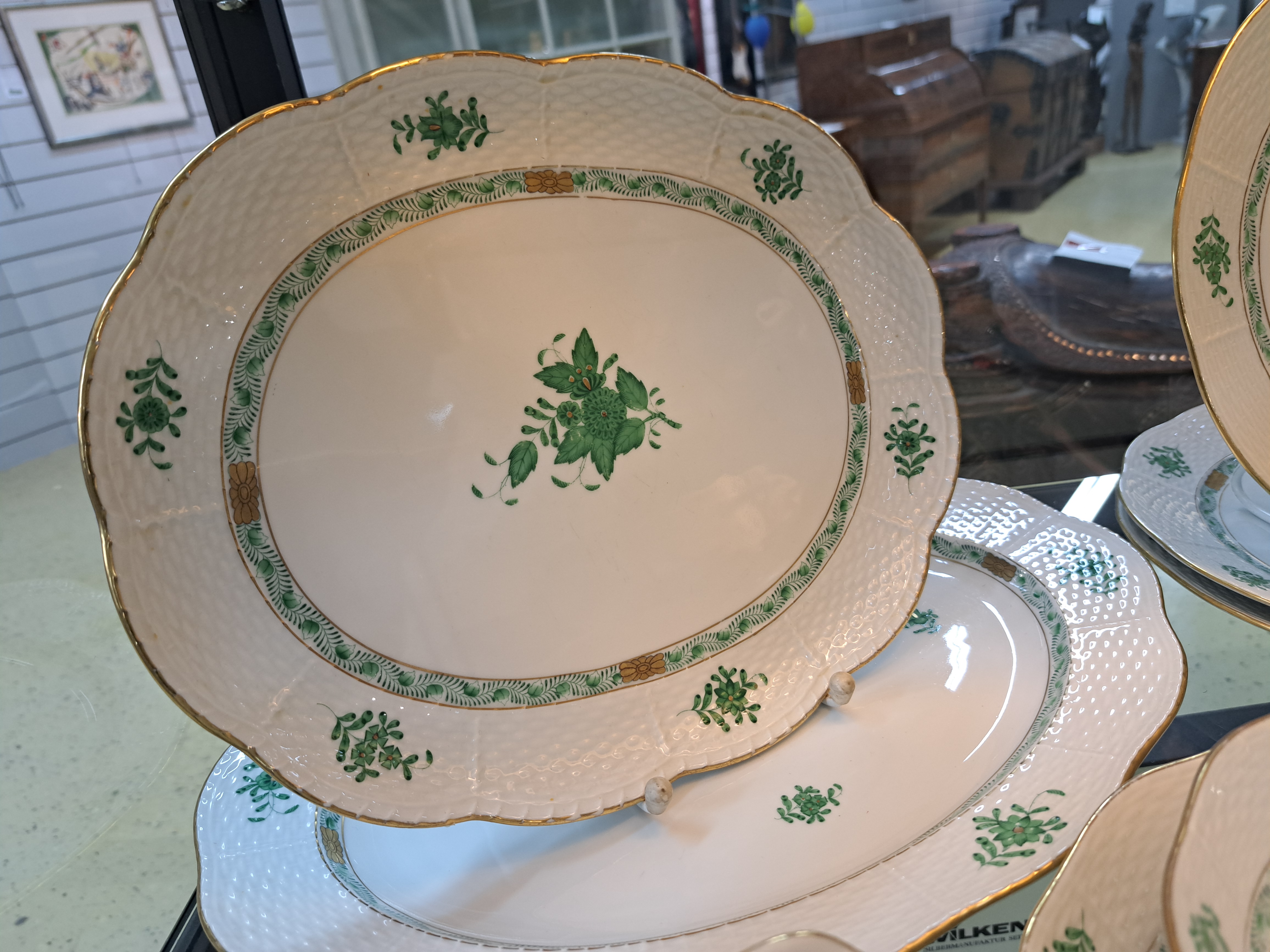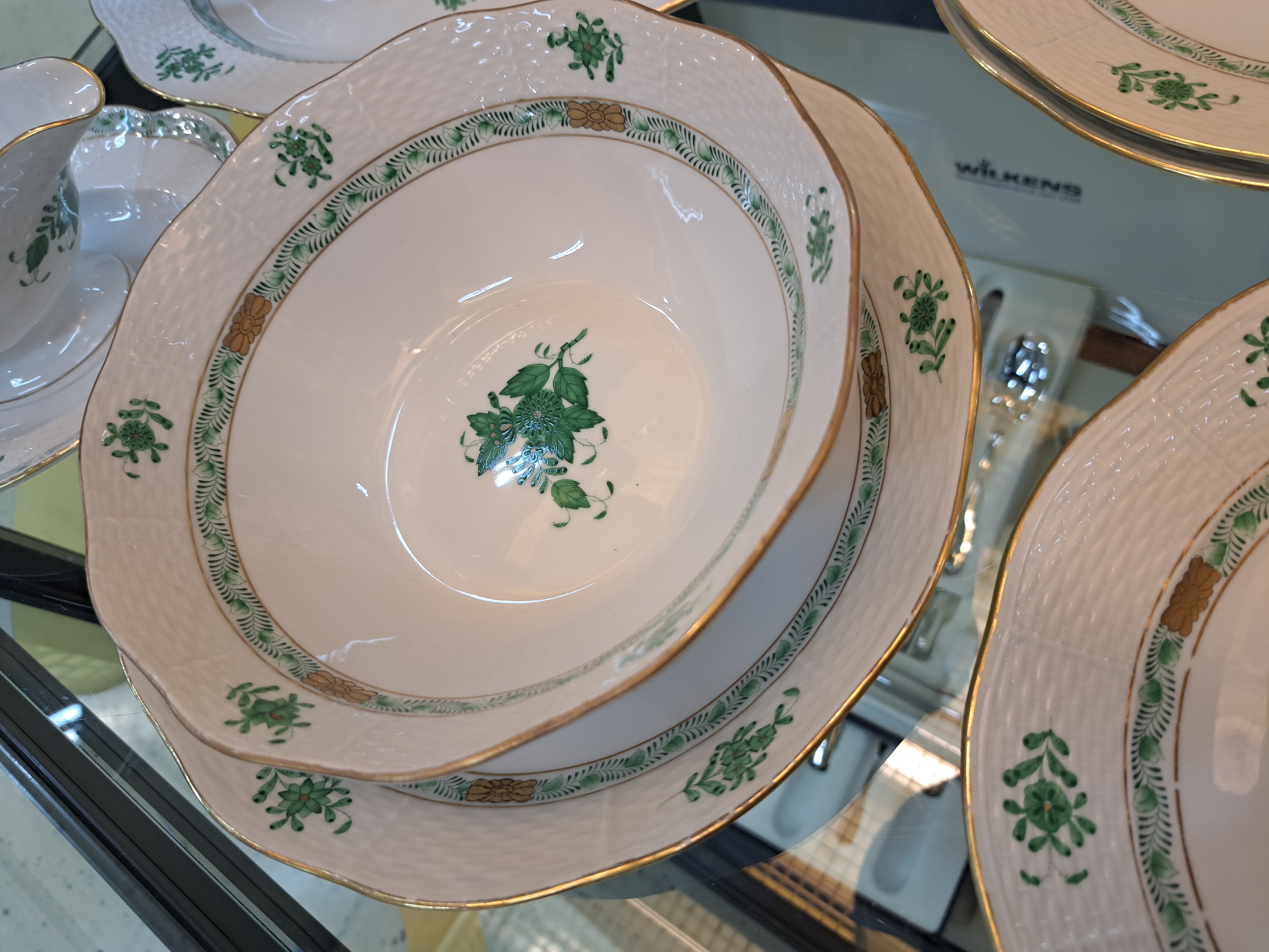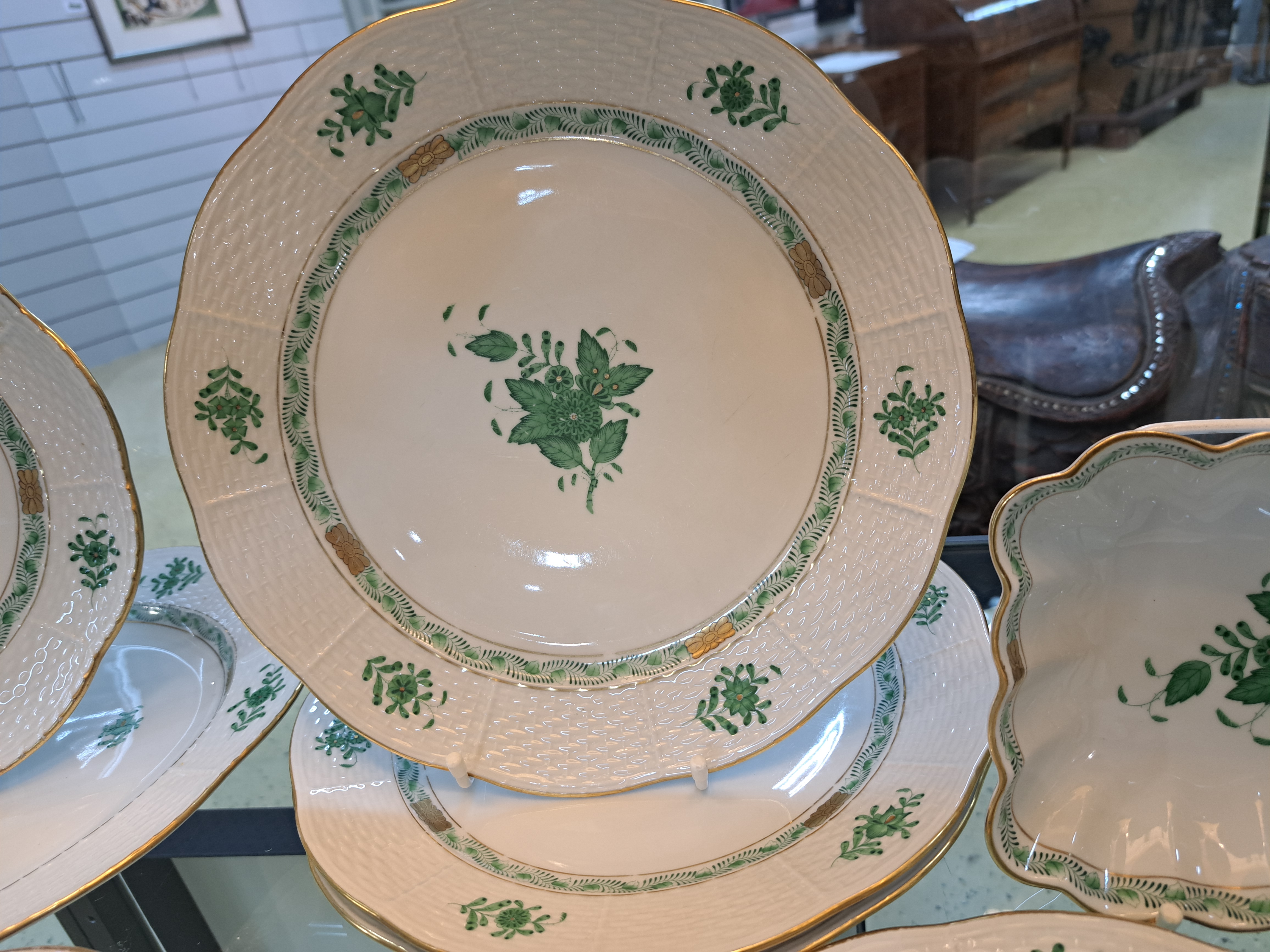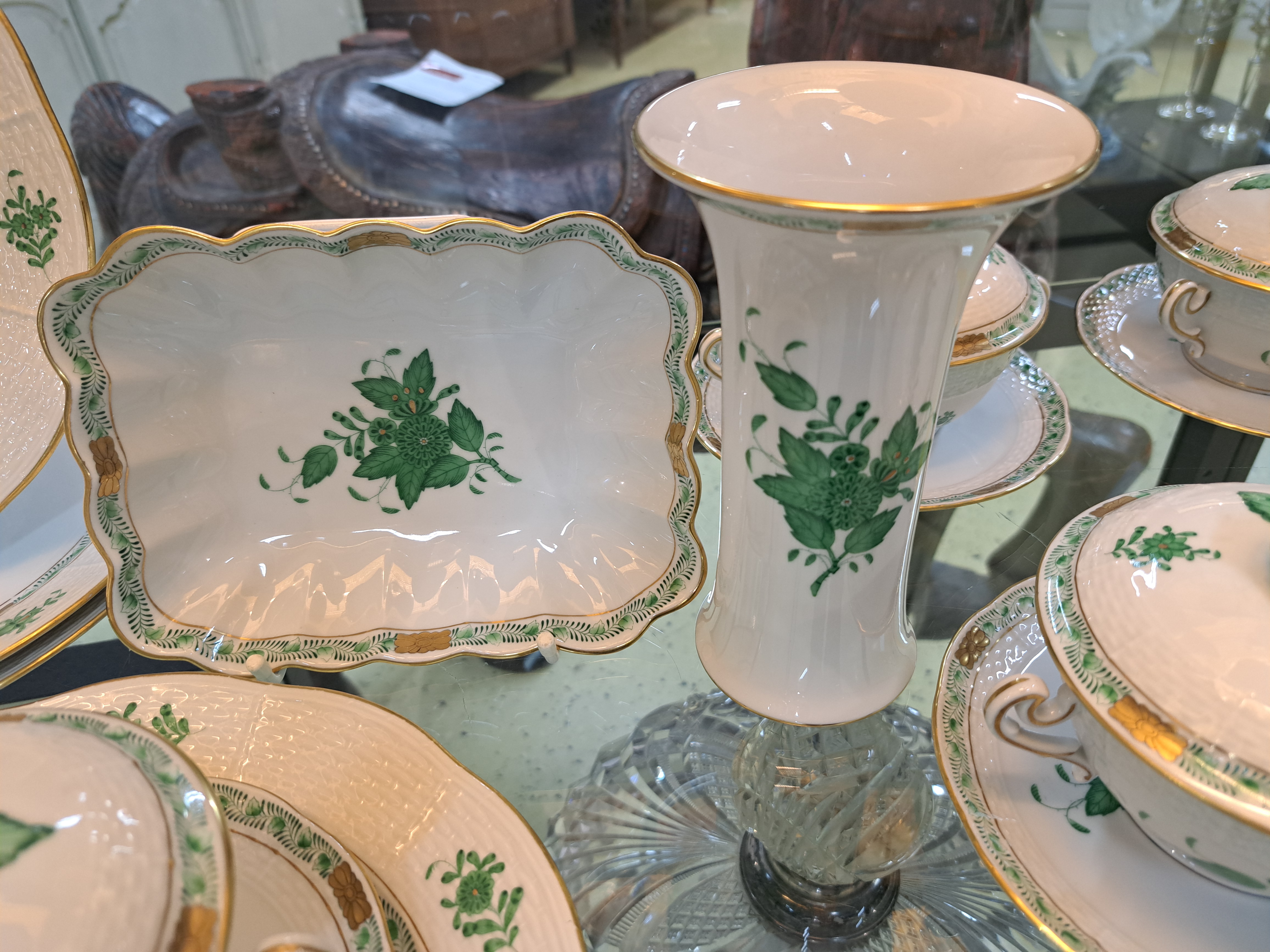 Speiseservice, Herend, Apponiy, grün, 20. Jh. , 6 Deckelsuppentassen mit Untertassen,