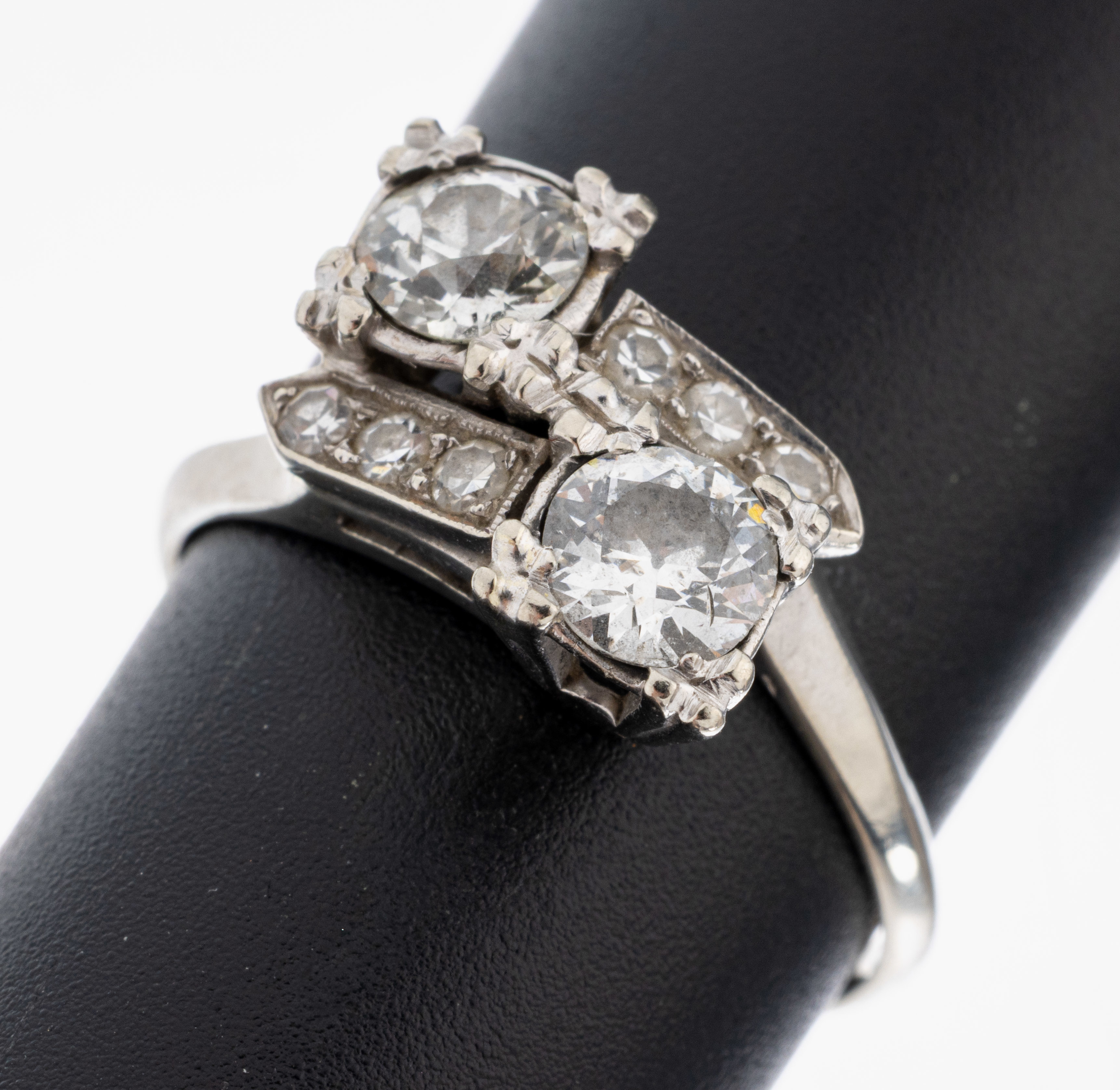 14 kt Gold Diamant-Ring, 1930er Jahre, WG 585/000, gegenläufig gearbeitet, 2 Altschliffdiamanten