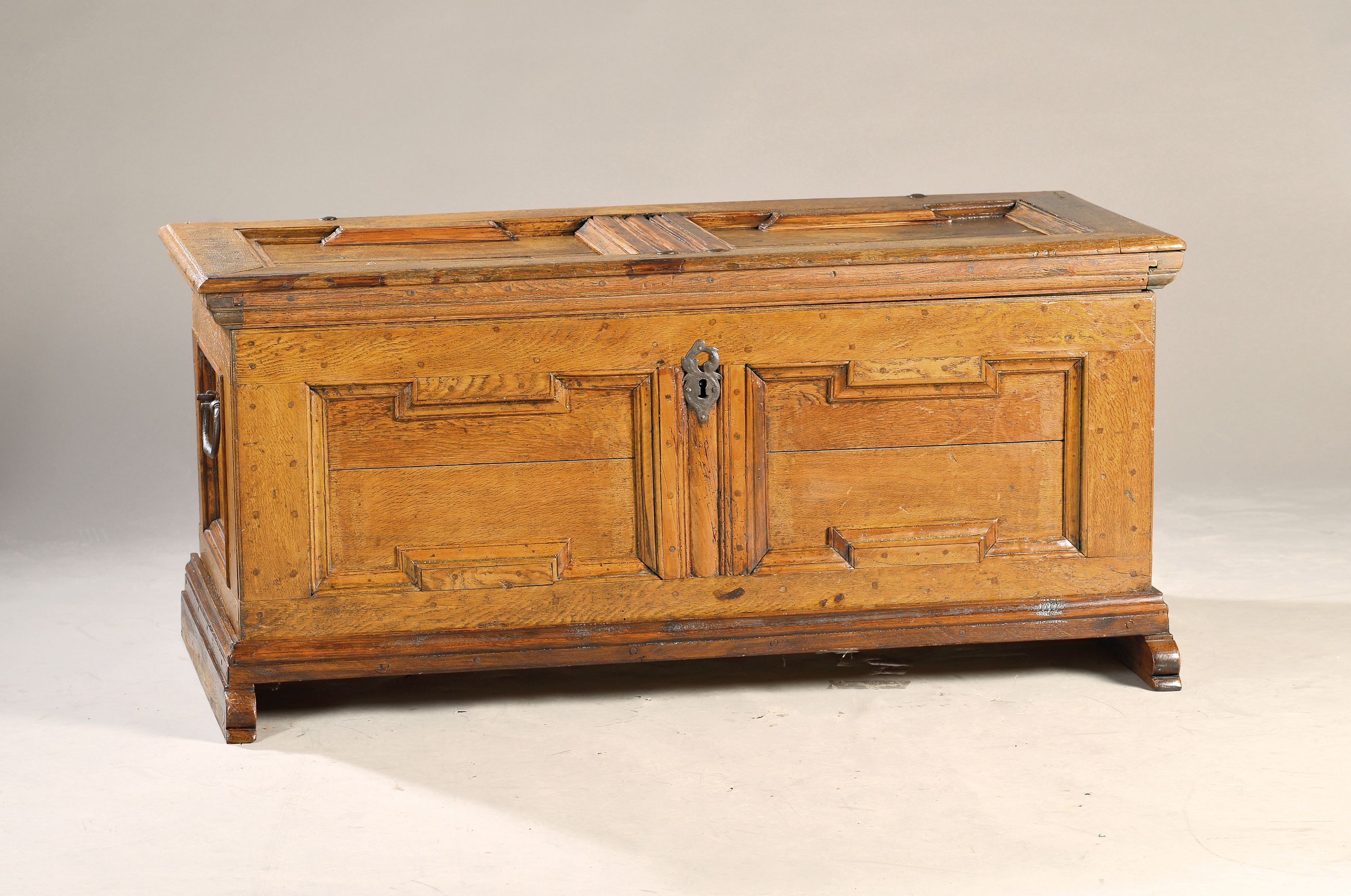 Barock-Truhe, um 1740/50, Eiche massiv, Deckel,Front und Seiten verkröpft, Fläche
