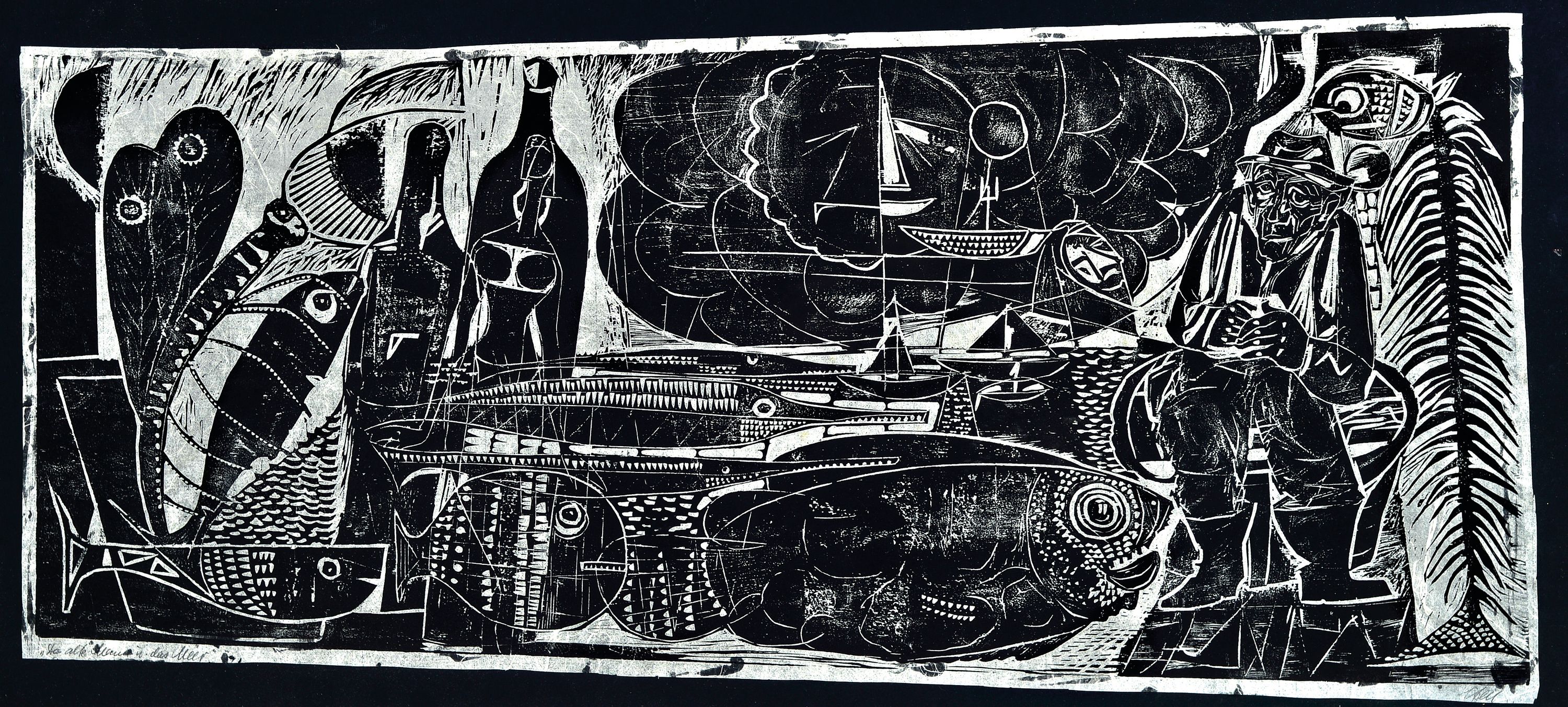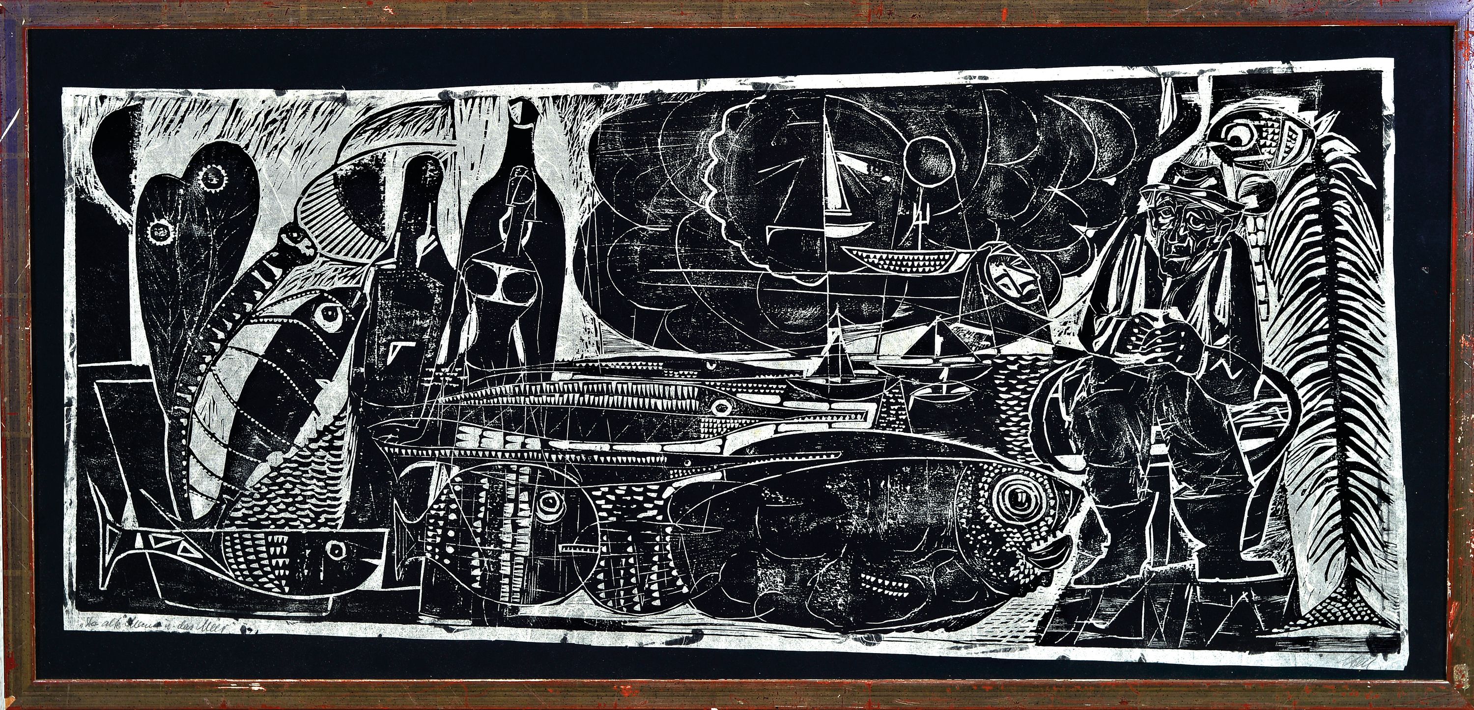 Mann und das Meer", unter Glas gerahmt, 47x98 cm
