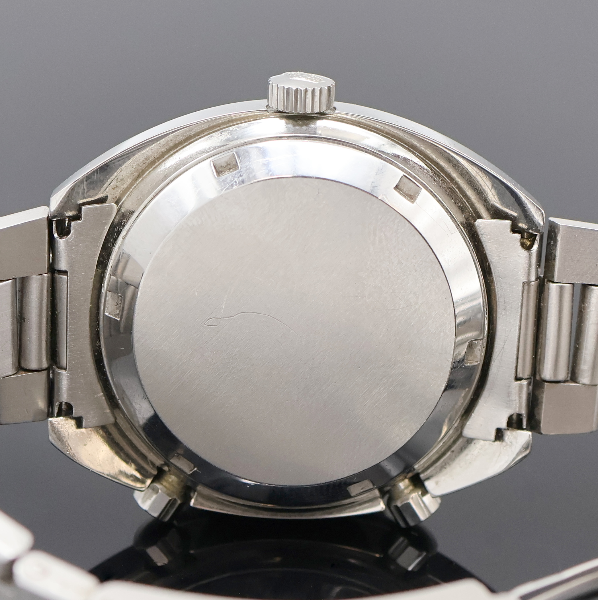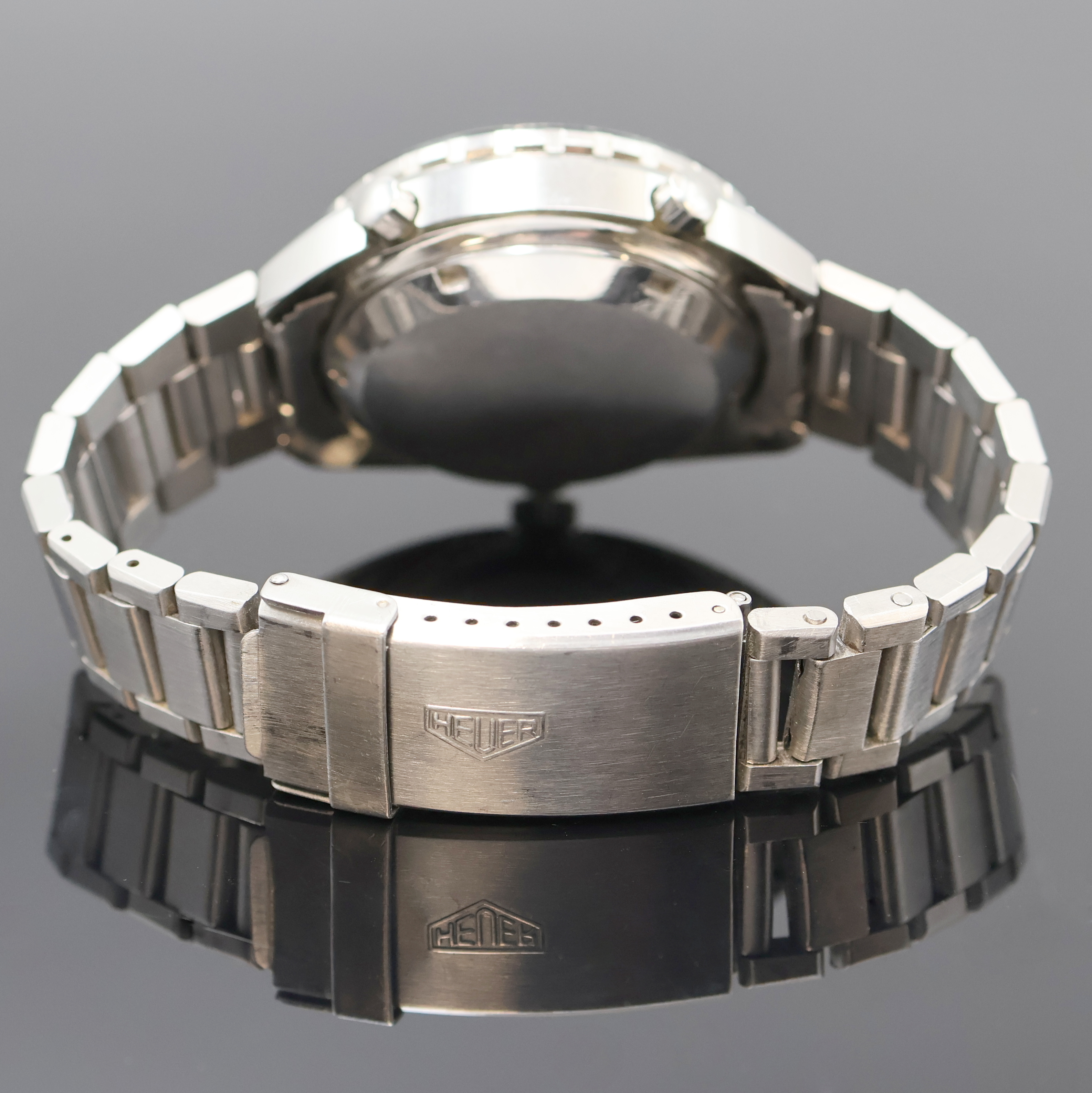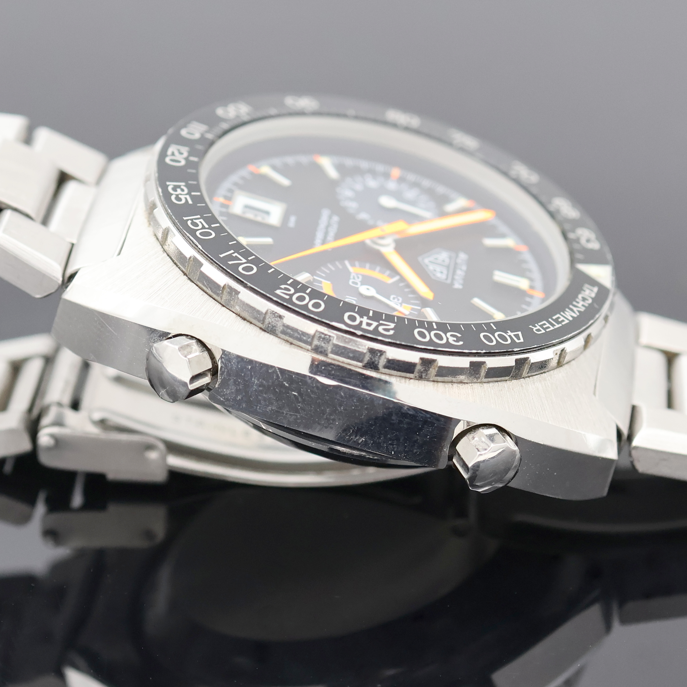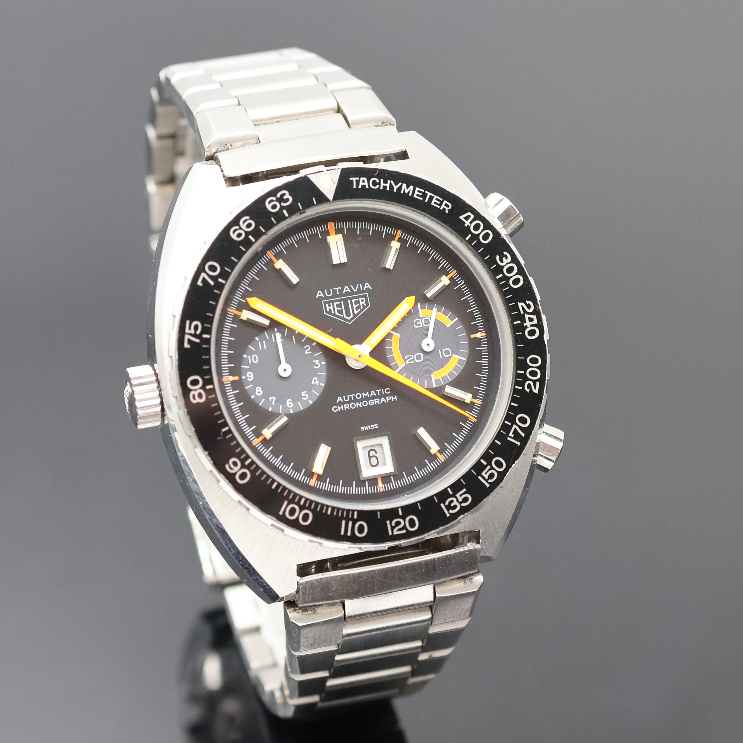 HEUER Autavia "Orange Boy" rare chronograph reference 11630, self winding, Switzerland around 1975, stainless steel case including original bracelet with deployant clasp, screwed down case back, original winding crown and pusher, bidirectional revolving tachymeter-bezel, gray sub-dials, date at 6, orange hands, gold-plated movement calibre 12, 17 jewels, precision adjustment, diameter approx. 42 mm, length approx. 21 cm, condition 2, property of a collector