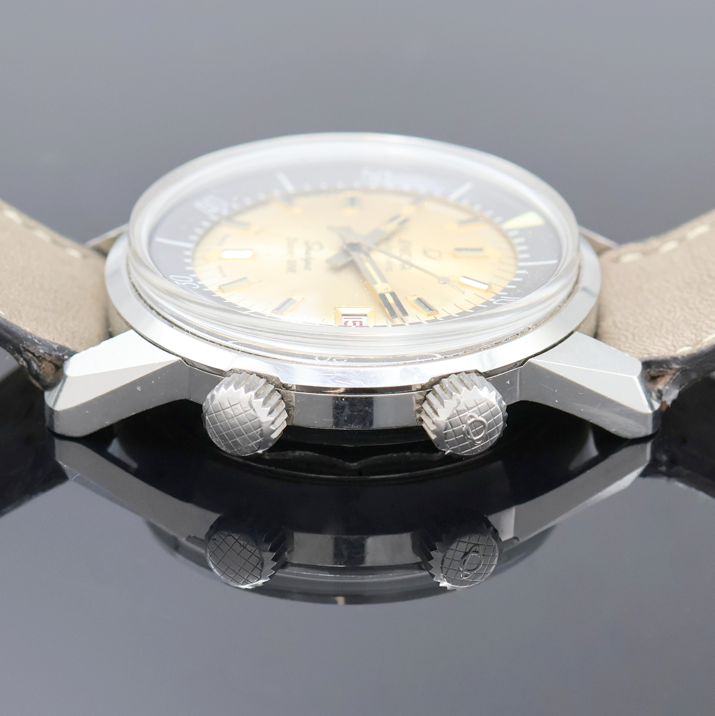 Geh. m. Bajonette-Verschluß, innen-liegende Lünette drehb. d. Krone b. 2, Zifferbl.