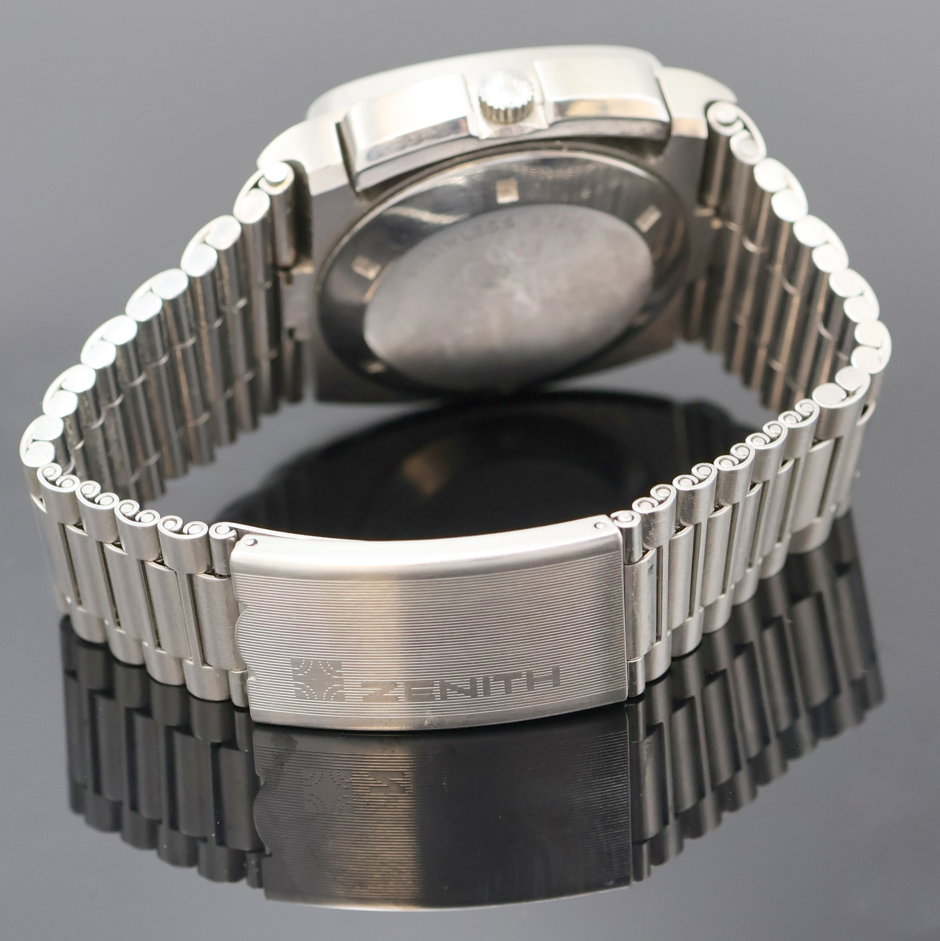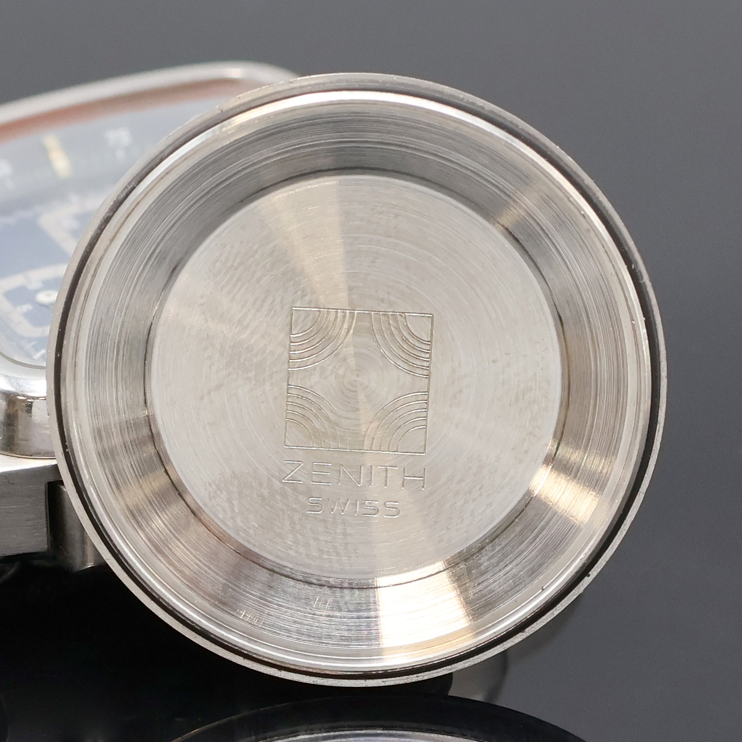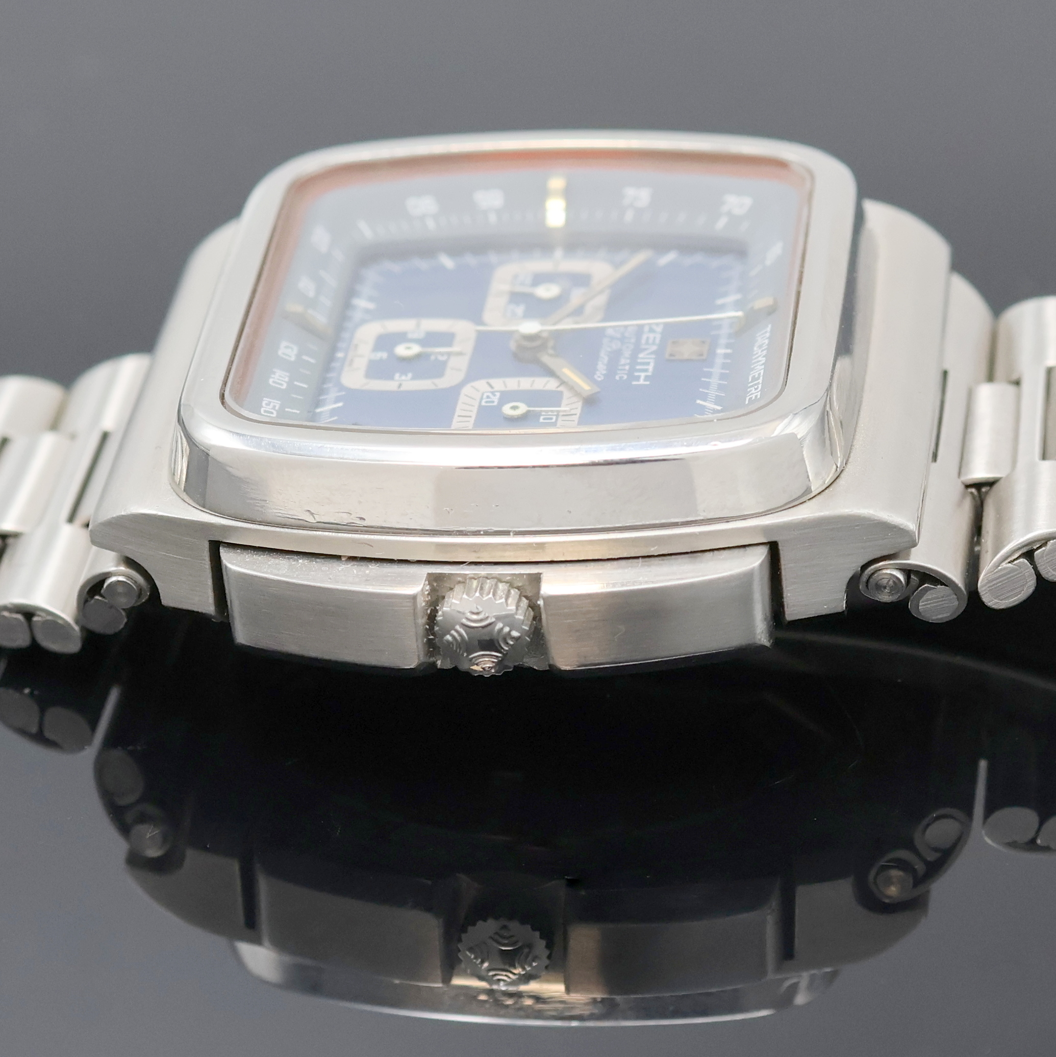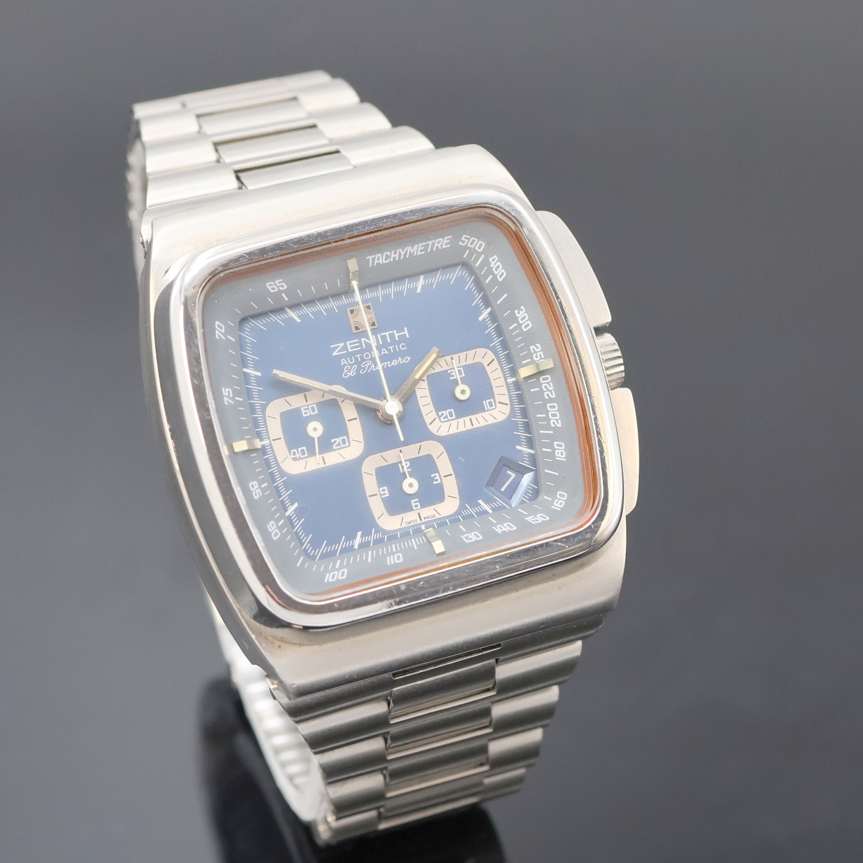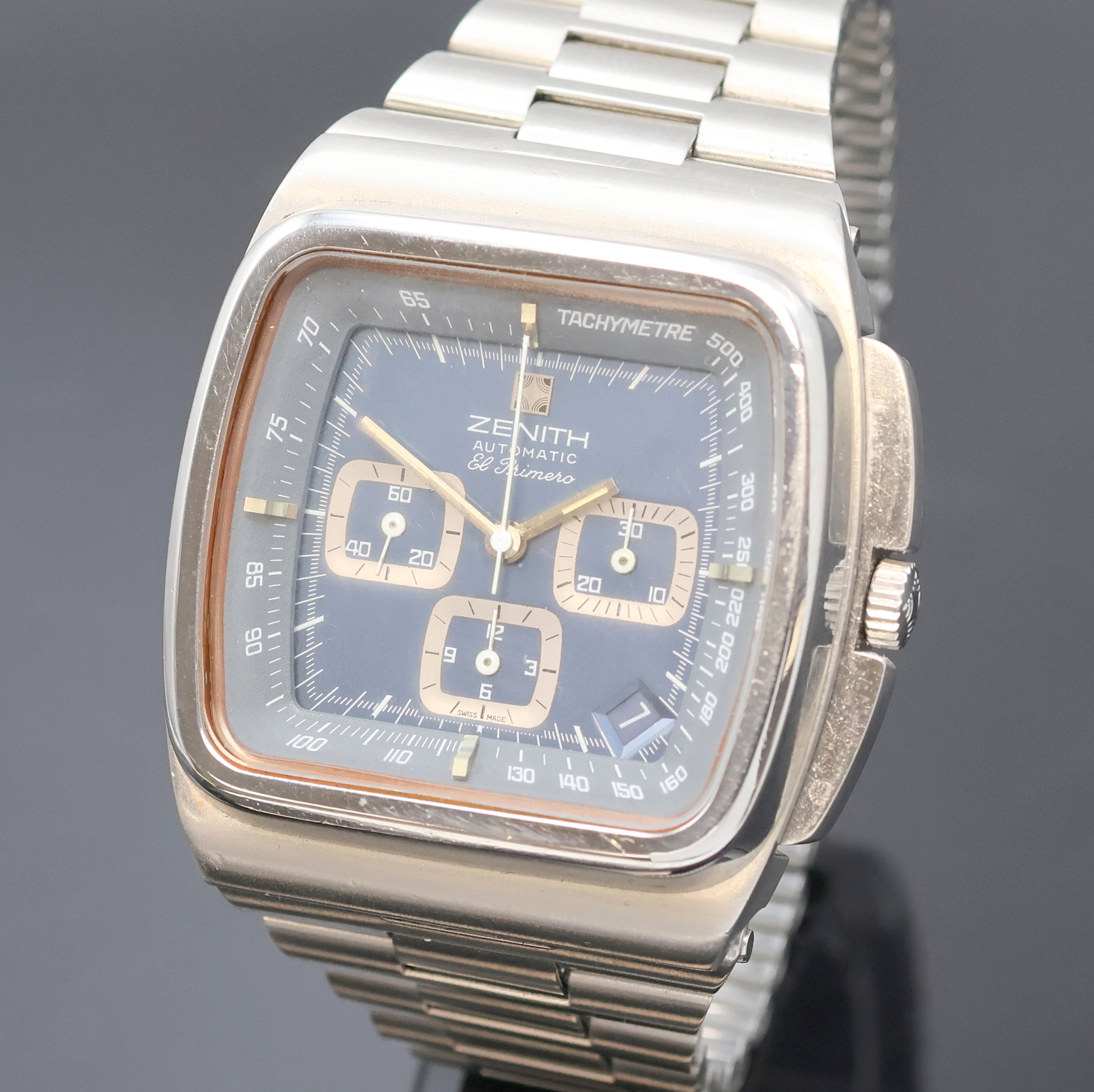 ZENITH El Primero TV-Screen Armbandchronograph Referenz 01-0200-415 in Stahl, Schweiz um 1975, Automatik, verschr. Geh. m. integr. Band m. Faltschl., Wippen-Drücker f. Chrono- Funktion, blaues Zifferbl., Datum b. 5, Leuchtzeiger, Hilfsbl. f. Std.- u. Min.- Zähler, kl. Sek. b. 9, Tachymeterskala, Kal. 3019PHC, 31 St., Feinreg., M. ca. 44 x 40 mm, L. 19 cm, 2 zus. Bandelemente anbei, Überh. empf., EZ 2-3, aus Sammlungsauflösung