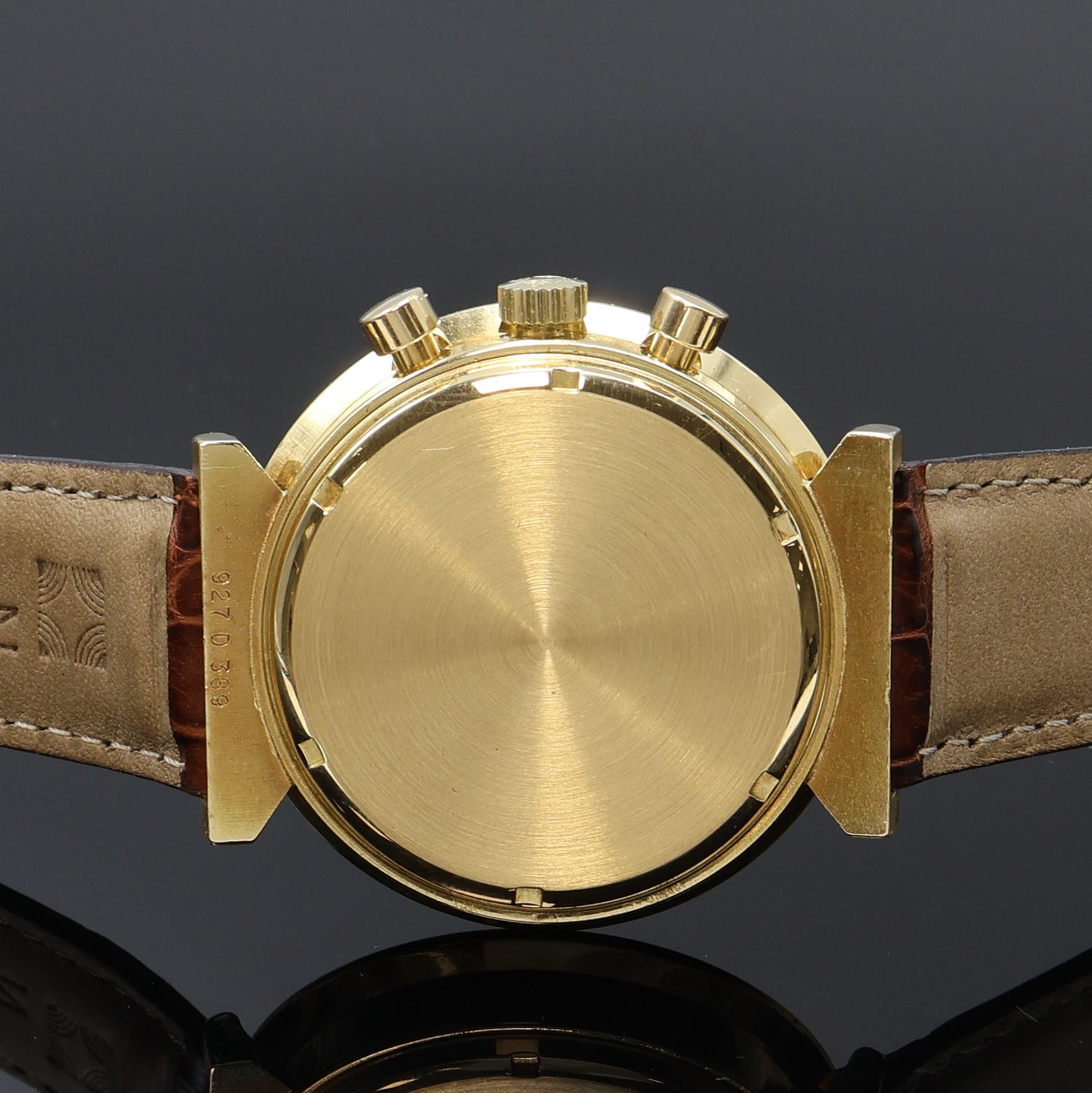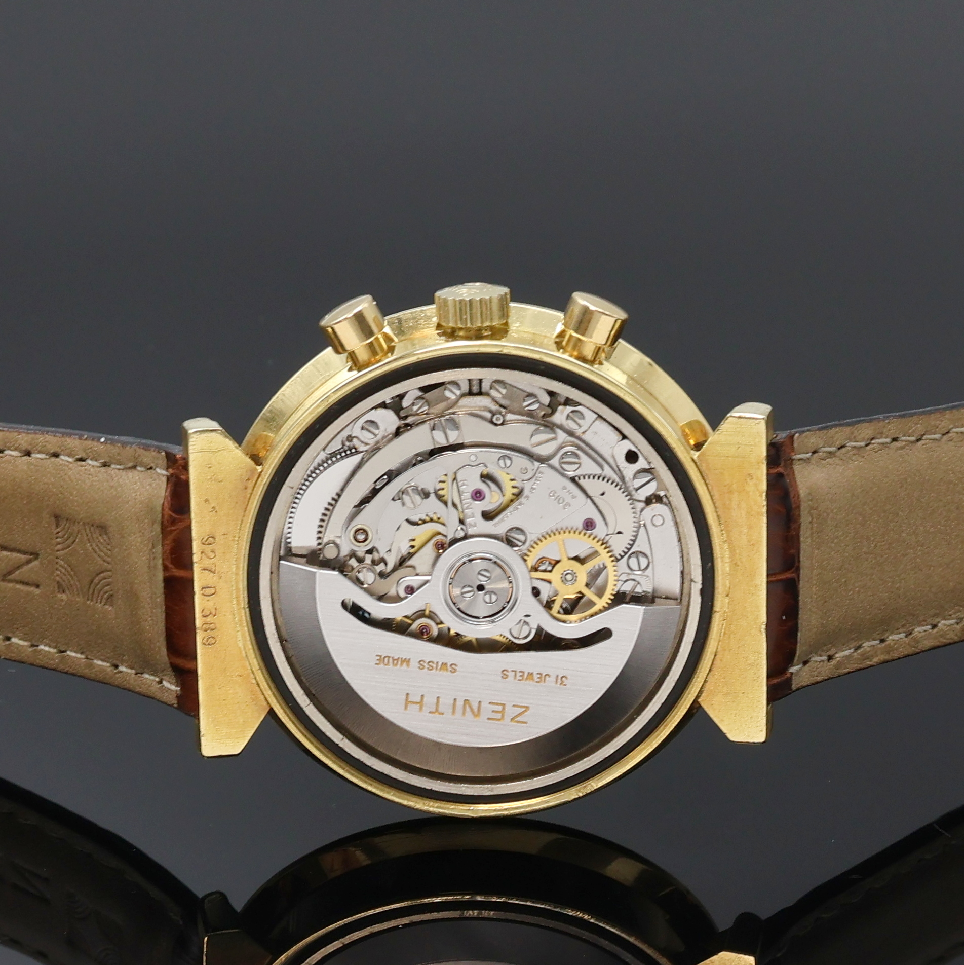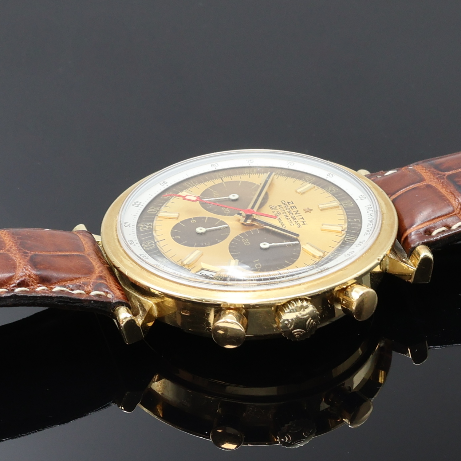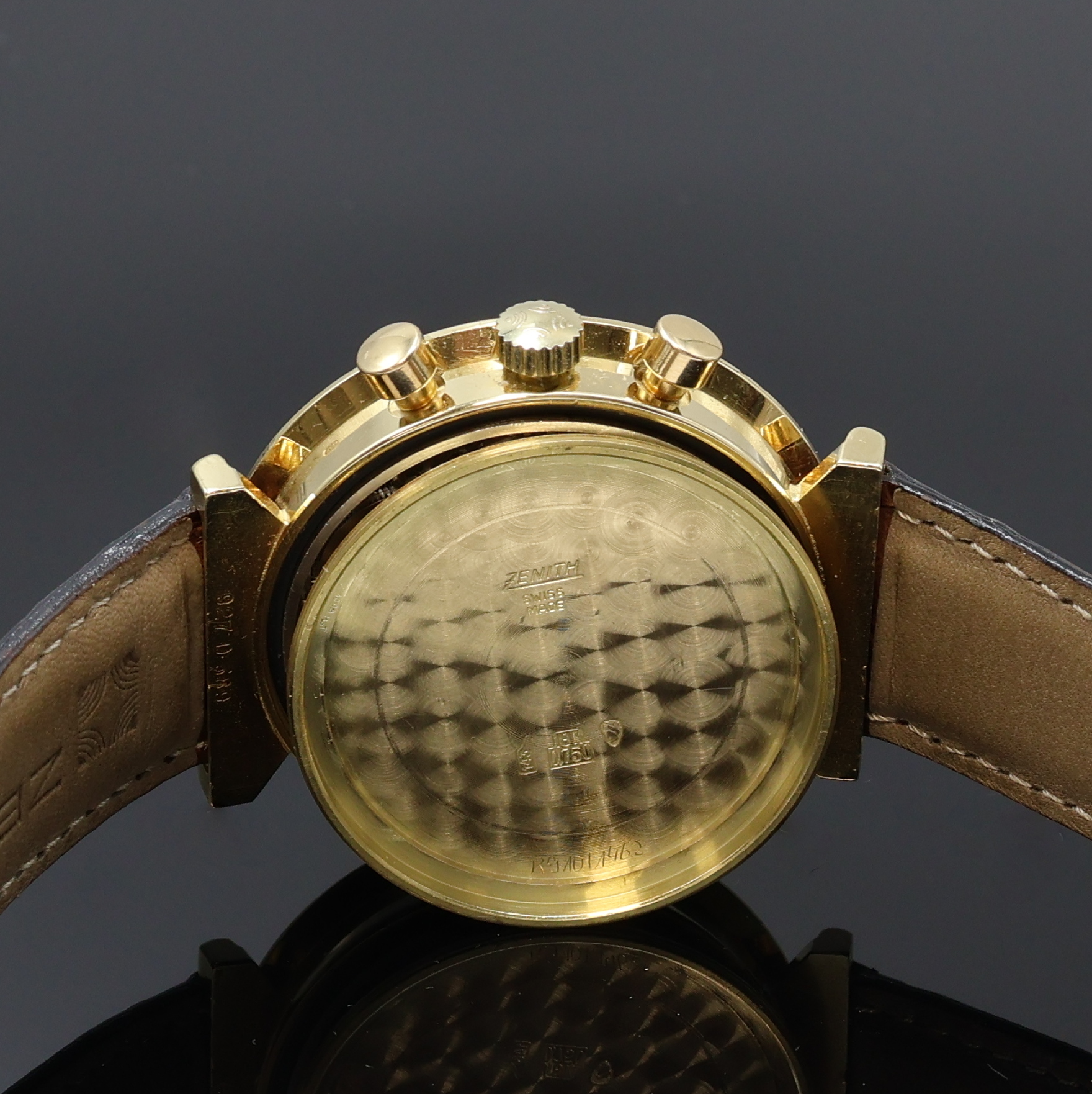 ZENITH seltener Armbandchronograph El Primero in GG 750/000, Schweiz um 1970, Automatik, in geringer Stückzahl gefertigt, Boden geschr., orig. Zenith Lederband m. verg. Dornschl., aufw. farbl. diff. Zifferbl. m. Tachymeteraußenskala, 30 Min.- u. 12 Std.- Stoppz., kl. Sek. b. 9, Datum zw. 4 u. 5, Schnellschwinger, 31 St., Kal. 3019PHC, Incabl.-Stoßs., D. ca. 40 mm, Wempe Servicenachweis in Kopie v. 01/2026 anbei, EZ 2, aus Sammlungsauflösung