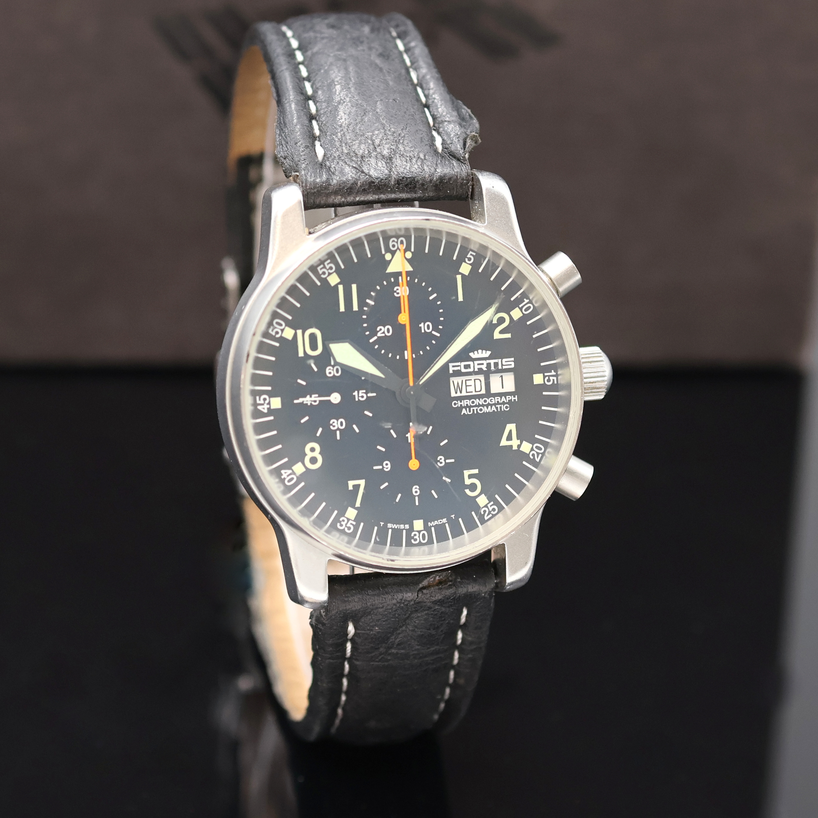 Leuchtzeiger, 12 Std.- u. 30 Min.-Zähler, kl. Sek., Tag u. Datum b. 3, rhod. Werk
